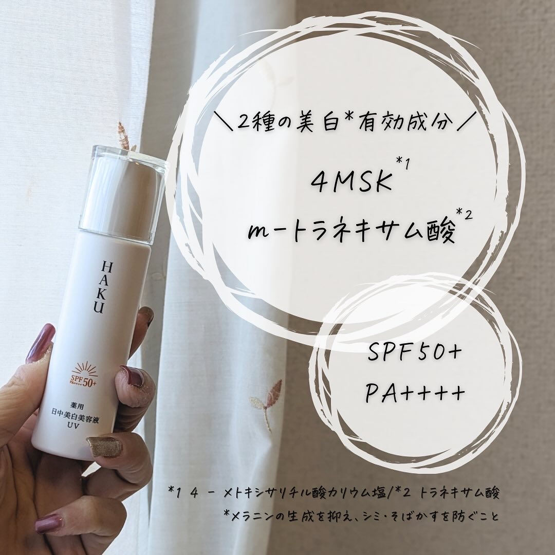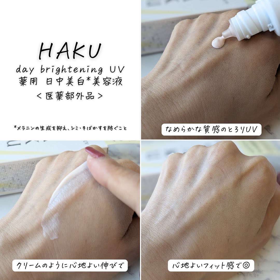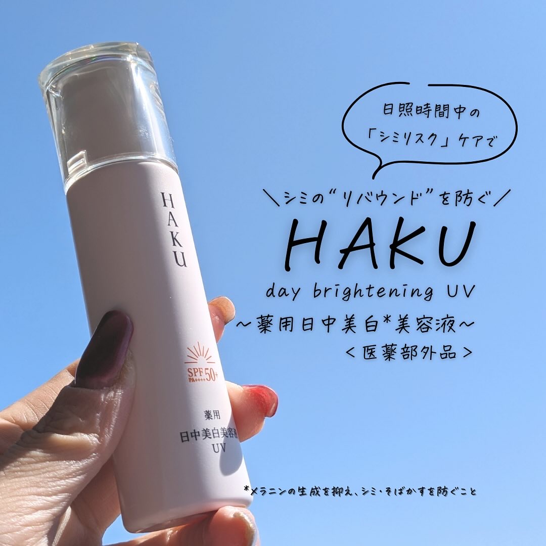 - 【医薬部外品】 (HAKU デイブライトニングUV) SPF50+・PA++++ シミができる日中環境のメラニン生成ルートに着目。 シミ予防研究の先端技術を搭載。 日中の「シミリスク」から守る徹底したケアによる肌管理。肌奥まで届け効かせる2種の美白有効成分がメラニンの生成を抑え、シミ・そばかすを防ぐ、日中の「シミリスク」ケア。 薬用 日中美白美容液UV。 「美発光肌」で輝き続ける。 乾燥による小ジワを目立たなくします。(効能評価試験済み) みずみずしく広がりしっとりなめらかな使用感