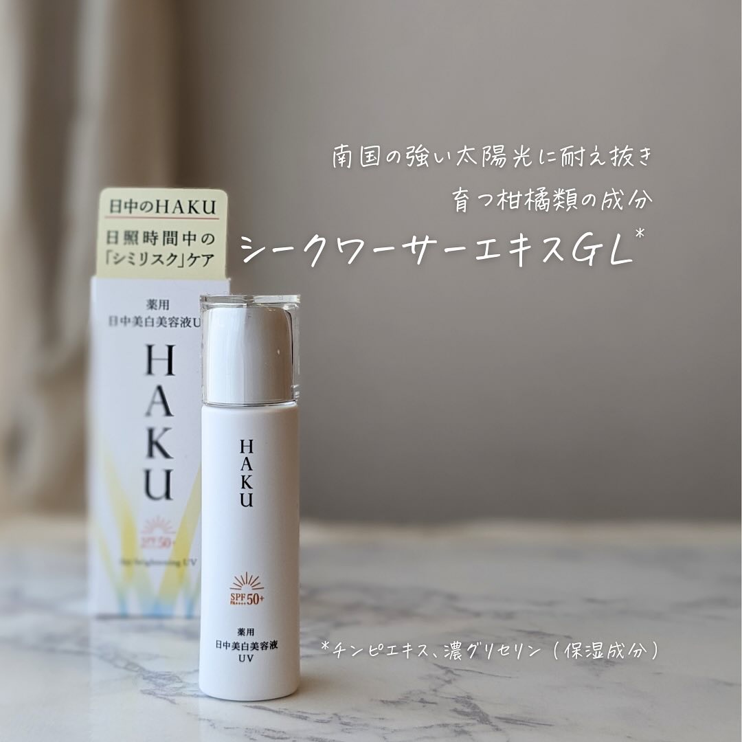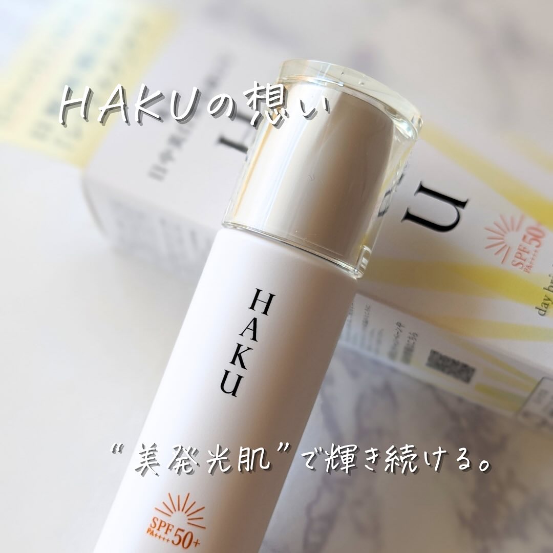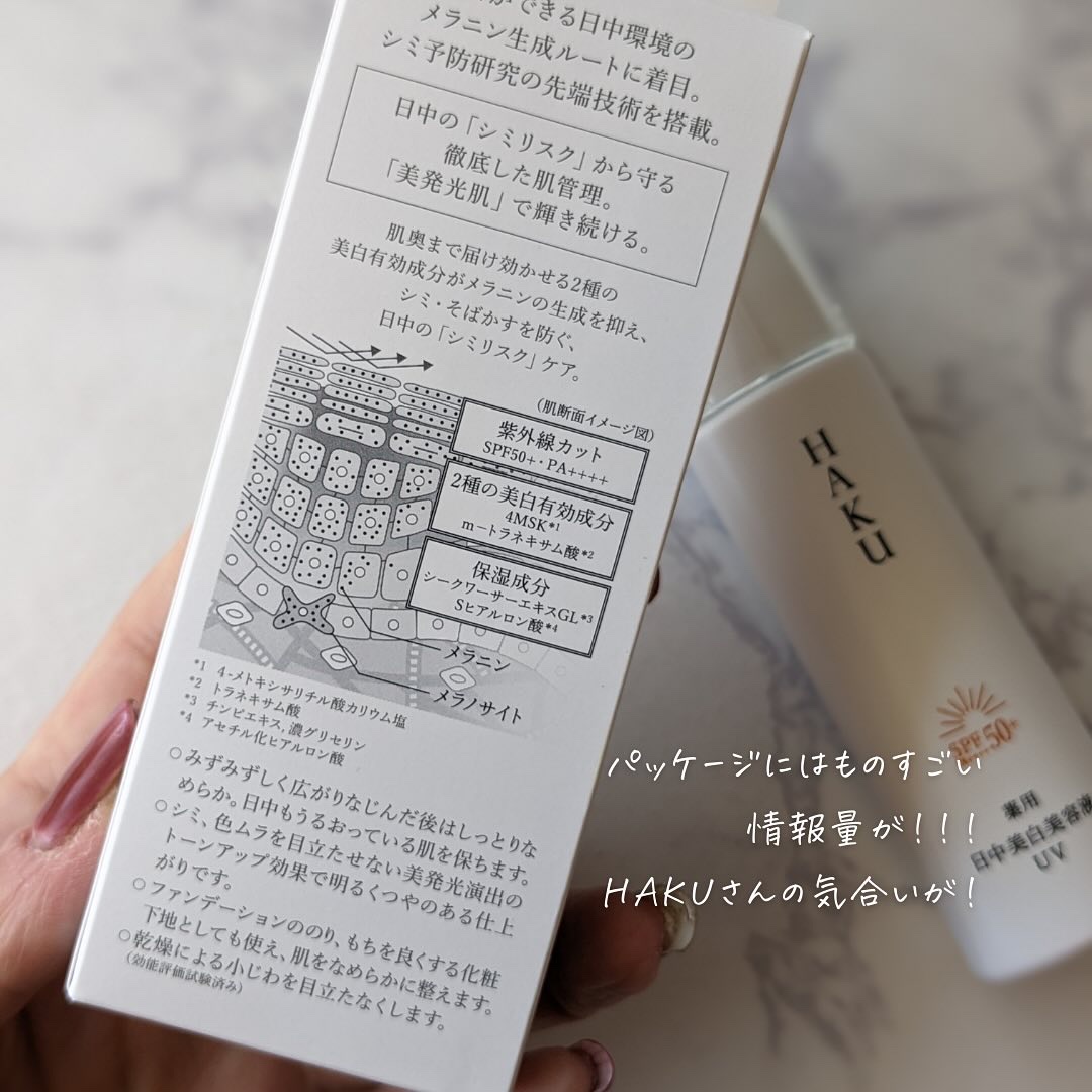- 【医薬部外品】 (HAKU デイブライトニングUV) SPF50+・PA++++ シミができる日中環境のメラニン生成ルートに着目。 シミ予防研究の先端技術を搭載。 日中の「シミリスク」から守る徹底したケアによる肌管理。肌奥まで届け効かせる2種の美白有効成分がメラニンの生成を抑え、シミ・そばかすを防ぐ、日中の「シミリスク」ケア。 薬用 日中美白美容液UV。 「美発光肌」で輝き続ける。 乾燥による小ジワを目立たなくします。(効能評価試験済み) みずみずしく広がりしっとりなめらかな使用感