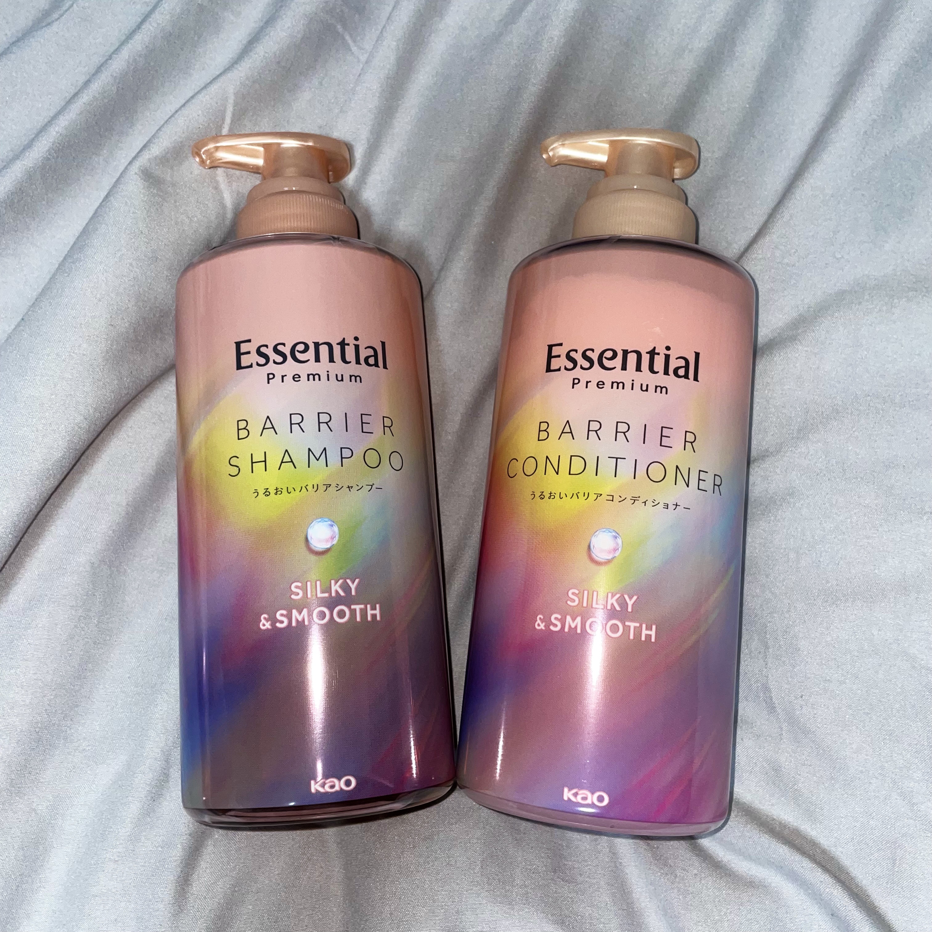 エッセンシャルプレミアムバリアシャンプー・コンディショナーシルキー&スムース〈説明〉・シャンプー・コンディショナー・450ml(両方とも)〈感想〉ホワイトピーチ&ムスクの香りは良い匂いで良かったです。シャンプーの洗浄力には私的には満足しました...
