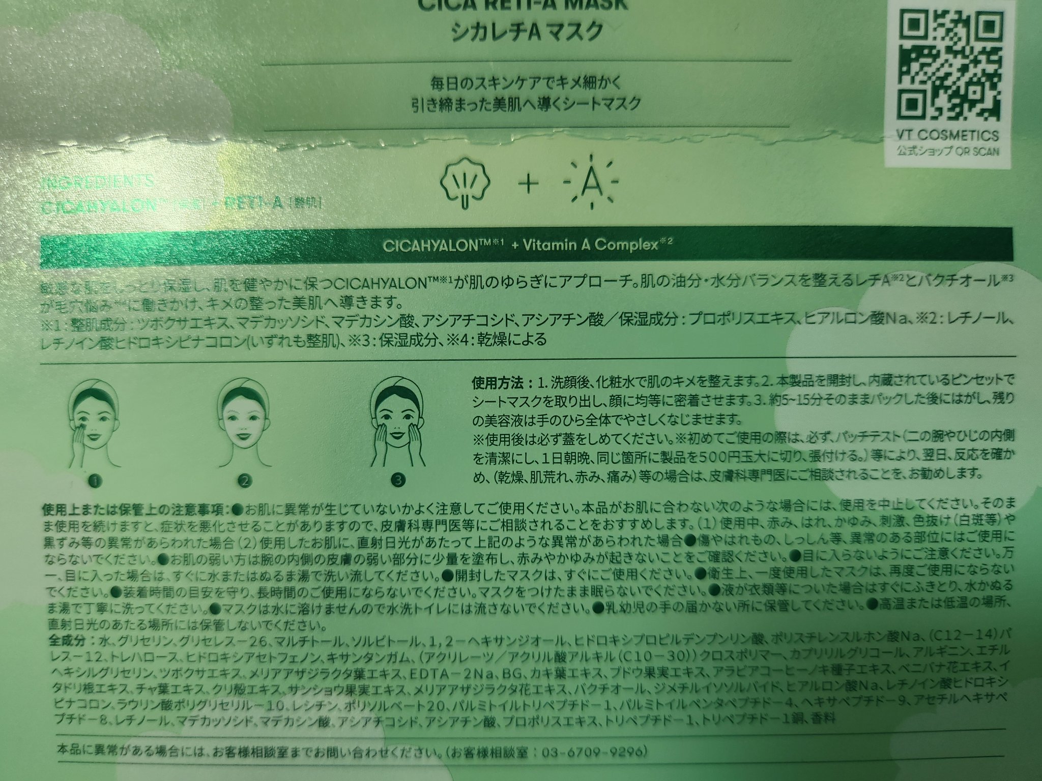 VT シカレチAマスクは、肌のターンオーバーを促し、毛穴の目立たないなめらかな肌へと導くシートマスク。 レチノール誘導体配合で、肌のハリや弾力をサポートし、年齢を感じさせない肌へ導きます。 シカ成分配合で、肌を鎮静し、健やかな肌へと導きます。 ヴィーガンシートは、肌に優しく、美容成分をたっぷり届けます。 毛穴の開きや黒ずみなど、毛穴の悩みをケアします。