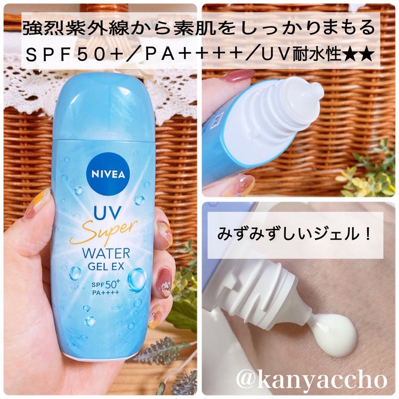 ニベアUVスーパーウォータージェル EXとってもみずみずしいジェルでのびがよくてお気に入り☀️ベタつく暑い日もさらっと濡れるので塗り直しにもいい!SPF50+PA++++でこの使用感は嬉しいです❣️香りもすっきり華やか🌼顔、身体用なので全身使...