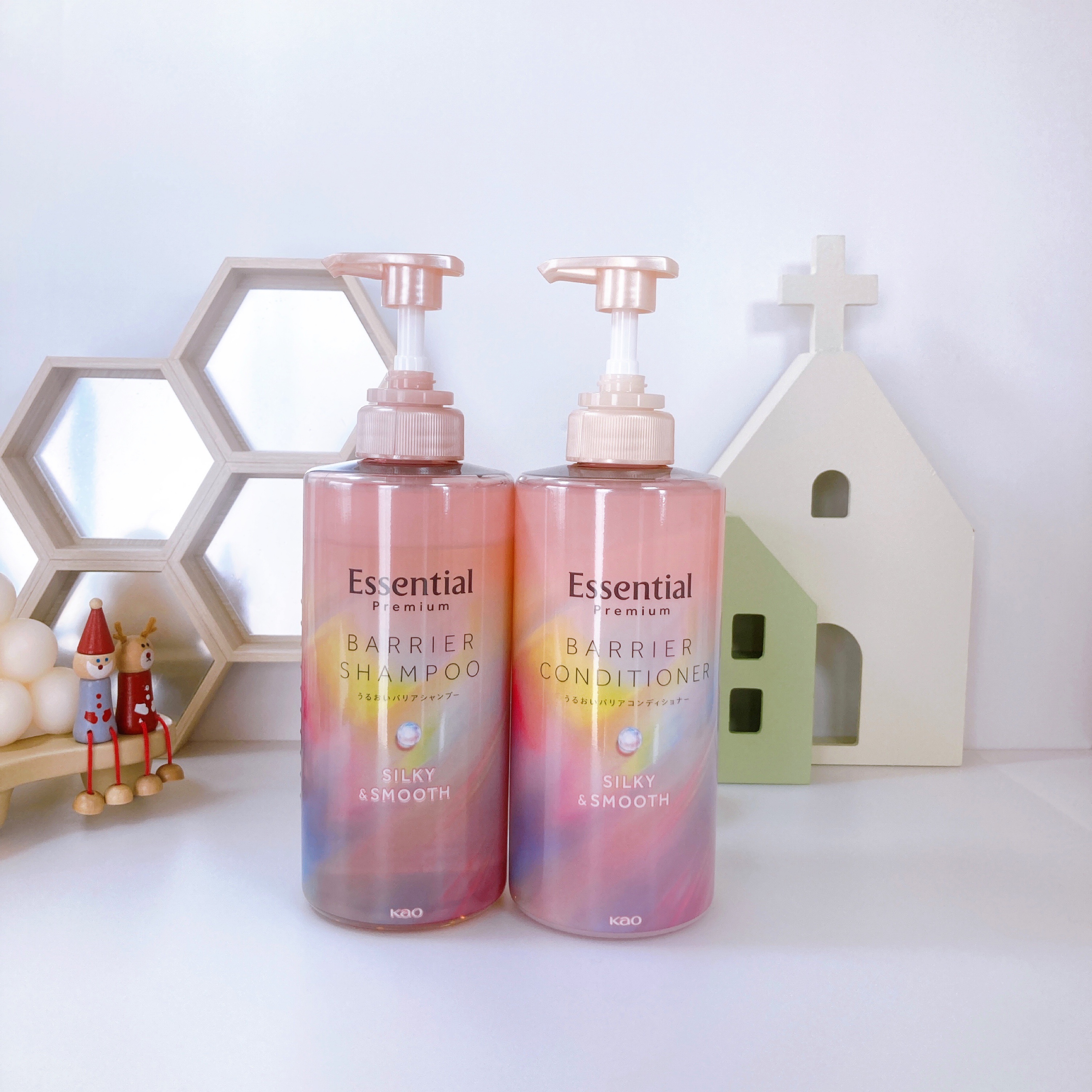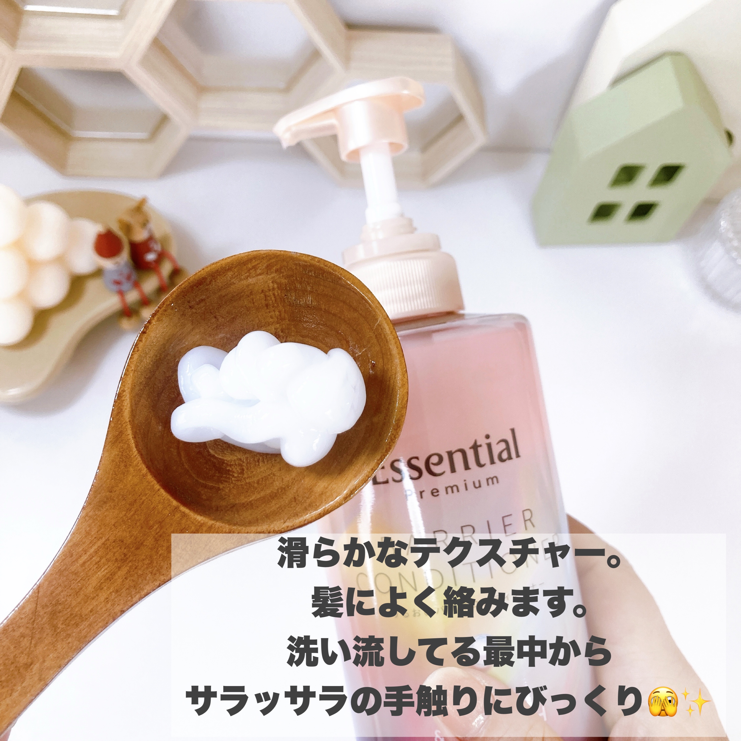エッセンシャルプレミアムバリアシャンプー・コンディショナーシルキー&スムース〈説明〉・シャンプー・コンディショナー・450ml(両方とも)〈感想〉ホワイトピーチ&ムスクの香りは良い匂いで良かったです。シャンプーの洗浄力には私的には満足しました...