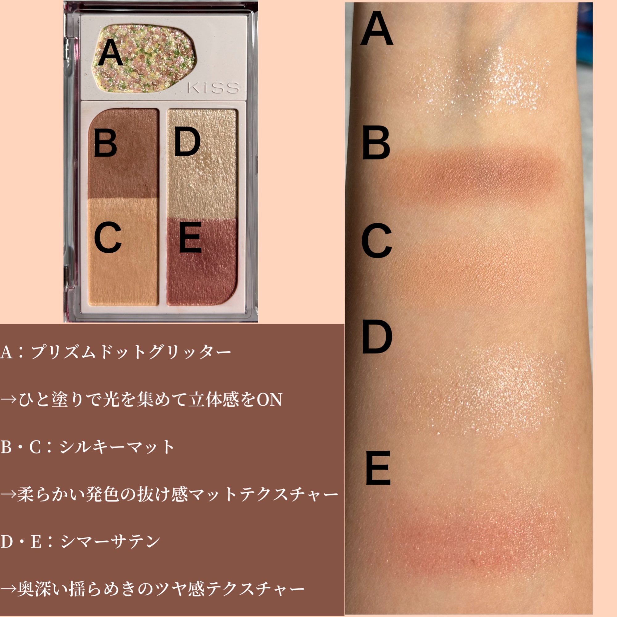 KiSSカクテルデイズ03ピンキーデライトカラーや質感を混ぜて好きな色が作れるアイパレ!左側はシマーサテンできらきらつやつやカラー、右側はシルキーマットで柔らかな発色の透け感マット。上下に仕切りがないのは色を混ぜて使うためだよ!最近アイシャド...