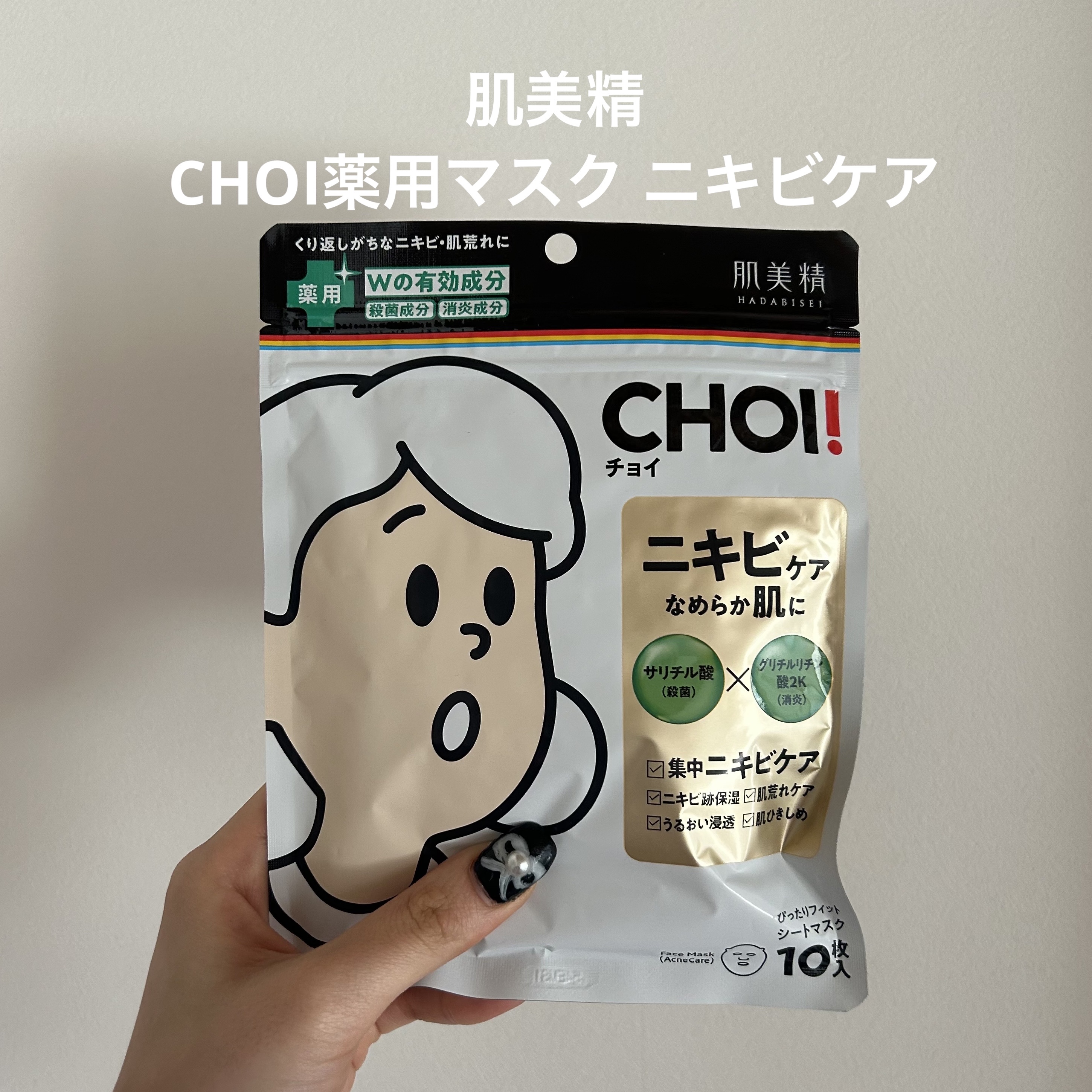 肌美精🌱CHOI薬用マスクニキビケア[医薬部外品]通常版10枚 ¥824公式サイトから引用させて頂きます。●殺菌成分「サリチル酸」&消炎成分「グリチルリチン酸2K」配合●ひきしめ保湿成分「ビタミンハーブCP」&保湿成分「緑茶エキス」配合。肌・...