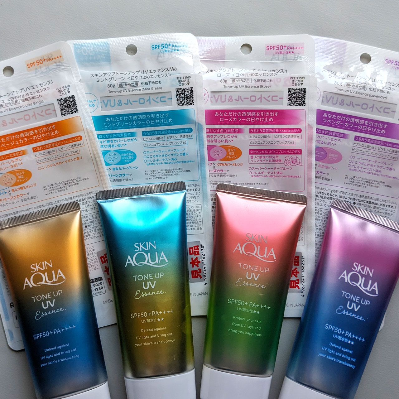 - ※カラー名称「ハピネスオーラ」は「ローズ」へ名称変更となりました。 <ミントグリーン> 赤み補正*1!UVカットしながら、色と光をコントロールし、肌をトーンアップ*1。 ミントグリーンカラーで透き通るような素肌つづく!エッセンスタイプの日焼け止め。 透明感*1のある肌に。 SPF50+、PA++++、UV耐水性★★。 鉱物油フリー。パラベンフリー。ときめくサボンの香り。 <ラベンダー> 明るさ補正*1!UVカットしながら、色と光をコントロールし、肌をトーンアップ*1。 透明感*1を引き出すラベンダーカラーの日焼け止め。 すーっとのびて、みずみずしい使い心地のエッセンスタイプ。 SPF50+、PA++++、UV耐水性★★。 鉱物油フリー。パラベンフリー。ときめくサボンの香り。 <ローズ> 血色感補正*1!UVカットしながら、色と光をコントロールし、肌をトーンアップ*1。 ローズカラーで血色をプラスし、透明感*1のある肌に。 エッセンスタイプの日焼け止め。 SPF50+、PA++++、UV耐水性★★。 パラベンフリー。ハピネスブロッサムの香り。 <ブルー> UVカットしながら、色と光をコントロールし、肌をトーンアップ*1。 血色感を抑えて儚げな色白肌*1に見せるブルーカラーの顔・からだ用日やけ止め。すーっとのびて、みずみずしい使い心地。 透明感ブルー×透明感ホワイト=はかなげブルーカラーで、自分史上最高*2の色白肌*1、うるおう美容液成分(うるおい成分)としてヒアルロン酸Na、ビタミンC誘導体*3配合。 SPF50+/PA++++。こころがときめくサボンの香り。化粧下地にも。石けんで落とせます。 パラベンフリー。鉱物油フリー。アレルギーテスト済み(全ての方にアレルギーが起こらないというわけではありません)。 *1:メイクアップ効果による *2:スキンアクアシリーズにおいて *3:リン酸アスコルビルMg(うるおい成分)