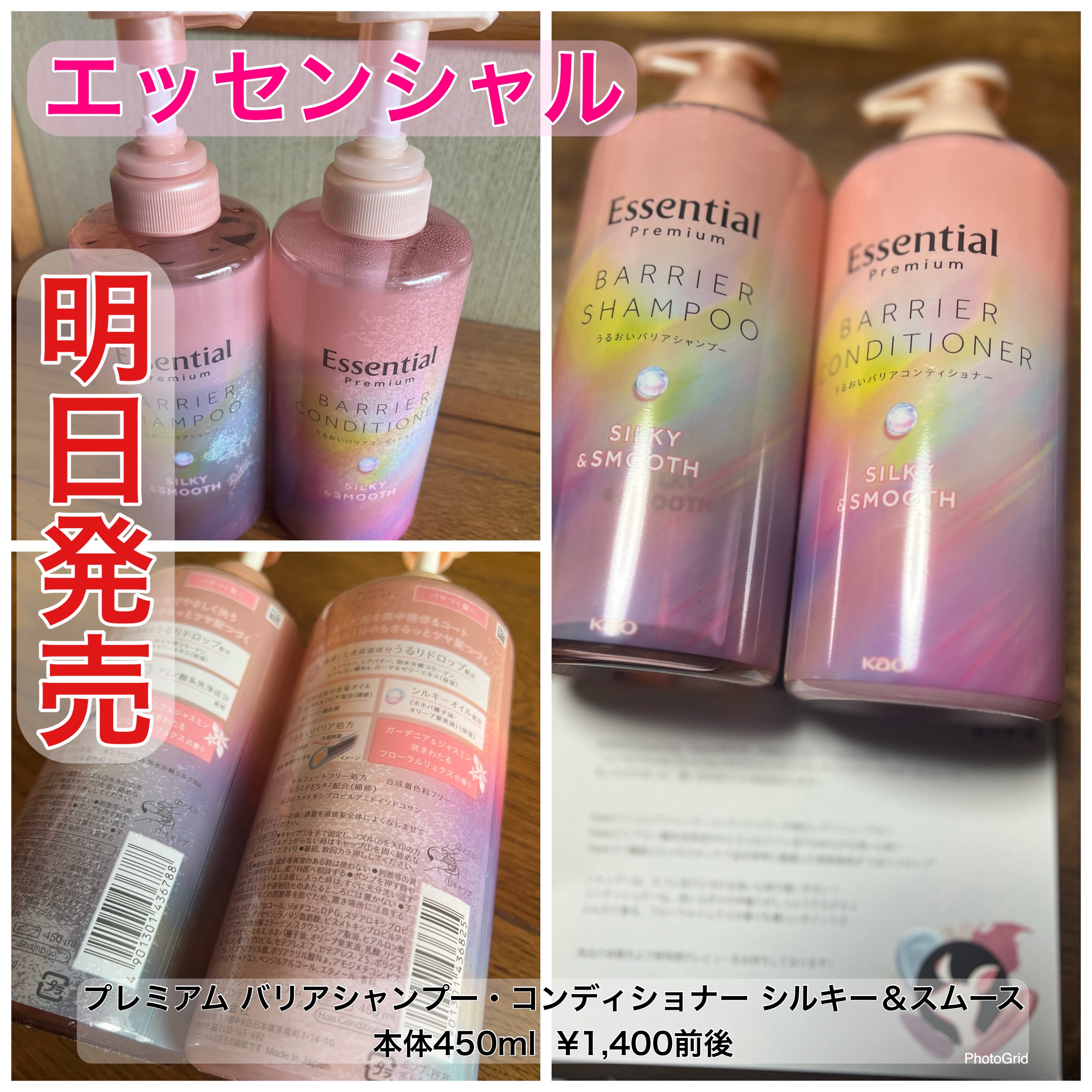 エッセンシャルプレミアムバリアシャンプー・コンディショナーシルキー&スムース〈説明〉・シャンプー・コンディショナー・450ml(両方とも)〈感想〉ホワイトピーチ&ムスクの香りは良い匂いで良かったです。シャンプーの洗浄力には私的には満足しました...