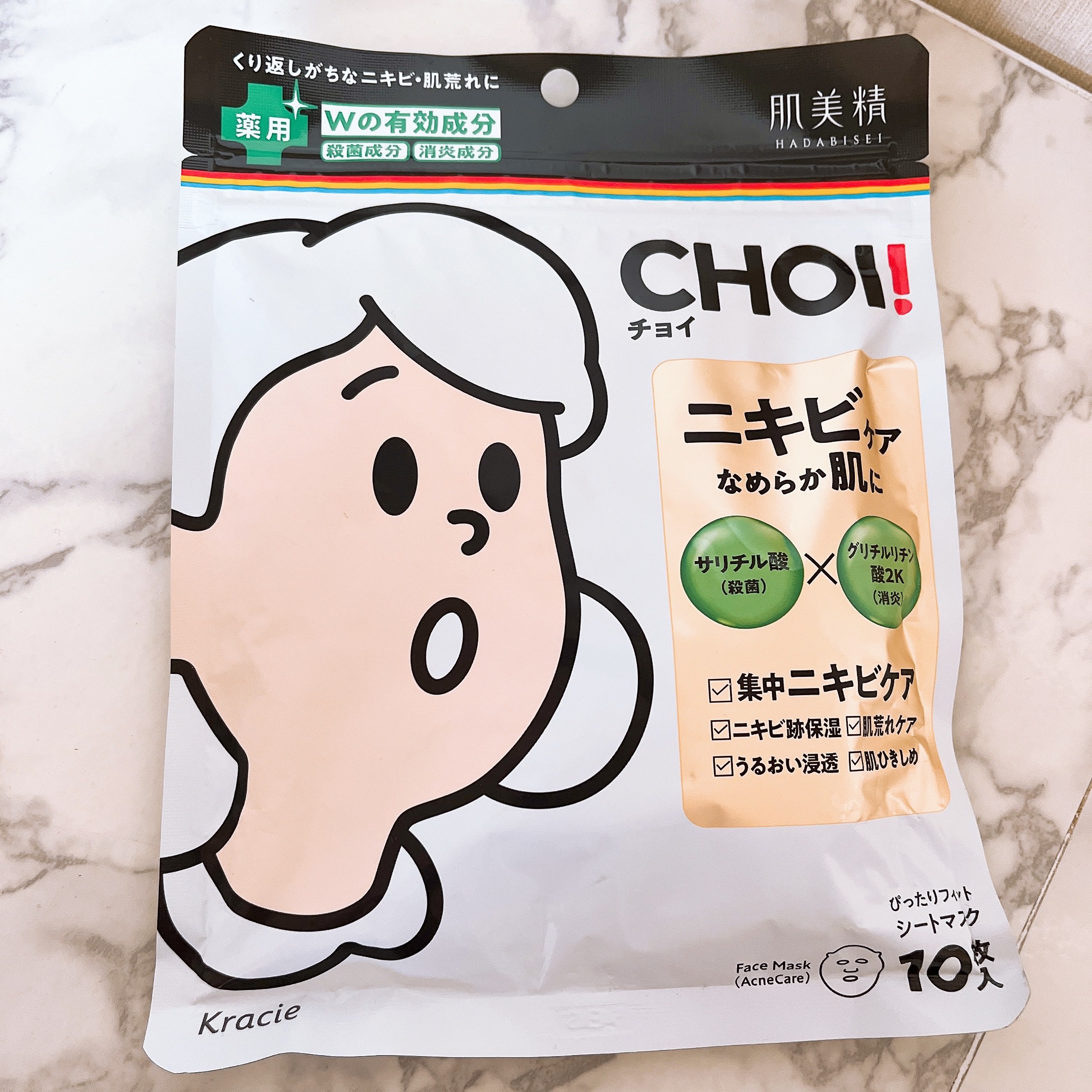 - 【医薬部外品】 ●チョイッと手軽にニキビ悩みを集中ケア!肌美精CHOIシリーズ ニキビケアライン ●くり返しがちなニキビ・肌荒れに。Wの有効成分(殺菌&消炎)配合の薬用処方で、ニキビを予防してニキビの出来にくいなめらか肌へ。 ●5分*1の集中ケアの薬用シートマスク ●殺菌成分「サリチル酸」&消炎成分「グリチルリチン酸2K」配合 ●ひきしめ保湿成分「ビタミンハーブCP*2」&保湿成分「緑茶エキス」配合。肌をキュッとひきしめ、ニキビ跡にもうるおいを補給します。 ●ぴったりフィットシート形状&浸透サポート成分*3配合で、気になるところもしっかり密着してうるおいます。 ●みずみずしい浸透美容液 ●無香料、無着色 ●アレルギーテスト済み*4、ノンコメドジェニックテスト済み*4 *1:お手入れの目安時間 *2:ビタミンC誘導体(硫酸アスコルビル2Na)、カモミール、セージ、アロエ CP:Complex *3:シクロヘキサンジカルボン酸ビスエトキシジグリコール *4:全ての方にアレルギーが起こらない、コメド(ニキビのもと)ができないということではありません。 ※浸透:角質層まで