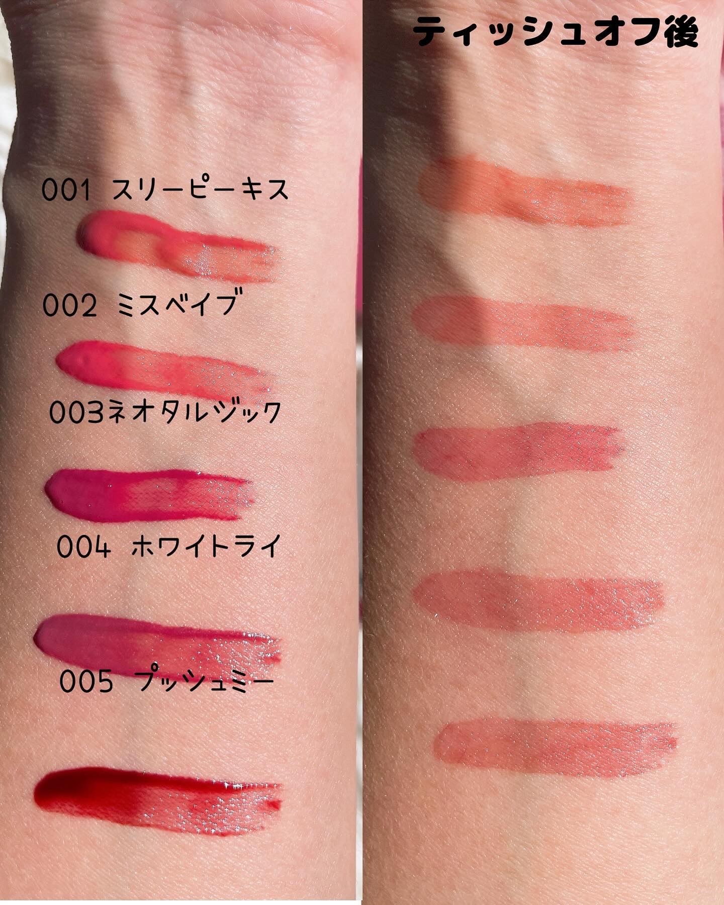 塗った直後はつやんつやん♡ ティントだからそのままの色が定着して 長時間続くよ。 さらっと軽い塗り心地でべたつかず しっとり潤う仕上がりになるところが◎ 保湿美容液成分 ハチミツ•ヒアルロン酸•ローズマリー葉 エキス配合