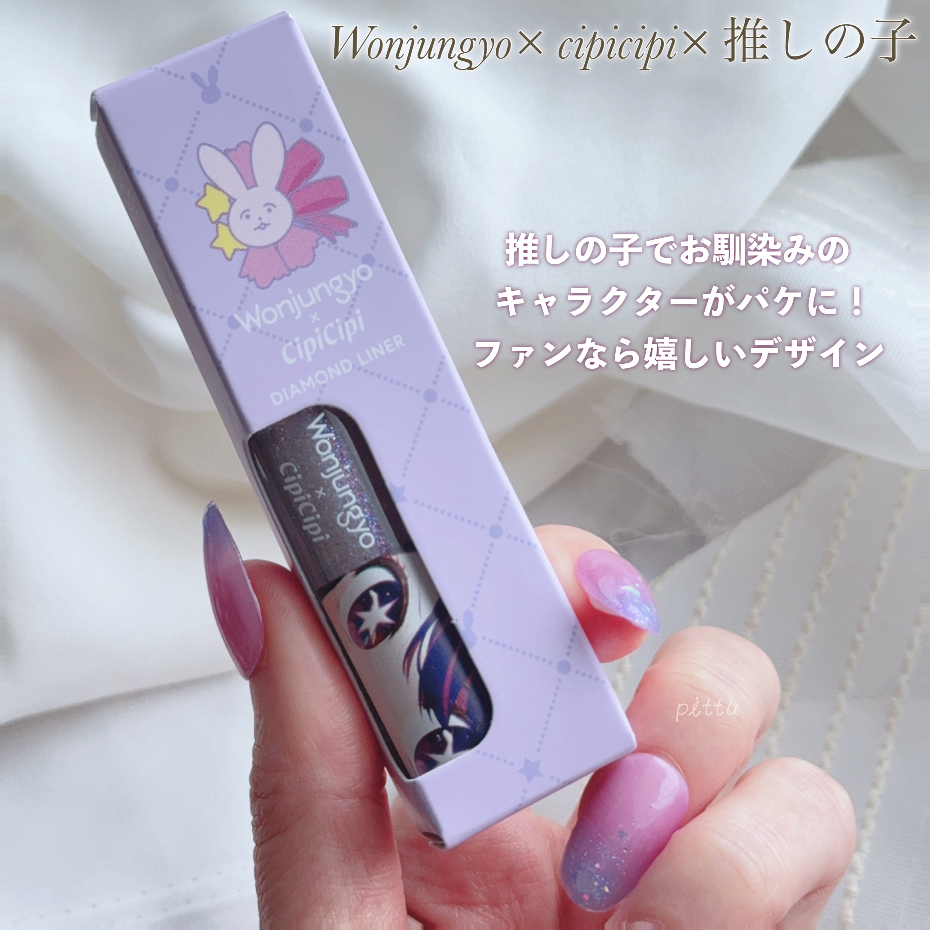 シルバーパールがきらめくアイドルラベンダーカラー シルバー、紫、青、黄、緑 大小様々な多色ラメがとても綺麗 のせすぎないために点のせするのが好み 下まぶた 黒目下あたりに極細でのせると動きでチラチラみえて綺麗でした 推しの子 コラボ #胸キュンコスメ特集