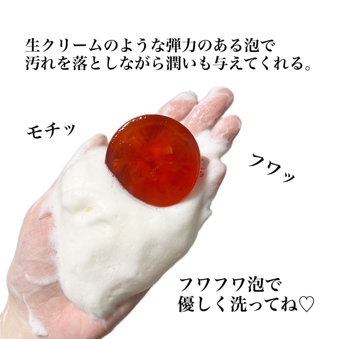 美しい、ルビーのように輝くこちらを見かけてからどんな石鹸なんだろう? ふうわりとした上品な香り。今までにない、ねっとりしたような細やかなメレンゲのような泡立ち! 石鹸に含まれる美容成分はアスタキサンチンをはじめ、CICA(ツボクサエキス) 植物エキス ハチミツ ハトムギエキス 海塩が、配合されており