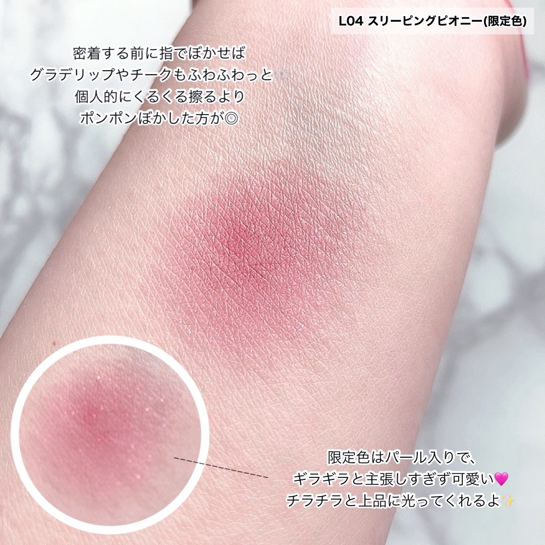 - <01 ドラジェコーラル> ジメチコン、イソドデカン、リンゴ酸ジイソステアリル、アルキル(C30-45)ジメチルシリルポリプロピルシルセスキオキサン、ジメチコンクロスポリマー、(VP/ヘキサデセン)コポリマー、(ビニルジメチコン/メチコンシルセスキオキサン)クロスポリマー、セチルPEG/PPG-10/1ジメチコン、カニナバラ果実油、ラウロイルグルタミン酸ジ(オクチルドデシル/フィトステリル/ベヘニル)、月見草油、ローヤルゼリーエキス、フェノキシエタノール、水酸化Al、トコフェロール、ヒマシ油、スクワラン、酸化チタン、酸化鉄、黄4、赤202、青1、橙201 <02 エターナルフィグ> ジメチコン、イソドデカン、リンゴ酸ジイソステアリル、アルキル(C30-45)ジメチルシリルポリプロピルシルセスキオキサン、ジメチコンクロスポリマー、(VP/ヘキサデセン)コポリマー、(ビニルジメチコン/メチコンシルセスキオキサン)クロスポリマー、セチルPEG/PPG-10/1ジメチコン、カニナバラ果実油、ラウロイルグルタミン酸ジ(オクチルドデシル/フィトステリル/ベヘニル)、月見草油、ローヤルゼリーエキス、フェノキシエタノール、水酸化Al、トコフェロール、ヒマシ油、スクワラン、酸化チタン、酸化鉄、黄4、赤202、青1、橙201 <03 プリエベージュ> ジメチコン、イソドデカン、リンゴ酸ジイソステアリル、アルキル(C30-45)ジメチルシリルポリプロピルシルセスキオキサン、ジメチコンクロスポリマー、(VP/ヘキサデセン)コポリマー、(ビニルジメチコン/メチコンシルセスキオキサン)クロスポリマー、セチルPEG/PPG-10/1ジメチコン、カニナバラ果実油、ラウロイルグルタミン酸ジ(オクチルドデシル/フィトステリル/ベヘニル)、月見草油、ローヤルゼリーエキス、フェノキシエタノール、水酸化Al、トコフェロール、ヒマシ油、スクワラン、酸化チタン、酸化鉄、黄4、赤202、青1、橙201 <04 ジゼルバーガンディ> ジメチコン、リンゴ酸ジイソステアリル、イソドデカン、アルキル(C30-45)ジメチルシリルポリプロピルシルセスキオキサン、ジメチコンクロスポリマー、(VP/ヘキサデセン)コポリマー、(ビニルジメチコン/メチコンシルセスキオキサン)クロスポリマー、セチルPEG/PPG-10/1ジメチコン、カニナバラ果実油、ラウロイルグルタミン酸ジ(オクチルドデシル/フィトステリル/ベヘニル)、月見草油、ローヤルゼリーエキス、フェノキシエタノール、トコフェロール、水酸化Al、ヒマシ油、スクワラン、酸化鉄、酸化チタン、黄4、赤202、青1、橙201 <L01 チュチュアプリコット> ジメチコン、イソドデカン、リンゴ酸ジイソステアリル、アルキル(C30-45)ジメチルシリルポリプロピルシルセスキオキサン、ジメチコンクロスポリマー、(VP/ヘキサデセン)コポリマー、(ビニルジメチコン/メチコンシルセスキオキサン)クロスポリマー、セチルPEG/PPG-10/1ジメチコン、カニナバラ果実油、ラウロイルグルタミン酸ジ(オクチルドデシル/フィトステリル/ベヘニル)、月見草油、ローヤルゼリーエキス、フェノキシエタノール、水酸化Al、トコフェロール、ヒマシ油、スクワラン、酸化チタン、酸化鉄、ホウケイ酸(Ca/Al)、酸化スズ、黄4、赤202、青1、橙201 <L02 パドドゥテラコッタ> ジメチコン、イソドデカン、リンゴ酸ジイソステアリル、アルキル(C30-45)ジメチルシリルポリプロピルシルセスキオキサン、ジメチコンクロスポリマー、(VP/ヘキサデセン)コポリマー、(ビニルジメチコン/メチコンシルセスキオキサン)クロスポリマー、セチルPEG/PPG-10/1ジメチコン、カニナバラ果実油、ラウロイルグルタミン酸ジ(オクチルドデシル/フィトステリル/ベヘニル)、月見草油、ローヤルゼリーエキス、フェノキシエタノール、トコフェロール、ヒマシ油、水酸化Al、スクワラン、酸化鉄、ホウケイ酸(Ca/Al)、酸化チタン、酸化スズ、黄4、赤202、青1、橙201