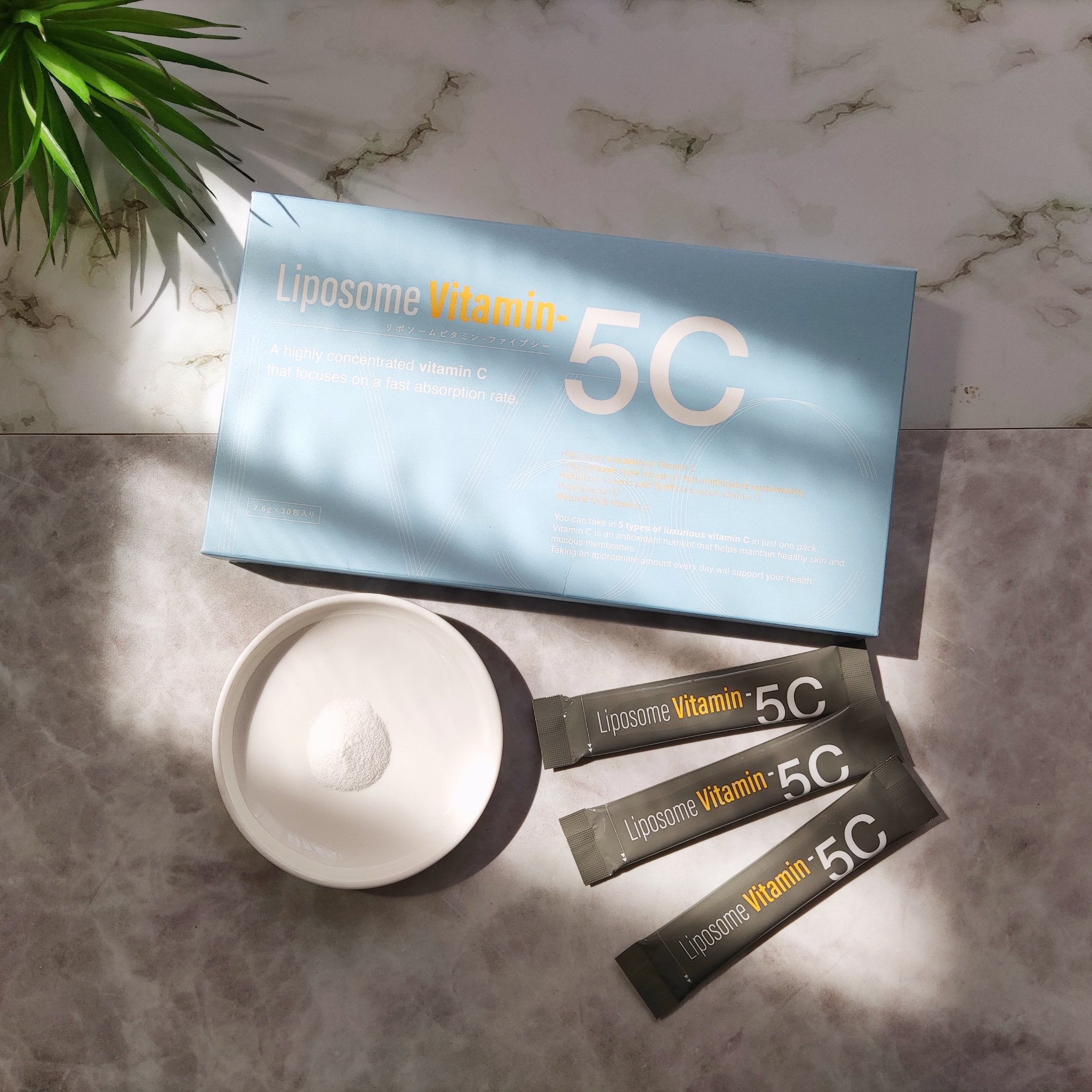 5種類のビタミンCを同時に摂ることで 体質や体調による微妙な摂取効率の変化をカバーし相乗的に摂取効率を高めることを目指した美容インナーケア商品です。 リポソーム技術により高濃度のビタミンCを効率よく体内に浸透させることが可能になったそうです。 着色料・人工甘味料・合成保存料・動物由来成分不使用一包タイプ