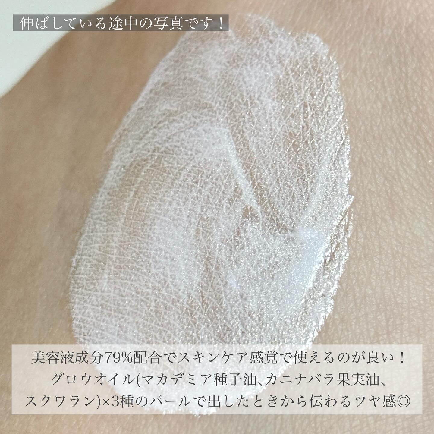 - <クリアグロウ> 水、パルミチン酸エチルヘキシル、酸化チタン、グリセリン、プロパンジオール、イソノナン酸イソトリデシル、スクワラン、酸化亜鉛、イソステアリン酸PEG-60グリセリル、ヒアルロン酸Na、水溶性コラーゲン、セラミドNG、マカデミア種子油、カニナバラ果実油、カミツレ花エキス、アロエベラ葉エキス、ソメイヨシノ葉エキス、ツボクサ葉/茎エキス、シリカ、炭酸Ca、クエン酸、クエン酸Na、ジパルミチン酸アスコルビル、PEG-100水添ヒマシ油、水酸化Al、イソステアリン酸、(アクリル酸ヒドロキシエチル/アクリロイルジメチルタウリンNa)コポリマー、フェノキシエタノール、ベヘニルアルコール、ポリヒドロキシステアリン酸、エチルヘキシルグリセリン、キサンタンガム、ポリソルベート60、イソステアリン酸ソルビタン、BG、トコフェロール、マイカ <ラベンダーグロウ> 水、パルミチン酸エチルヘキシル、酸化チタン、グリセリン、プロパンジオール、イソノナン酸イソトリデシル、スクワラン、酸化亜鉛、イソステアリン酸PEG-60グリセリル、炭酸Ca、セラミドNG、カニナバラ果実油、マカデミア種子油、ヒアルロン酸Na、ソメイヨシノ葉エキス、カミツレ花エキス、クエン酸、水溶性コラーゲン、ツボクサ葉/茎エキス、アロエベラ葉エキス、クエン酸Na、ジパルミチン酸アスコルビル、PEG-100水添ヒマシ油、水酸化Al、イソステアリン酸、(アクリル酸ヒドロキシエチル/アクリロイルジメチルタウリンNa)コポリマー、フェノキシエタノール、ベヘニルアルコール、ポリヒドロキシステアリン酸、エチルヘキシルグリセリン、キサンタンガム、ポリソルベート60、イソステアリン酸ソルビタン、BG、トコフェロール、マイカ、シリカ、グンジョウ、タルク、赤226、カオリン