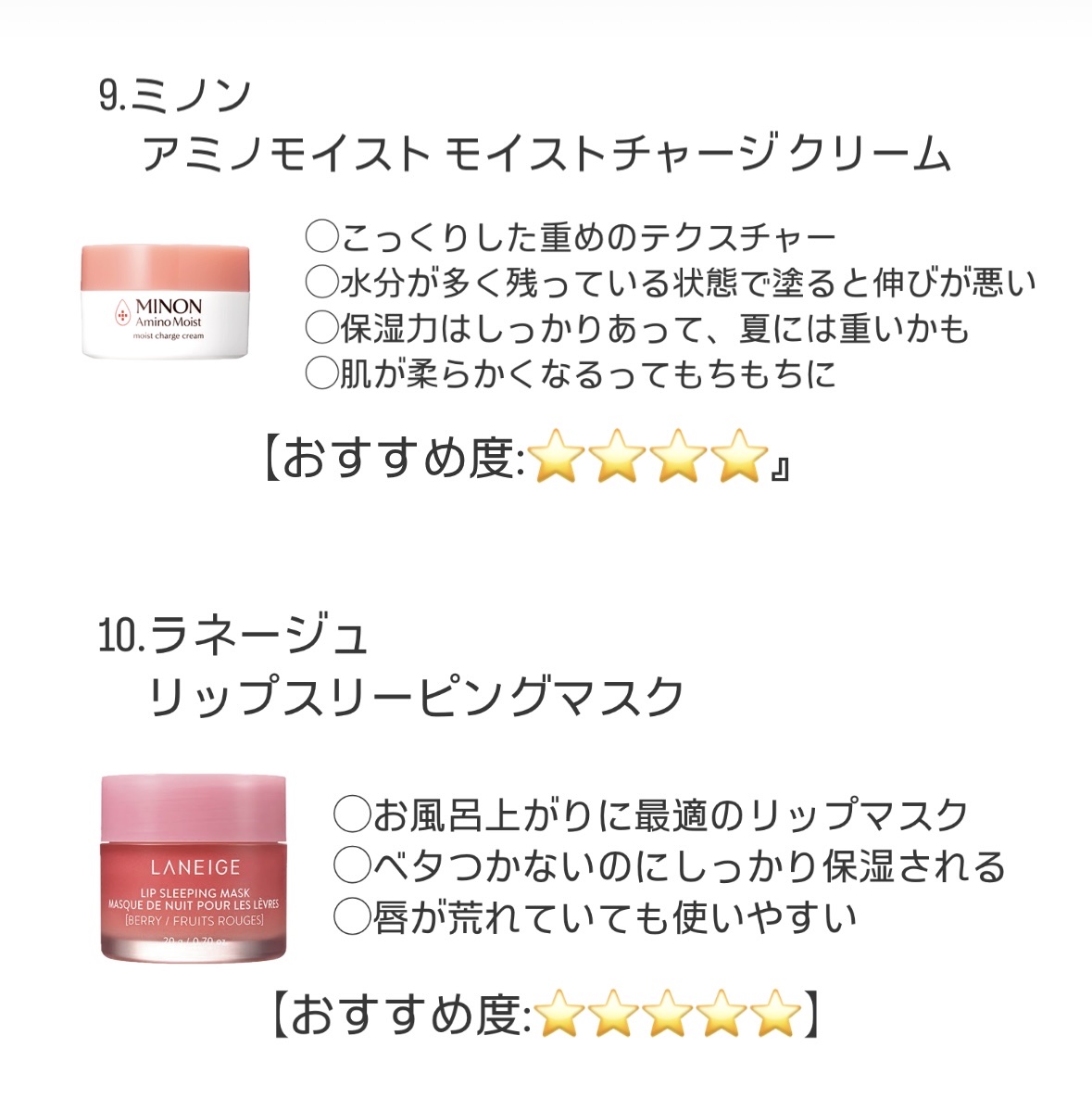 保湿力、持続力、安定力は10点満点 持続力→保湿力がどれほど保たれるか 安定力→唇の良い状態を維持できるか (塗ることで荒れたりしないか) 私はさまざまなケアアイテムを持っていますが、 今回はどのリップいつ使うかによって、 その商品の良さを1番引き出せるかを 共有させていただきました!