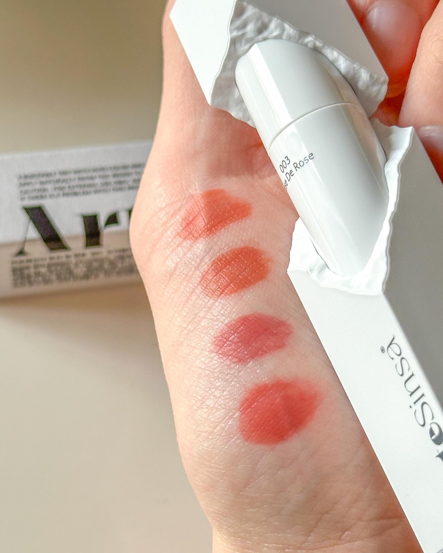 重ねるほど鮮やかに🫶発色そのまま透け感ティント🌸♡♡ArteSinsaのビルダブルデューイフィットティントをパーソナルカラー別に4色スウォッチ☺️ArteSinsaアルテシンサビルダブルデューイフィットティント001NudyRange/002...