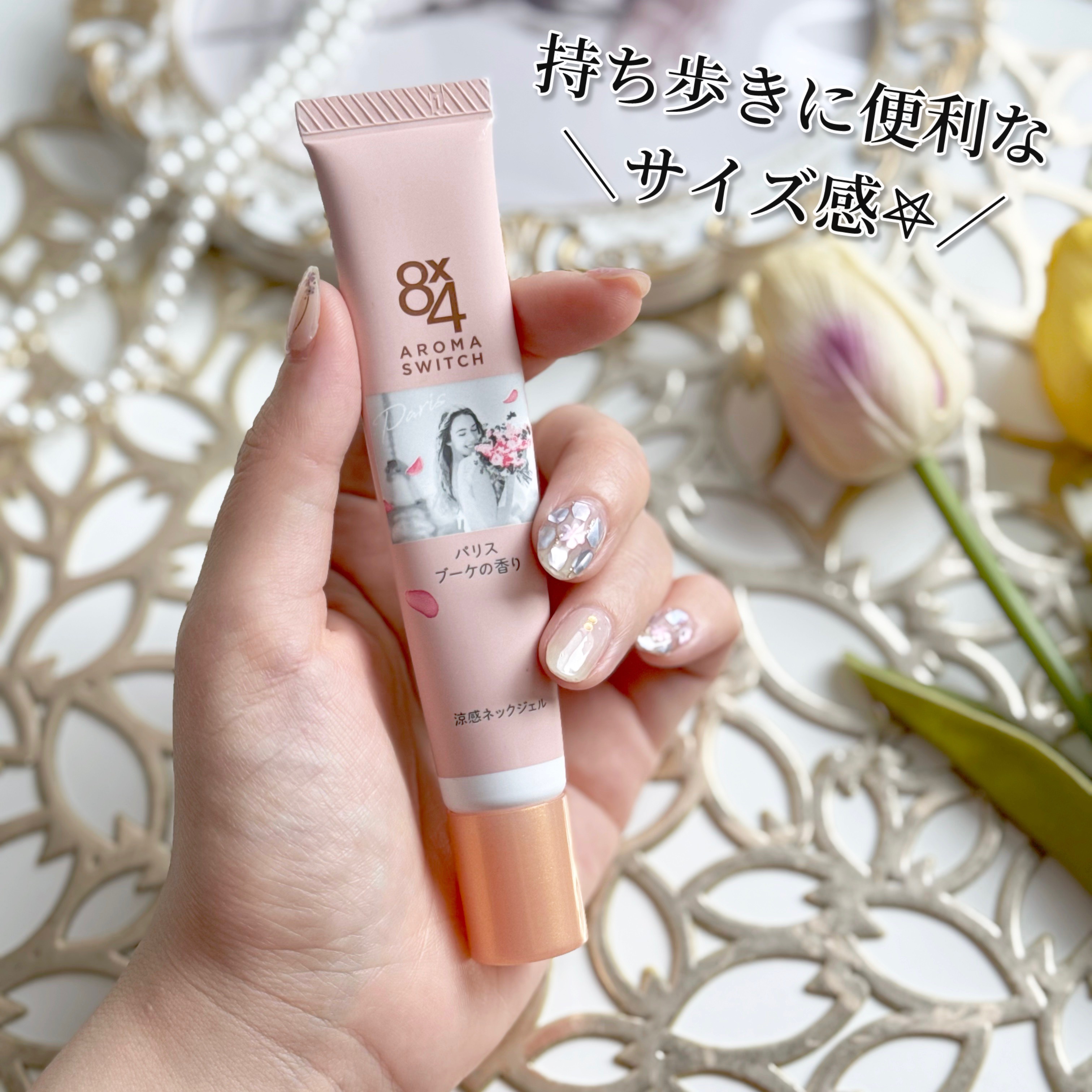 8x4からいただきました。8x4 アロマスイッチ 涼感ネックジェルパリスブーケの香り商品名:8x4 アロマスイッチ 涼感ネックジェル汗ばむ首のベタつき抑えさらっと涼やか 携帯できる汗ケアコスメ首のベタつきを抑え、髪の張り付きを防ぐだけでなく汗...