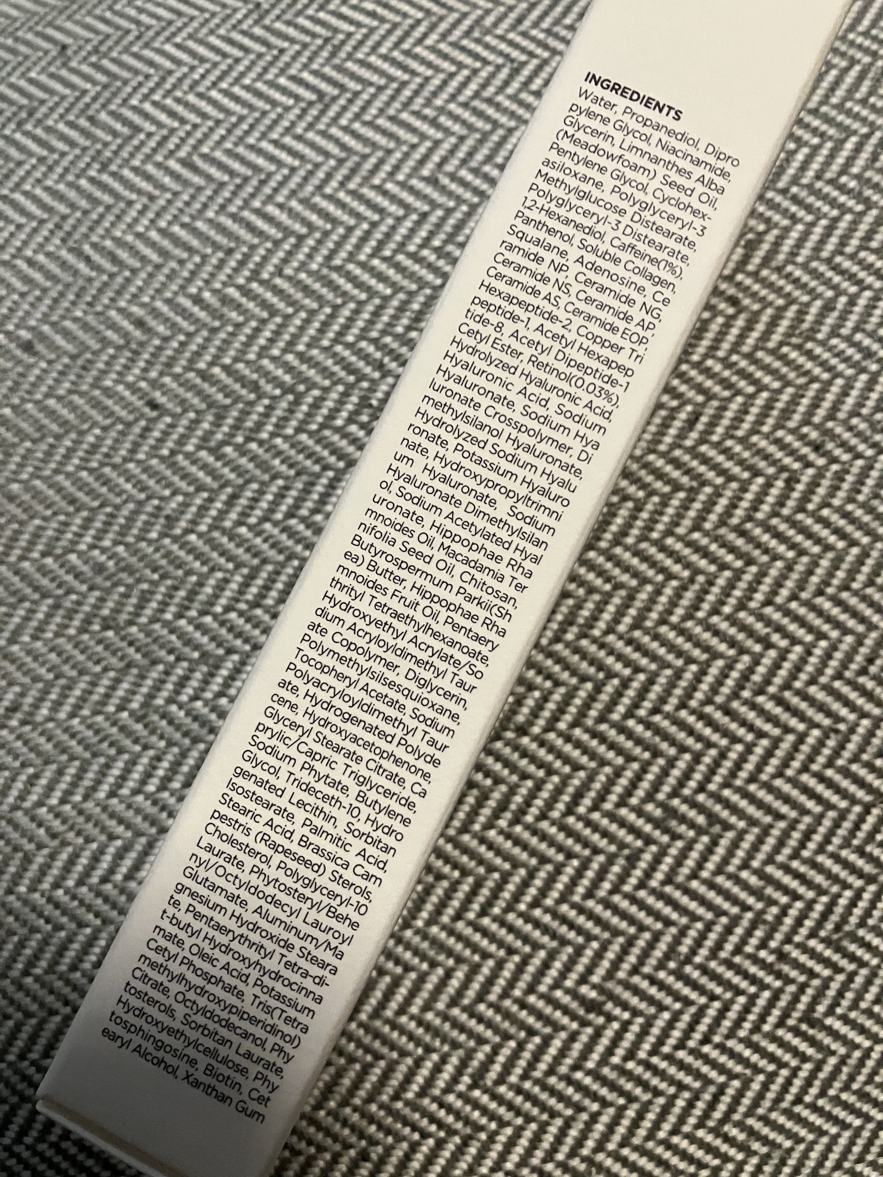 - <レチノール 0.1 カフェイン リバイタライジング アイクリーム> 水、プロパンジオール、DPG、ナイアシンアミド、グリセリン、メドウフォーム種子油、ペンチレングリコール、シクロヘキサシロキサン、ジステアリン酸ポリグリセリル-3メチルグルコース、ジステアリン酸ポリグリセリル-3、ヘキサンジオール、カフェイン、パンテノール、水溶性コラーゲン、スクアラン、アデノシン、セラミドNP、セラミドNG、セラミドNS、セラミドAP、セラミドAS、セラミドEOP、ヘキサペプチド-2、トリペプチド-1、アセチルヘキサペプチド-8、アセチルジペプチド-1セチル、レチノール、加水分解ヒアルロン酸、ヒアルロン酸、ヒアルロン酸NA、ヒアルロン酸クロスポリマーNA、ヒアルロン酸ジメチルシラノール、加水分解ヒアルロン酸NA、ヒアルロン酸K、ヒアルロン酸ヒドロキシプロピルトリモニウム、ヒアルロン酸ジメチルシラノールNA、アセチルヒアルロン酸NA、ビポファエラムノイデス油、マカデミア種子油、キトサン、シアバター、ヒポファエラムノイデス果実油、テトラエチルヘキサン酸ペンタエリスリチル、(アクリル酸ヒドロキシエチル/アクリロイルジメチルタウリン)コポリマーNA、ジグリセリン、ポリメチルシルセスキオキサン、酢酸トコフェロールポリアクリロイルジメチルタウリンNA、水添ポリデセン、ヒドロキシアセトフェノン、クエン酸ステアリン酸グリセリル、トリ(カプリル酸/カプリン酸)グリセリル、フィチン酸NA、BG、トリデセス-10、水添レシチン、イソステアリン酸ソルビタン、パルミチン酸、ステアリン酸、アブラナステロールズ、コレステロール、ラウリン酸ポリグリセリル-10、ウロイルグルタミン酸(オクチルドデシル/フィトステリル/ベヘニルステアリン酸水酸化(AL/MG)、テトラ(ジーT-ブチルヒドロキシヒドロケイヒ酸)ペンタエリスリチル、オレイン酸セチルリン酸K、クエン酸トリス(テトラメチルヒドロキシビペリジノール)、オクチルドデカノール、フィトステロールズ、ヒドロキシエチルセルロース、ラウリン酸ソルビタン、フィトスフィンゴシン、バイオチン、セテアリルアルコール、キサンタンガム