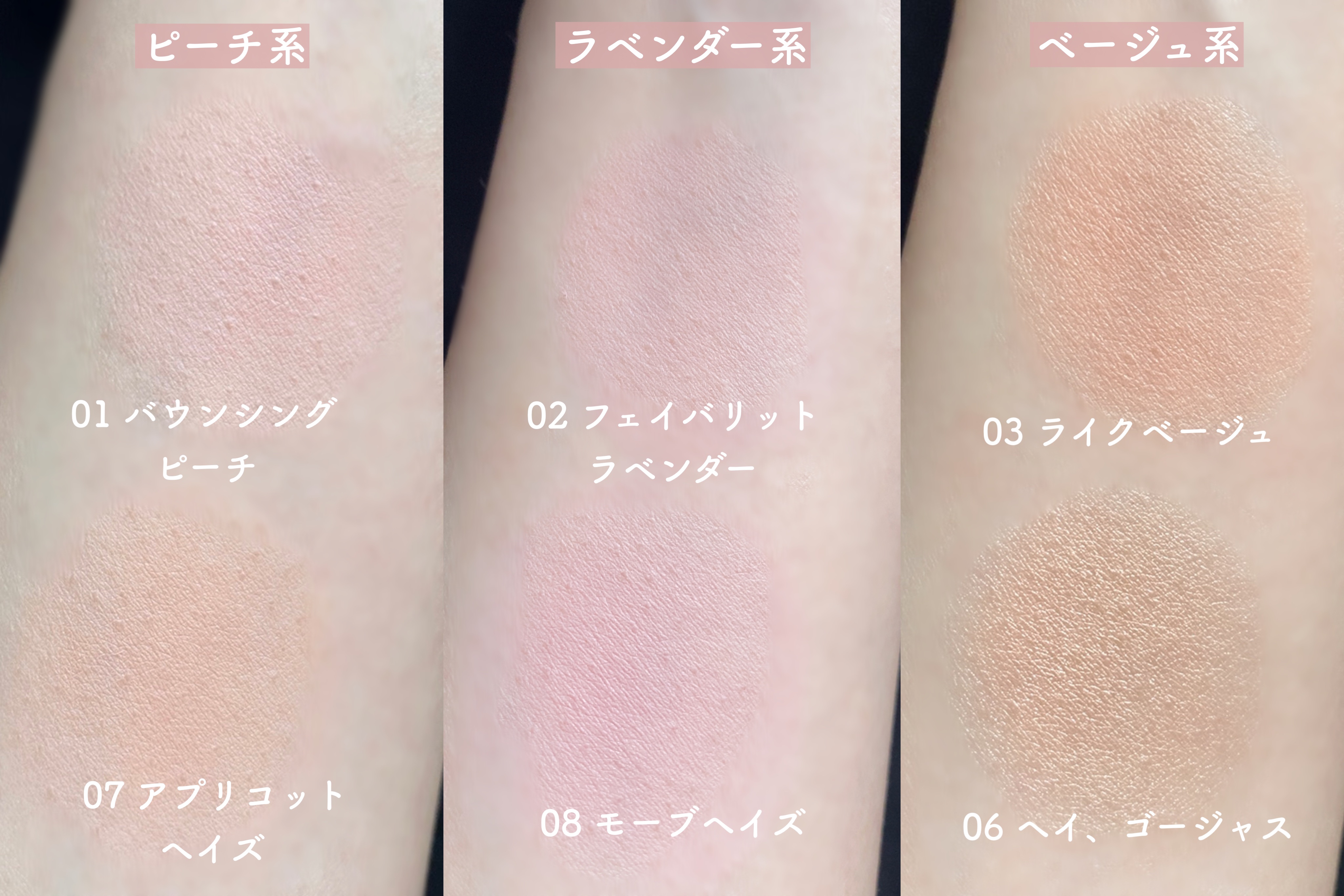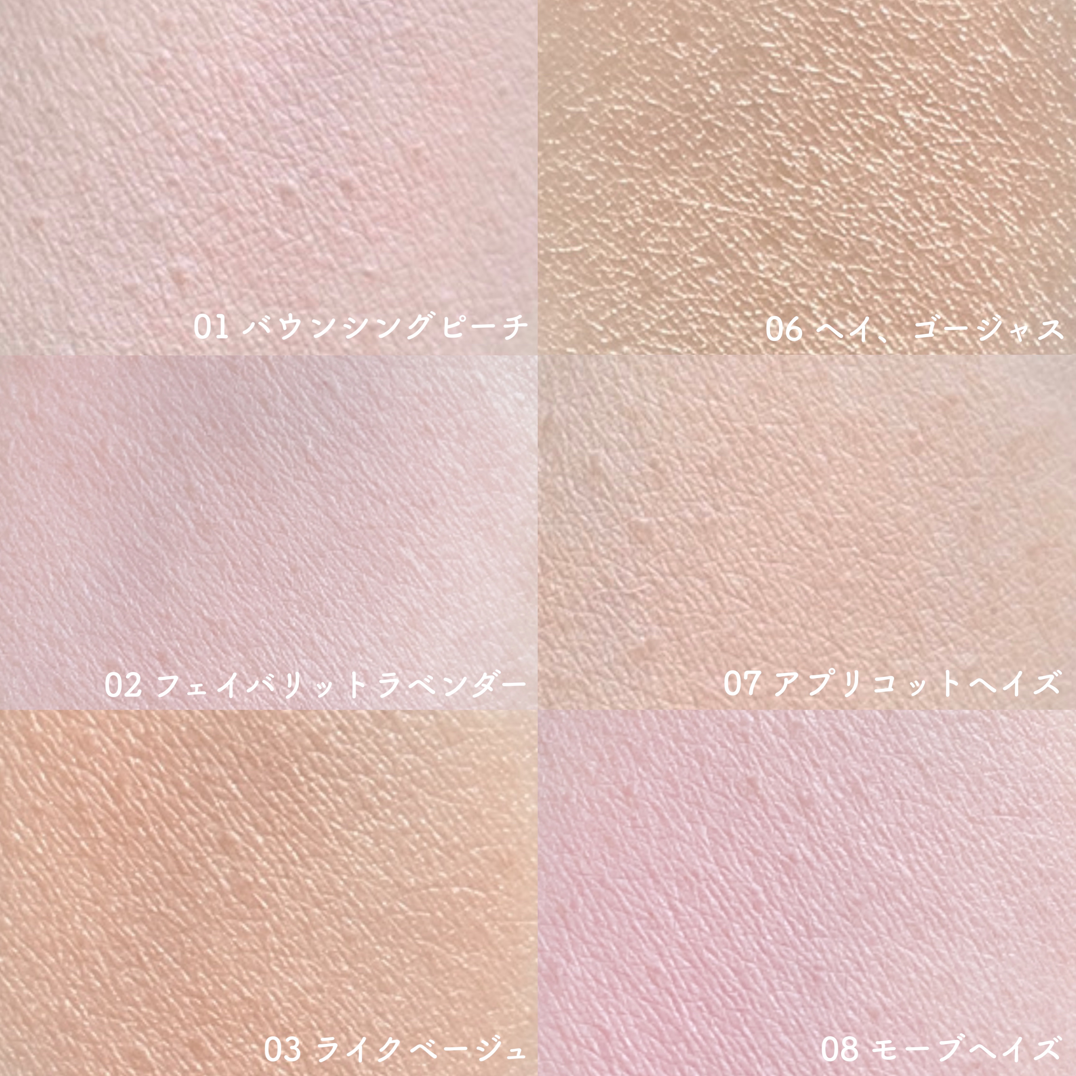 - <02 フェイバリット ラベンダー> タルク、(フッ化/水酸化/酸化)/(Mg/K/ケイ素)、マイカ、ナイロン-12、シリカ、ラウリン酸ヘキシル、ミリスチン酸Mg、リンゴ酸ジイソステアリル、フェニルトリメチコン、(ビニルジメチコン/メチコンシルセスキオキサン)クロスポリマー、ヘキサ(ヒドロキシステアリン酸/ステアリン酸/ロジン酸)ジペンタエリスリチル、ステアロイルオキシステアリン酸オクチルドデシル、ジメチコン、フェノキシエタノール、エチルヘキシルグリセリン、ミリスチン酸Al、トリエトキシカプリリルシラン、ネオペンタン酸イソステアリル、カプリル酸グリセリル、ハイドロゲンジメチコン、水、(+/-)酸化チタン、酸化鉄、カルミン <03 ライク ベージュ> タルク、マイカ、ナイロン-12、(フッ化/水酸化/酸化)/(Mg/K/ケイ素)、合成フルオロフロゴパイト、シリカ、ミリスチン酸Mg、ラウリン酸ヘキシル、リンゴ酸ジイソステアリル、フェニルトリメチコン、ヘキサ(ヒドロキシステアリン酸/ステアリン酸/ロジン酸)ジペンタエリスリチル、ステアロイルオキシステアリン酸オクチルドデシル、(ビニルジメチコン/メチコンシルセスキオキサン)クロスポリマー、ジメチコン、フェノキシエタノール、エチルヘキシルグリセリン、ミリスチン酸Al、ネオペンタン酸イソステアリル、トリエトキシカプリリルシラン、カプリル酸グリセリル、ハイドロゲンジメチコン、水、(+/-)酸化チタン、酸化鉄、カルミン、黄4、黄5 <06 ヘイ、ゴージャス> マイカ、ホウケイ酸(Ca/チタン)、ラウリン酸ヘキシル、タルク、リンゴ酸ジイソステアリル、オクテニルコハク酸デンプンAl、ミリスチン酸Mg、窒化ホウ素、ステアリン酸亜鉛、合成フルオロフロゴパイト、フェニルトリメチコン、ヘキサ(ヒドロキシステアリン酸/ステアリン酸/ロジン酸)ジペンタエリスリチル、フェノキシエタノール、エチルヘキシルグリセリン、カプリル酸グリセリル、酸化スズ、トリエトキシカプリリルシラン、ジメチコン、水、(+/-)酸化チタン、カルミン、酸化鉄、黄4、黄5 <07 アプリコット ヘイズ> タルク、マイカ、(フッ化/水酸化/酸化)/(Mg/K/ケイ素)、ナイロン-12、シリカ、ラウリン酸ヘキシル、ミリスチン酸Mg、リンゴ酸ジイソステアリル、フェニルトリメチコン、ヘキサ(ヒドロキシステアリン酸/ステアリン酸/ロジン酸)ジペンタエリスリチル、ステアロイルオキシステアリン酸オクチルドデシル、(ビニルジメチコン/メチコンシルセスキオキサン)クロスポリマー、ジメチコン、フェノキシエタノール、エチルヘキシルグリセリン、ネオペンタン酸イソステアリル、ミリスチン酸Al、トリエトキシカプリリルシラン、カプリル酸グリセリル、ハイドロゲンジメチコン、水、(+/-)酸化チタン、酸化鉄、カルミン、黄4、黄5 <08 モーブ ヘイズ> タルク、マイカ、(フッ化/水酸化/酸化)/(Mg/K/ケイ素)、ナイロン-12、シリカ、ラウリン酸ヘキシル、ミリスチン酸Mg、リンゴ酸ジイソステアリル、フェニルトリメチコン、ヘキサ(ヒドロキシステアリン酸/ステアリン酸/ロジン酸)ジペンタエリスリチル、ステアロイルオキシステアリン酸オクチルドデシル、(ビニルジメチコン/メチコンシルセスキオキサン)クロスポリマー、ジメチコン、フェノキシエタノール、カプリル酸グリセリル、ネオペンタン酸イソステアリル、ミリスチン酸Al、トリエトキシカプリリルシラン、ハイドロゲンジメチコン、(+/-)酸化チタン、酸化鉄、カルミン