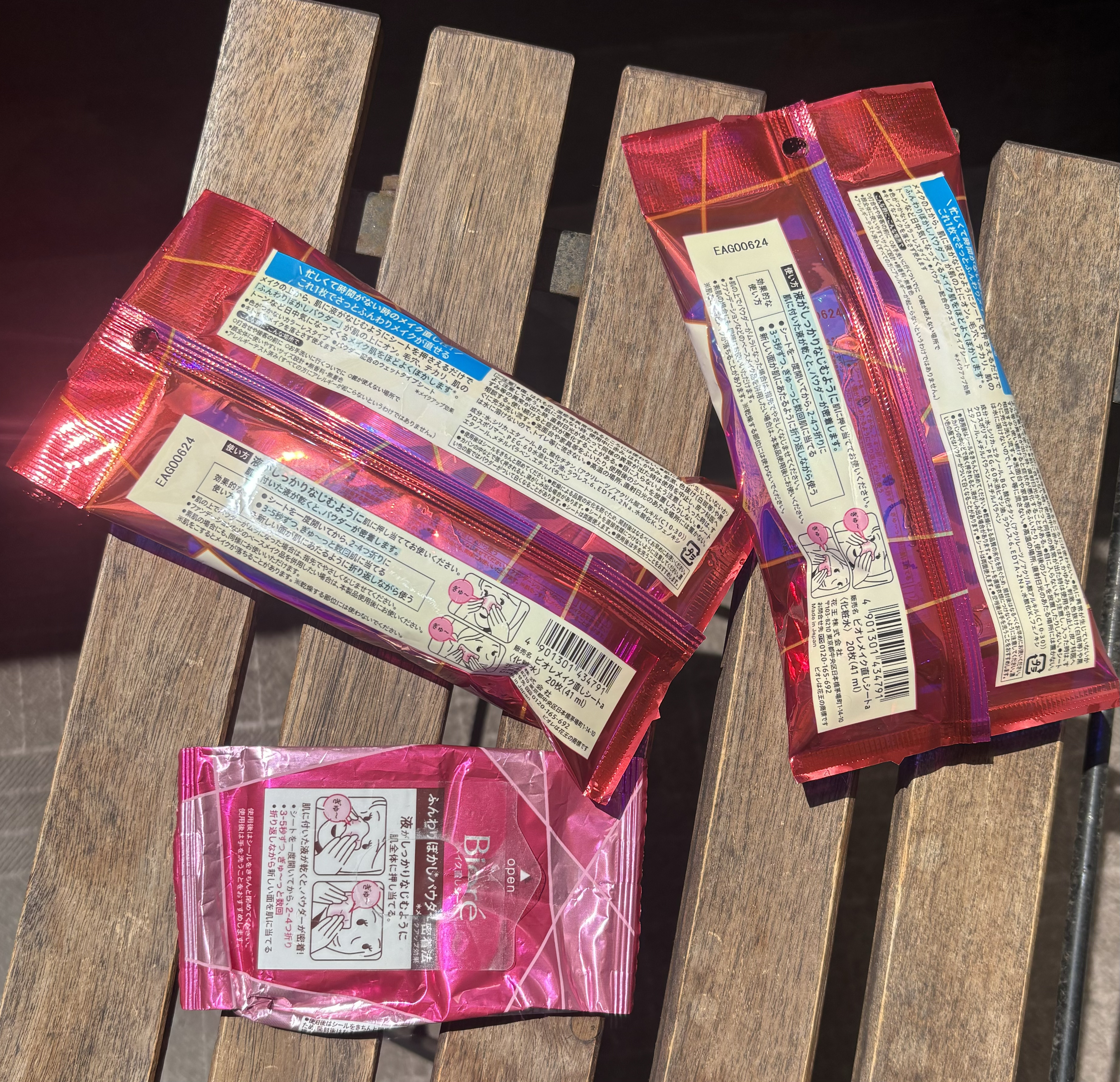 - <ビオレ メイク直しシート> 水、シリカ、エタノール、BG、酸化チタン、(アクリレーツ/アクリル酸アルキル(C10-30))クロスポリマー、PEG-60水添ヒマシ油、ラウレス-6、EDTA-2Na、水酸化K、フェノキシエタノール、メチルパラベン、エチルパラベン