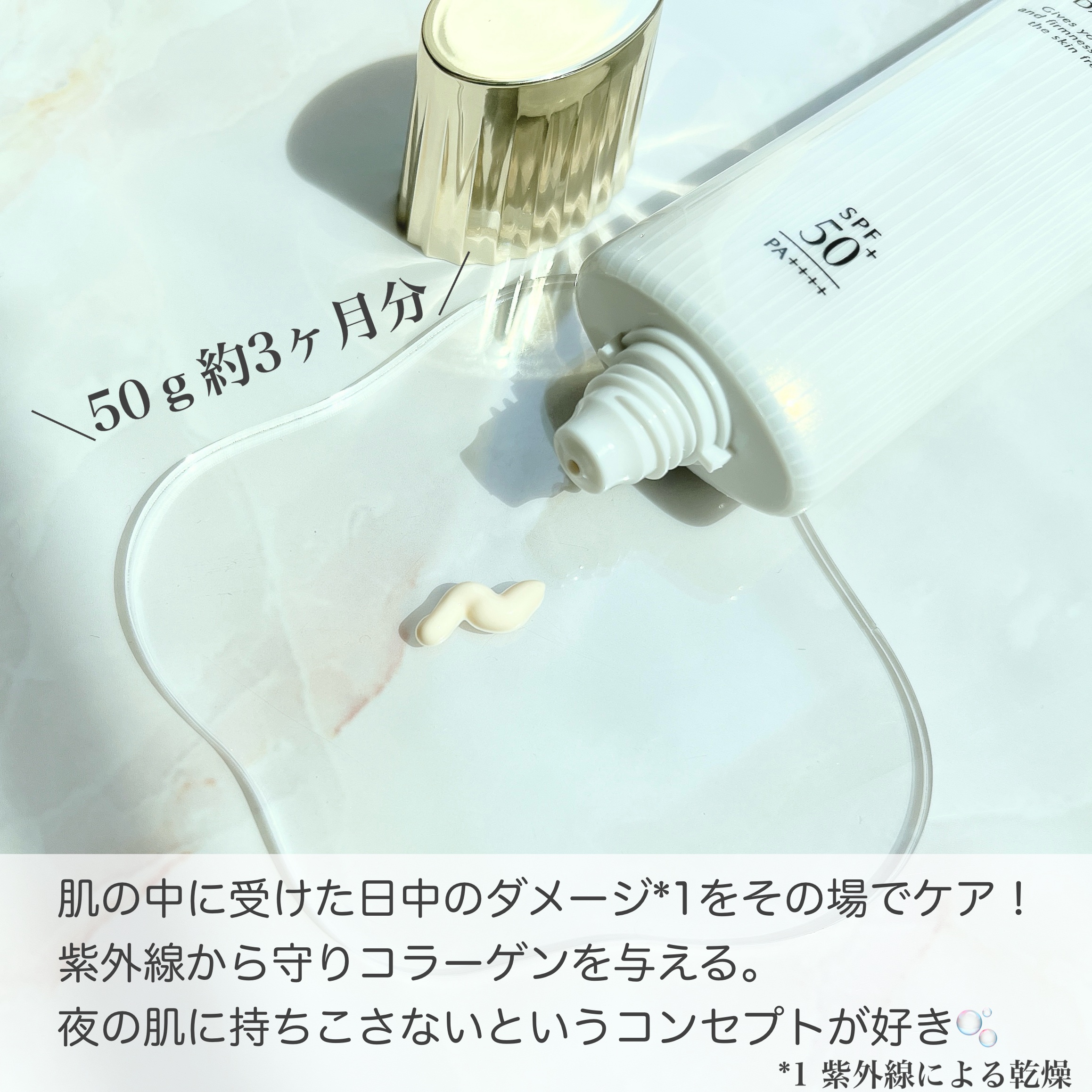 SPF50+ PA++++という高い紫外線カット効果を持ちながらスキンケア感覚で使える日中用クリーム! コラーゲンを補給してハリ感のある肌へと導きます。 エイジングのお悩みがある方には特におすすめです。 テクスチャーは軽やかでベタつかず、乳液とクリームの中間のような使用感。