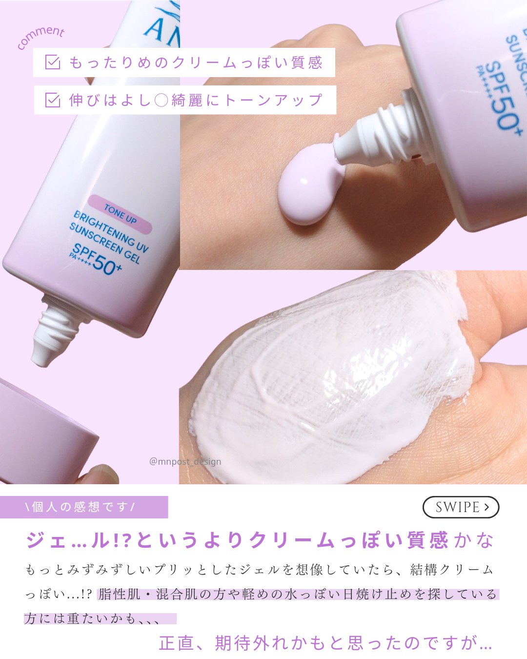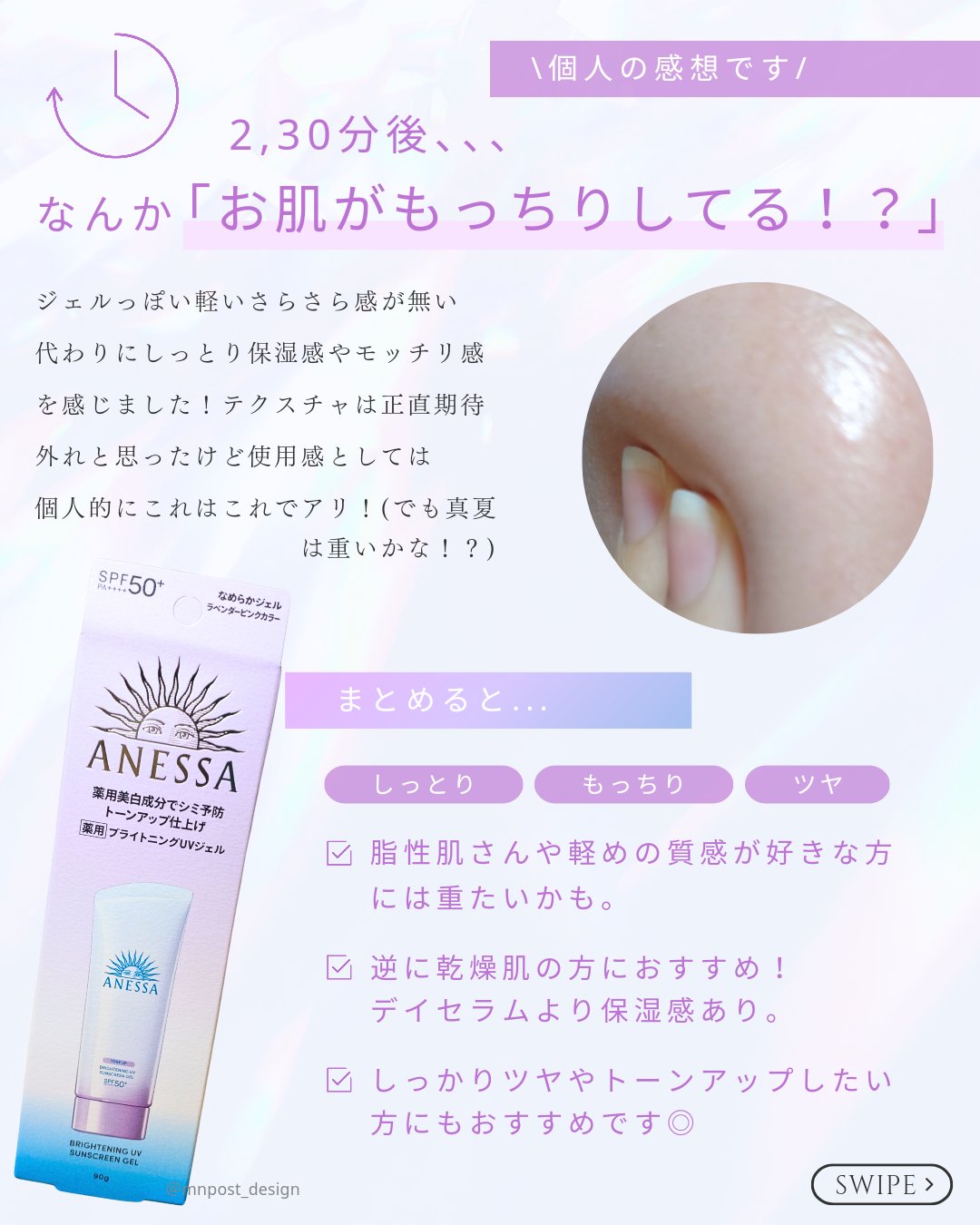 大人気アネッサなのですでに使ったことがある方も多いかと思いますが、まずブライトニングUVジェル(青紫)に関してはちゃんと口コミとか見ずに、ジェル=みずみずしい軽めの日焼け止め♪と思っていた私が悪かったです😅(笑) 同じように水っぽいテクスチャを期待して購入検討されている方が(もしかしたら!もしかしたら!!笑)いるかもしれないのでそんな方の参考になれば!?幸いです🙇 あと日焼け止め大好き人間なのでオススメの日焼け止めがあればぜひコメントとかで教えて頂けると嬉しいです✨