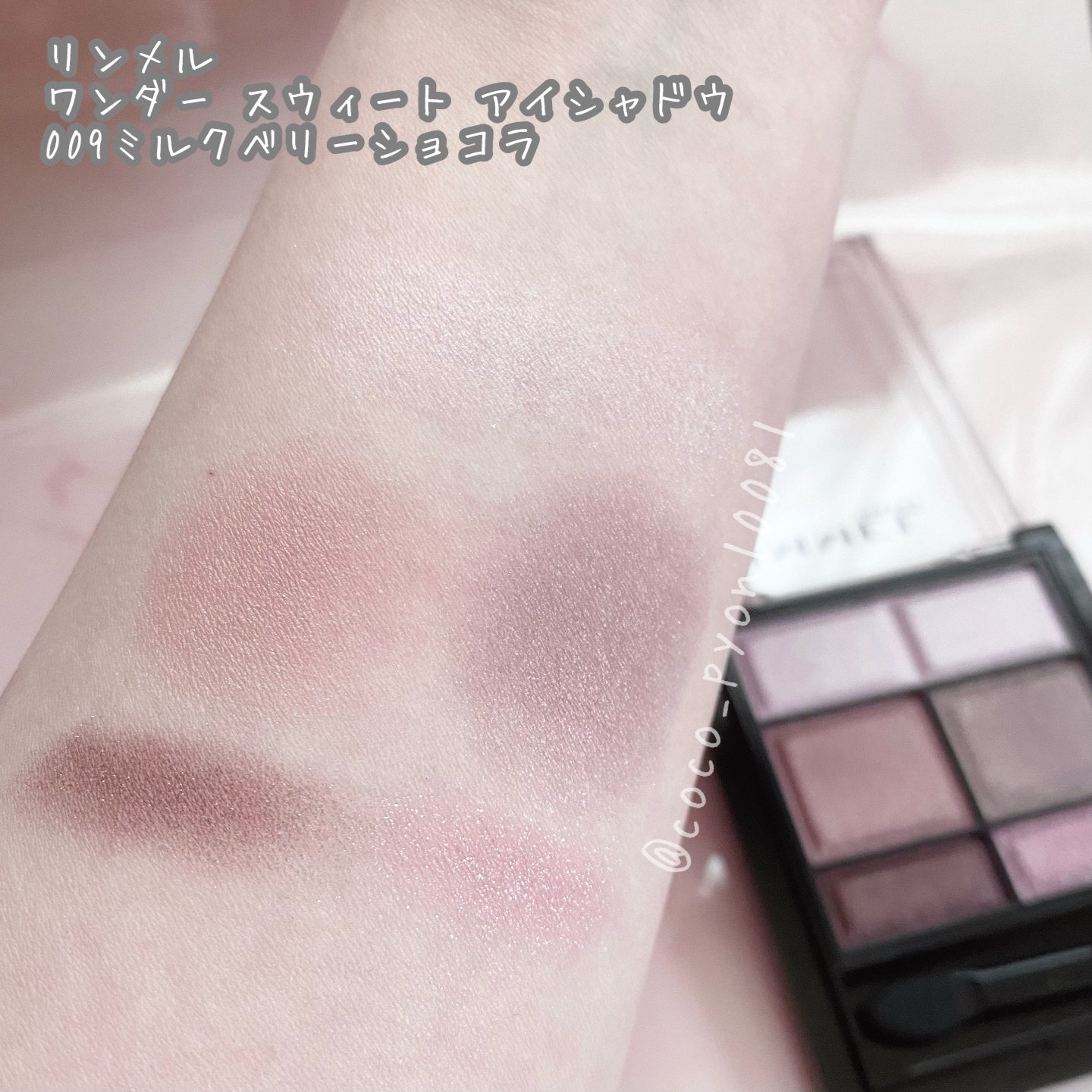 甘過ぎずに使いやすい甘辛ベリー🍓💗 大人気だった#ショコラスウィートアイズがリニューアルして新しくなったワンダースウィートアイシャドウ👏🏻✨ 今回の009ミルクベリーショコラは、ピンク系ですがくすみと落ち着き感があり甘過ぎないのが最高に可愛くて...!💗 プチプラで5色入り、しかも大容量(最初現品見て驚いた)なのでコスパよく楽しめるな〜と🛍️✨
