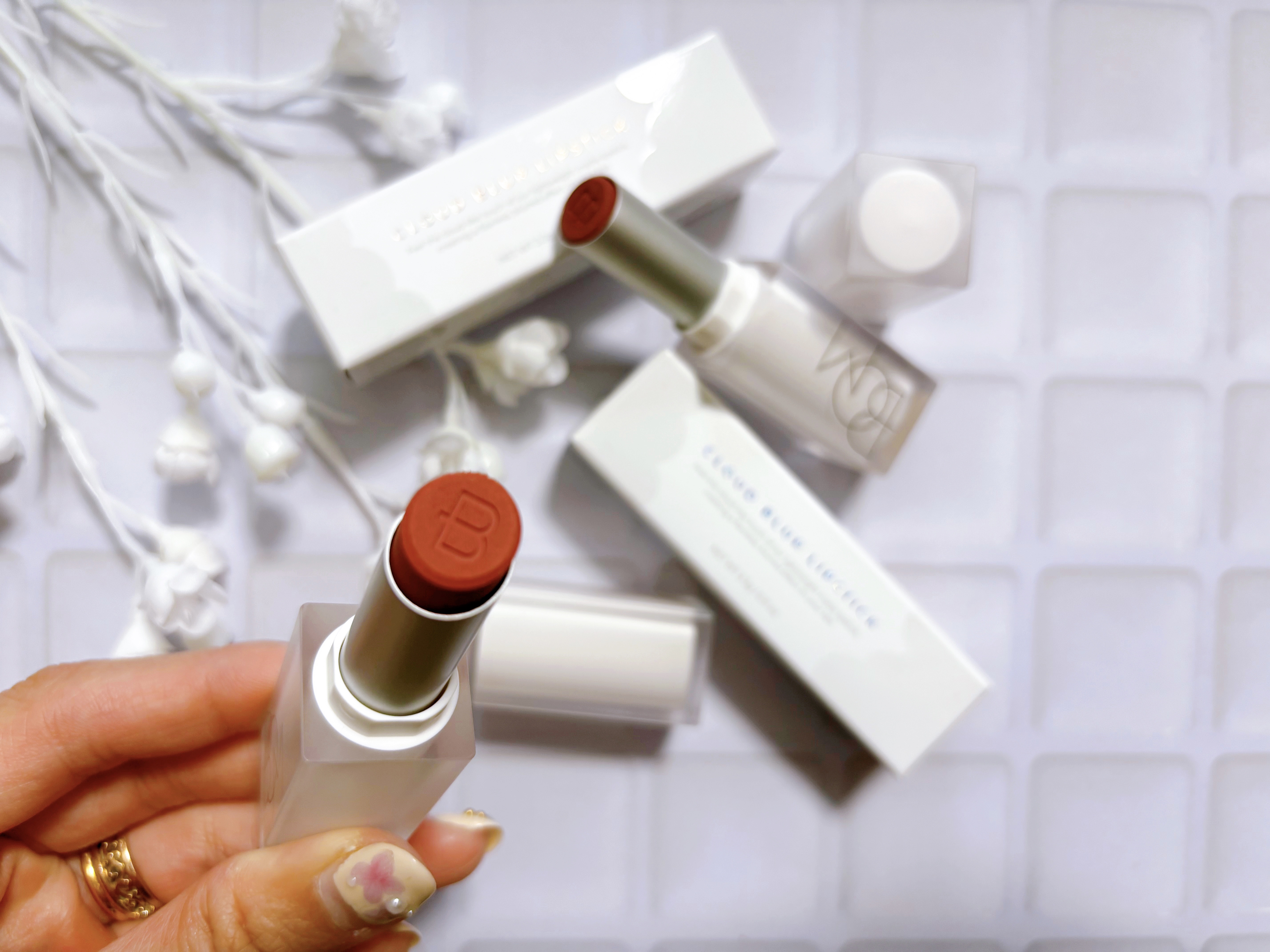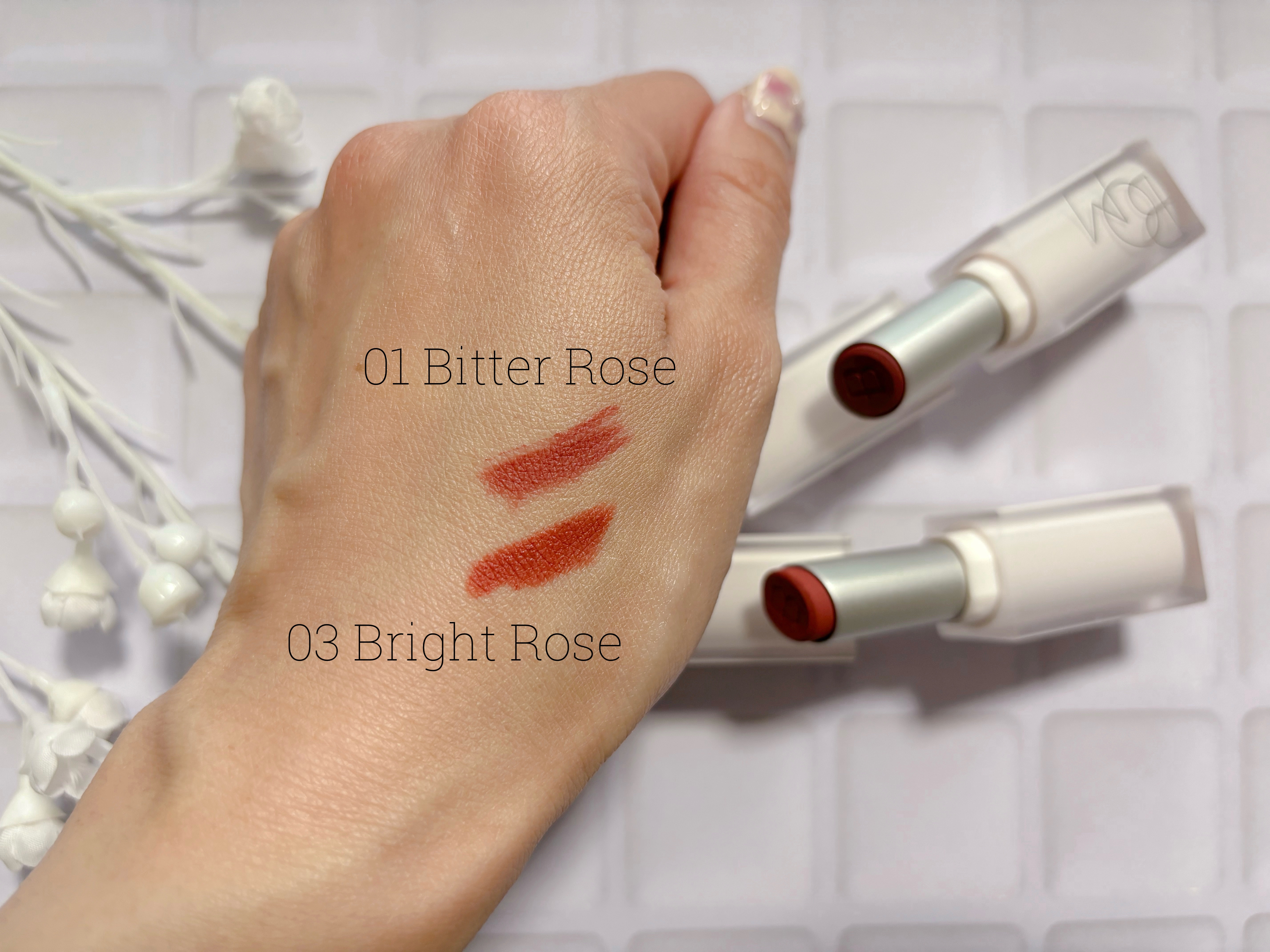 軽いふんわりとしたテクスチャだよ☺️ パウダー配合でさらっと、マットな仕上がり✨️ 3種のオイル(アボカドオイル、マカダミア種オイル、スイートアーモンドオイル)配合で、唇のシワをカバー🫶 01はくすみがかった落ち着いたローズカラー 05は大人っぽいブラウンカラー