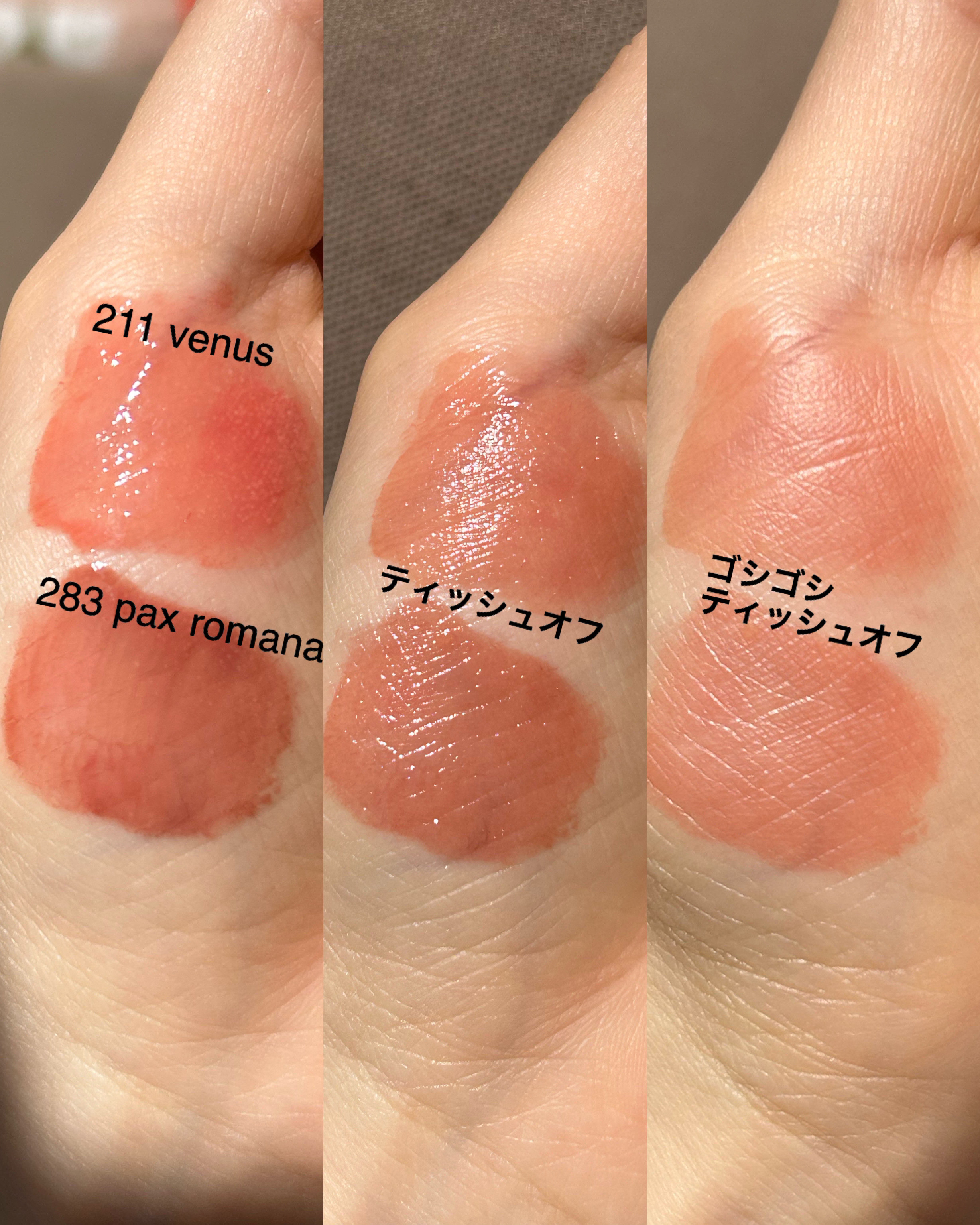 - <201 ノビリタス> 水、ジフェニルジメチコン、リンゴ酸ジイソステアリル、ビスジグリセリルポリアシルアジペート-2、オクチルドデカノール、水添ポリイソブテン、トリメチルシロキシフェニルジメチコン、ジグリセリン、セチルPEG/PPG-10/1ジメチコン、DPG、ポリソルベート60、イソステアリン酸ソルビタン、ペンチレングリコール、(アクリル酸ヒドロキシエチル/アクリロイルジメチルタウリンNa)コポリマー、セテアリルアルコール、スクワラン、酸化チタン、黄4、赤227、エチルヘキシルグリセリン、安息香酸ベンジル、黄5、香料、水酸化Al、ポリアクリル酸アンモニウム、リナロール、フェノキシエタノール、BG、塩化Na、青1、ヘキシルシンナマル、トコフェロール <202 ソフィア> 水、ジフェニルジメチコン、リンゴ酸ジイソステアリル、オクチルドデカノール、水添ポリイソブテン、トリメチルシロキシフェニルジメチコン、ジグリセリン、DPG、セチルPEG/PPG-10/1ジメチコン、ポリソルベート60、イソステアリン酸ソルビタン、ペンチレングリコール、(アクリル酸ヒドロキシエチル/アクリロイルジメチルタウリンNa)コポリマー、セテアリルアルコール、スクワラン、酸化チタン、黄5、赤227、エチルヘキシルグリセリン、安息香酸ベンジル、香料、リナロール、水酸化Al、ポリアクリル酸アンモニウム、青1、BG、フェノキシエタノール、ヘキシルシンナマル、トコフェロール <203 ディビニタス> 水、ジフェニルジメチコン、リンゴ酸ジイソステアリル、ビスジグリセリルポリアシルアジペート-2、オクチルドデカノール、水添ポリイソブテン、トリメチルシロキシフェニルジメチコン、ジグリセリン、セチルPEG/PPG-10/1ジメチコン、DPG、ポリソルベート60、イソステアリン酸ソルビタン、ペンチレングリコール、(アクリル酸ヒドロキシエチル/アクリロイルジメチルタウリンNa)コポリマー、セテアリルアルコール、スクワラン、酸化チタン、黄5、赤227、エチルヘキシルグリセリン、安息香酸ベンジル、香料、水酸化Al、ポリアクリル酸アンモニウムリナロール、青1、フェノキシエタノール、BG、ヘキシルシンナマル、トコフェロール <204 モデスティア> 水、ジフェニルジメチコン、リンゴ酸ジイソステアリル、オクチルドデカノール、ビスジグリセリルポリアシルアジペート-2、水添ポリイソブテン、トリメチルシロキシフェニルジメチコン、ジグリセリン、DPG、セチルPEG/PPG-10/1ジメチコン、ポリソルベート60、イソステアリン酸ソルビタン、ペンチレングリコール、(アクリル酸ヒドロキシエチル/アクリロイルジメチルタウリンNa)コポリマー、セテアリルアルコール、スクワラン、酸化チタン、黄5、赤104(1)、赤227、エチルヘキシルグリセリン、安息香酸ベンジル、香料、青1、水酸化Al、ポリアクリル酸アンモニウム、リナロール、フェノキシエタノール、BG、ヘキシルシンナマル、トコフェロール <205 ユスティティア> 水、ジフェニルジメチコン、リンゴ酸ジイソステアリル、ビスジグリセリルポリアシルアジペート-2、オクチルドデカノール、水添ポリイソブテン、トリメチルシロキシフェニルジメチコン、ジグリセリン、セチルPEG/PPG-10/1ジメチコン、DPG、ポリソルベート60、イソステアリン酸ソルビタン、ペンチレングリコール、(アクリル酸ヒドロキシエチル/アクリロイルジメチルタウリンNa)コポリマー、セテアリルアルコール、スクワラン、酸化チタン、黄4、赤227、エチルヘキシルグリセリン、安息香酸ベンジル、黄5、香料、水酸化Al、ポリアクリル酸アンモニウム、リナロール、フェノキシエタノール、BG、塩化Na、青1、ヘキシルシンナマル、トコフェロール <206 グラティア> 水、ジフェニルジメチコン、リンゴ酸ジイソステアリル、ビスジグリセリルポリアシルアジペート-2、オクチルドデカノール、水添ポリイソブテン、トリメチルシロキシフェニルジメチコン、ジグリセリン、セチルPEG/PPG-10/1ジメチコン、DPG、ポリソルベート60、イソステアリン酸ソルビタン、ペンチレングリコール、(アクリル酸ヒドロキシエチル/アクリロイルジメチルタウリンNa)コポリマー、セテアリルアルコール、スクワラン、酸化チタン、黄4、赤227、エチルヘキシルグリセリン、安息香酸ベンジル、黄5、香料、水酸化Al、ポリアクリル酸アンモニウム、リナロール、フェノキシエタノール、BG、塩化Na、青1、ヘキシルシンナマル、トコフェロール <213 リベルタス> 水、ジフェニルジメチコン、リンゴ酸ジイソステアリル、ビスジグリセリルポリアシルアジペート-2、オクチルドデカノール、水添ポリイソブテン、トリメチルシロキシフェニルジメチコン、ジグリセリン、DPG、セチルPEG/PPG-10/1ジメチコン、ポリソルベート60、イソステアリン酸ソルビタン、1,2-ヘキサンジオール、ペンチレングリコール、酸化チタン(CI 77891)、(アクリル酸ヒドロキシエチル/アクリロイルジメチルタウリンNa)コポリマー、セテアリルアルコール、スクワラン、黄5、エチルヘキシルグリセ