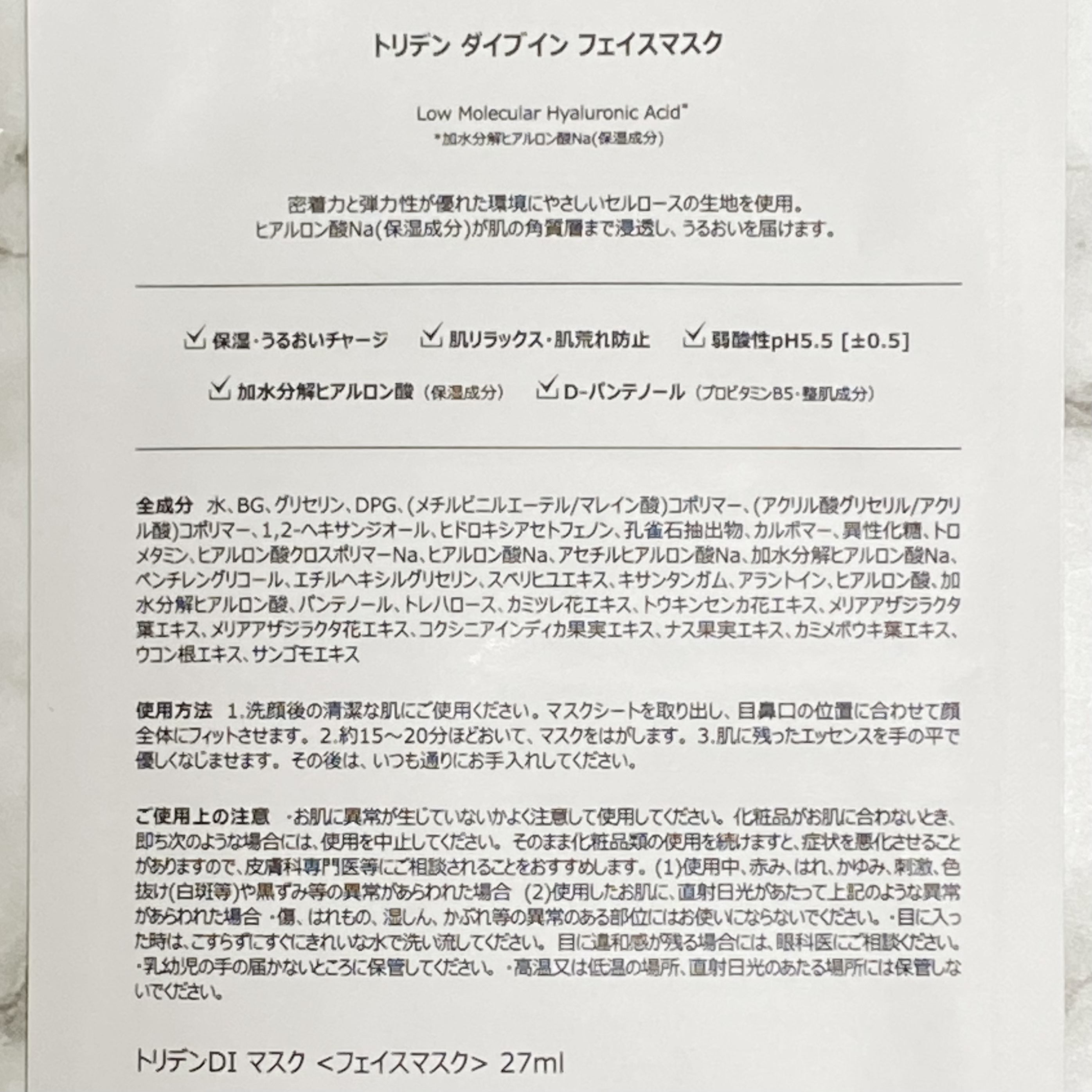 - <1枚> 水、BG、グリセリン、DPG、(メチルビニルエーテル/マレイン酸)コポリマー、(アクリル酸グリセリル/アクリル酸)コポリマー、1,2-ヘキサンジオール、ヒドロキシアセトフェノン、孔雀石抽出物、カルボマー、異性化糖、トロメタミン、ヒアルロン酸クロスポリマーNa、ヒアルロン酸Na、アセチルヒアルロン酸Na、加水分解ヒアルロン酸Na、ペンチレングリコール、エチルヘキシルグリセリン、スベリヒユエキス、キサンタンガム、アラントイン、ヒアルロン酸、加水分解ヒアルロン酸、パンテノール、トレハロース、カミツレ花エキス、トウキンセンカ花エキス、メリアアザジラクタ葉エキス、メリアアザジラクタ花エキス、コクシニアインディカ果実エキス、ナス果実エキス、カミメボウキ葉エキス、ウコン根エキス、サンゴモエキス <3枚> 水、BG、グリセリン、DPG、(メチルビニルエーテル/マレイン酸)コポリマー、(アクリル酸グリセリル/アクリル酸)コポリマー、1,2-ヘキサンジオール、ヒドロキシアセトフェノン、乳雀石抽出物、カルボマー、異性化糖、トロメタミン、ヒアルロン酸クロスポリマーNa、ヒアルロン酸Na、アセチルヒアルロン酸Na、加水分解ヒアルロン酸Na、ペンチレングリコール、エチルヘキシルグリセリン、スベリヒユエキス、キサンタンガム、アラントイン、ヒアルロン酸、加水分解ヒアルロン酸、パンテノール、トレハロース、カミツレ花エキス、トウキンセンカ花エキス、メリアアザジラクタ葉エキス、メリアアザジラクタ花エキス、コクシニアインディカ果実エキス、ナス果実エキス、カミメボウキ葉エキス、ウコン根エキス、サンゴモエキス <10枚> 水、BG、グリセリン、DPG、(メチルビニルエーテル/マレイン酸)コポリマー、(アクリル酸グリセリル/アクリル酸)コポリマー、1,2-ヘキサンジオール、ヒドロキシアセトフェノン、孔雀石抽出物、カルボマー、異性化糖、トロメタミン、ヒアルロン酸クロスポリマーNa、ヒアルロン酸Na、アセチルヒアルロン酸Na、加水分解ヒアルロン酸Na、ペンチレングリコール、エチルヘキシルグリセリン、スベリヒユエキス、キサンタンガム、アラントイン、ヒアルロン酸、加水分解ヒアルロン酸、パンテノール、トレハロース、カミツレ花エキス、トウキンセンカ花エキス、メリアアザジラクタ葉エキス、メリアアザジラクタ花エキス、コクシニアインディカ果実エキス、ナス果実エキス、カミメボウキ葉エキス、ウコン根エキス、サンゴモエキス