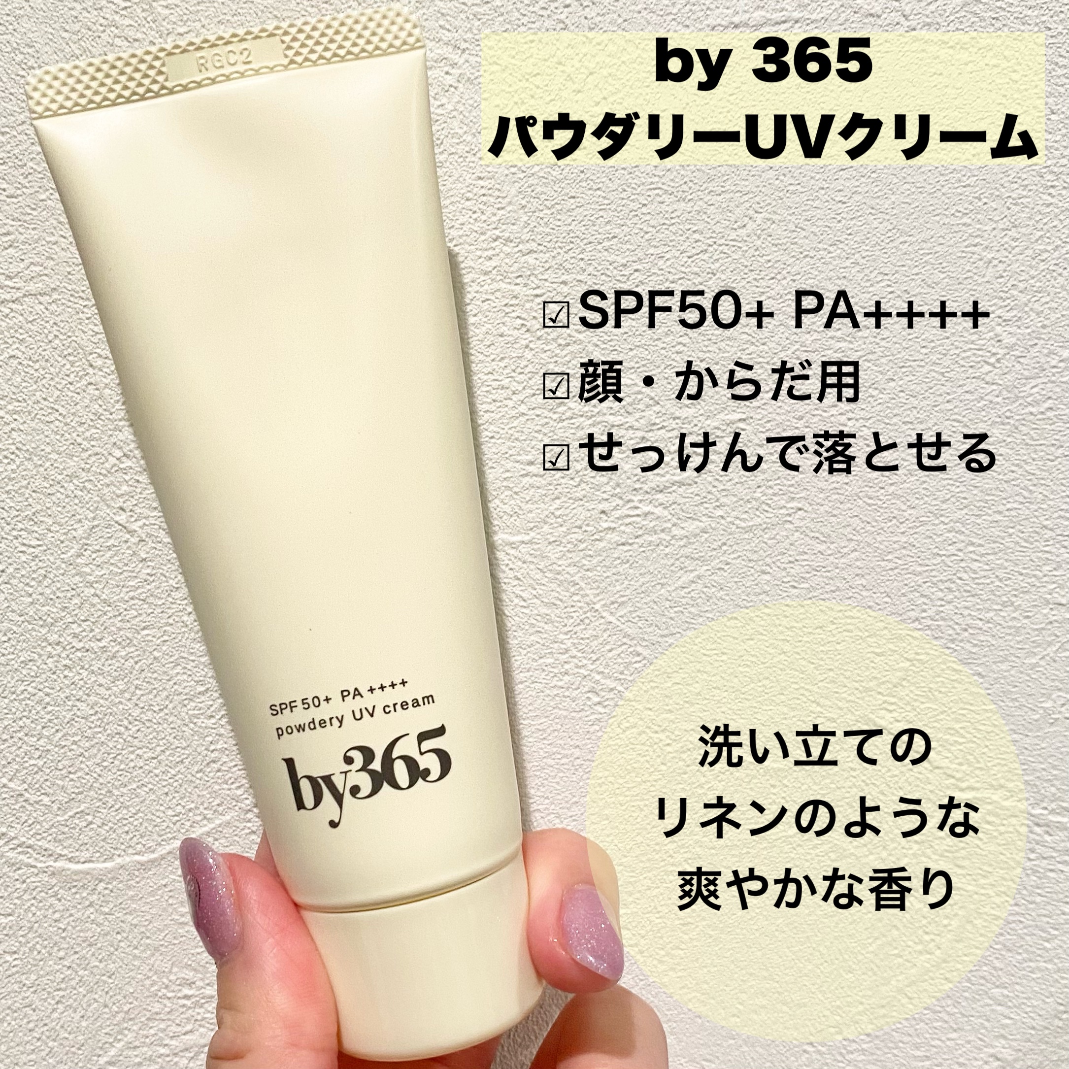 \by365パウダリーUVクリームトーンアップ/化粧下地としても使えるSPF50の頼もしい日焼け止めクリーム💛やや固めのテクスチャーですが肌に塗っていくとスーッと伸びていきます。ベタベタすることなく、パウダーを塗ったみたいにさらさらした質感な...