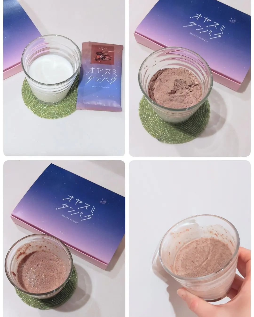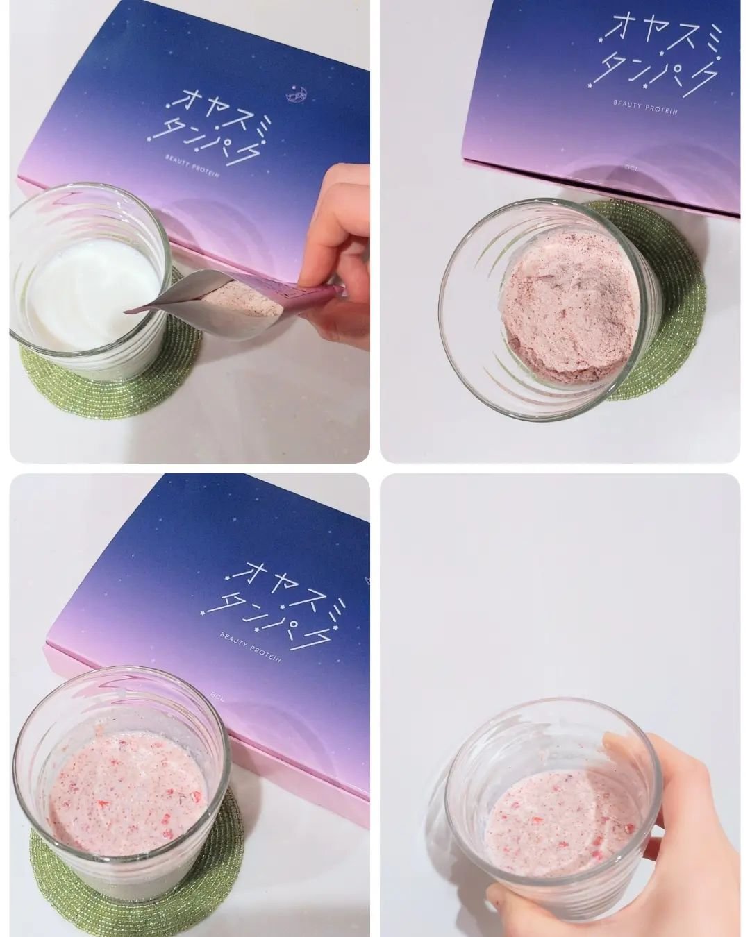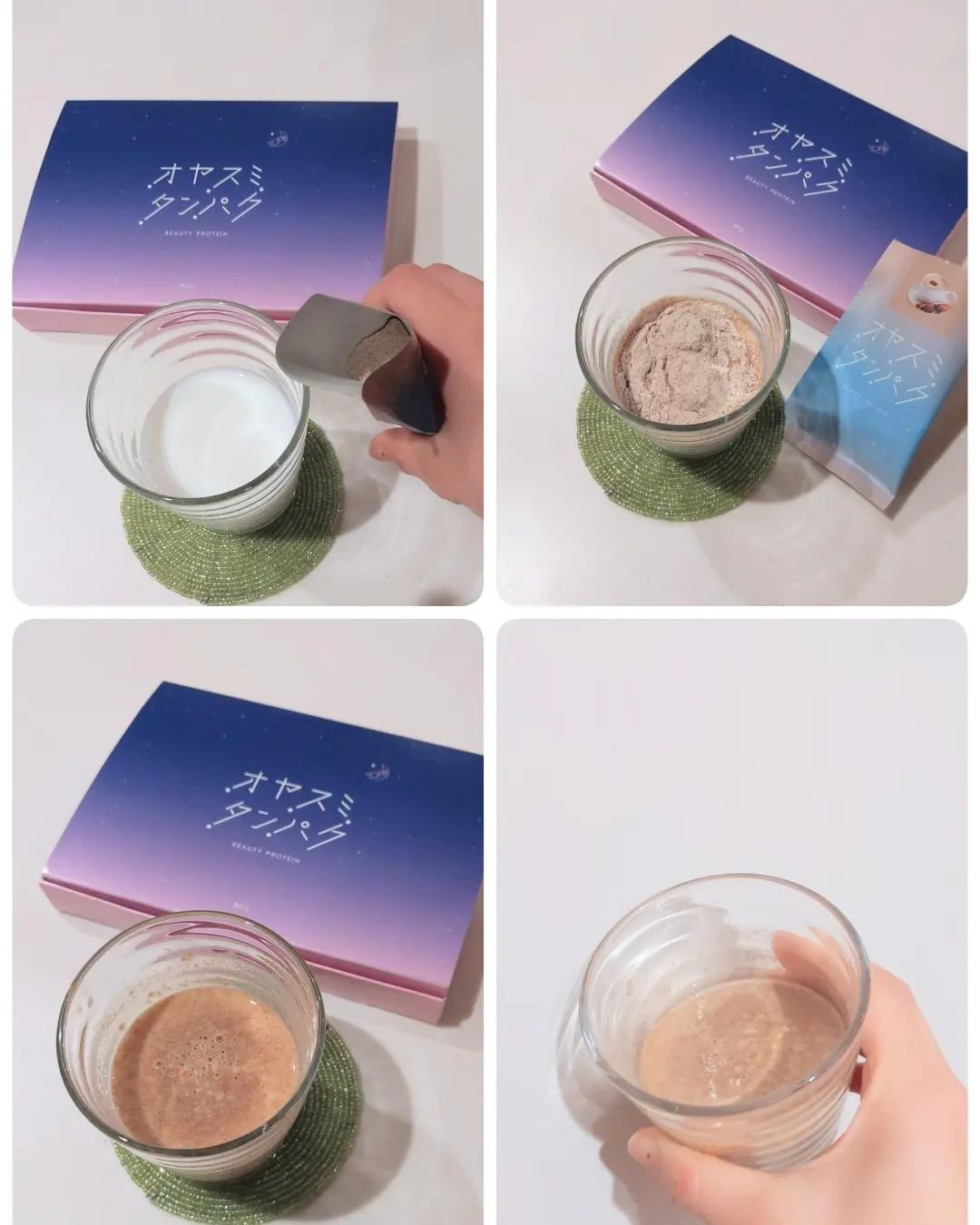 オヤスミ前のお肌の栄養補給 ◇オヤスミタンパク 就寝から3時間で最も分泌されると言われる成長ホルモンは、お肌のターンオーバーの促進や日中の紫外線などからのダメージを修復する働きがあると言われています! オヤスミタンパクは、成長ホルモンの元となるアミノ酸をはじめ、栄養成分をバランス良く配合した夜の美容プロテインだそう✨ フレーバーは全部で3種類✨ 🍓イチゴ味 甘酸っぱいフレッシュなイチゴ味。☕️ココア味 カカオ香るまろやかココア味 🫖チャイ味 スパイス香るさっぱりチャイ味。