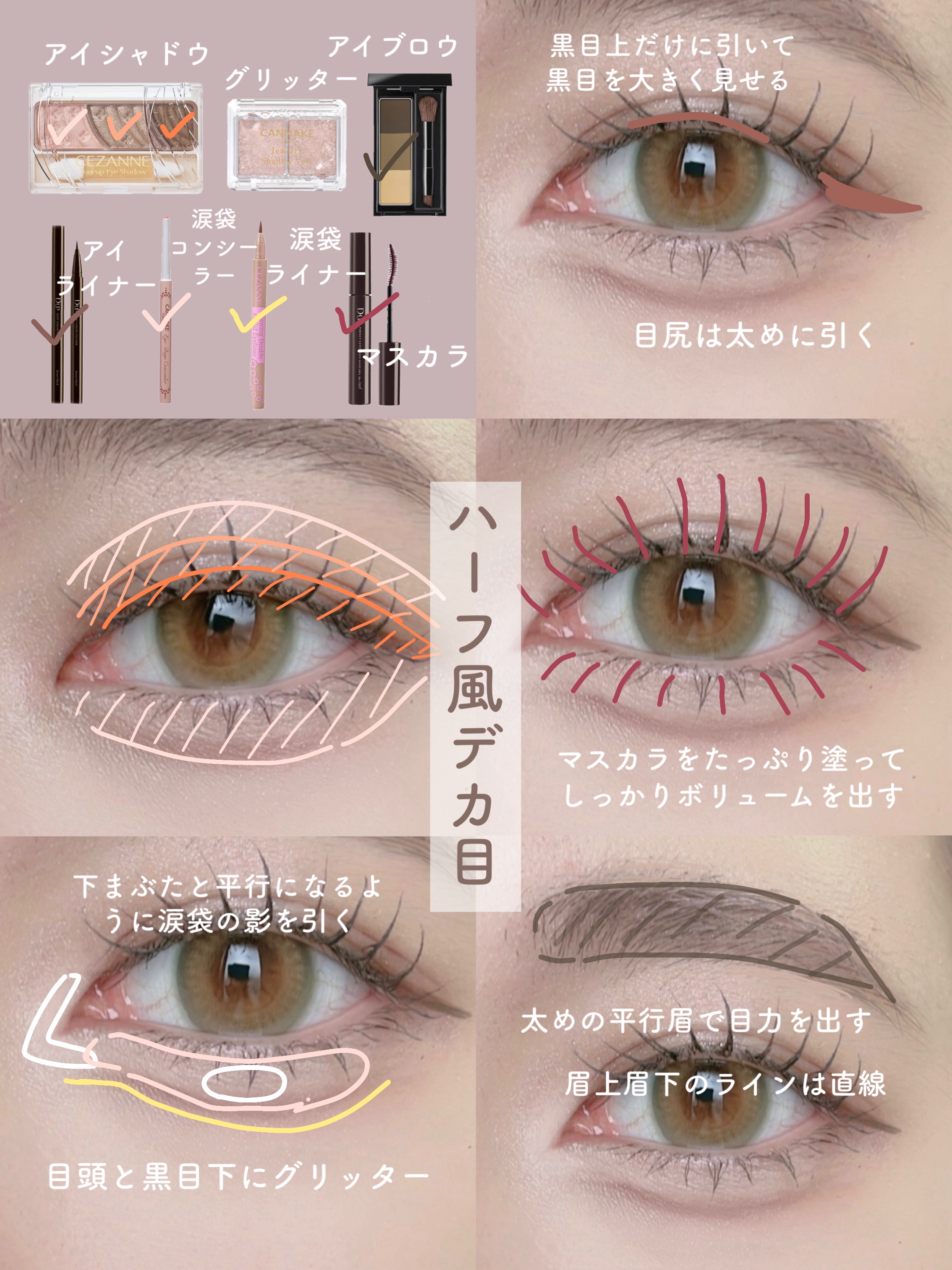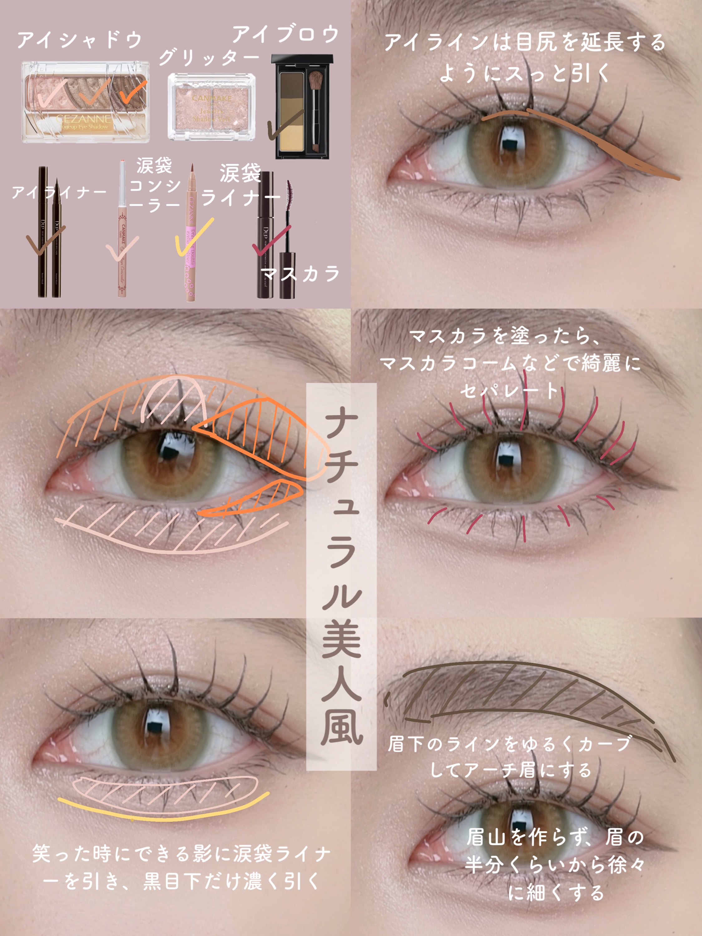 rom&nd ベターザンパレット 01PAMPAS GARDEN キャンメイク アイバッグコンシーラー 02ピンクベージュ CEZANNE ストレッチコンシーラー 30オレンジ系 これどんなに濃いクマも消える◎ やり方は画像を見てください🫶🏻 ラメを使わずに盛りたい時や、あざとく盛りたい時におすすめ!