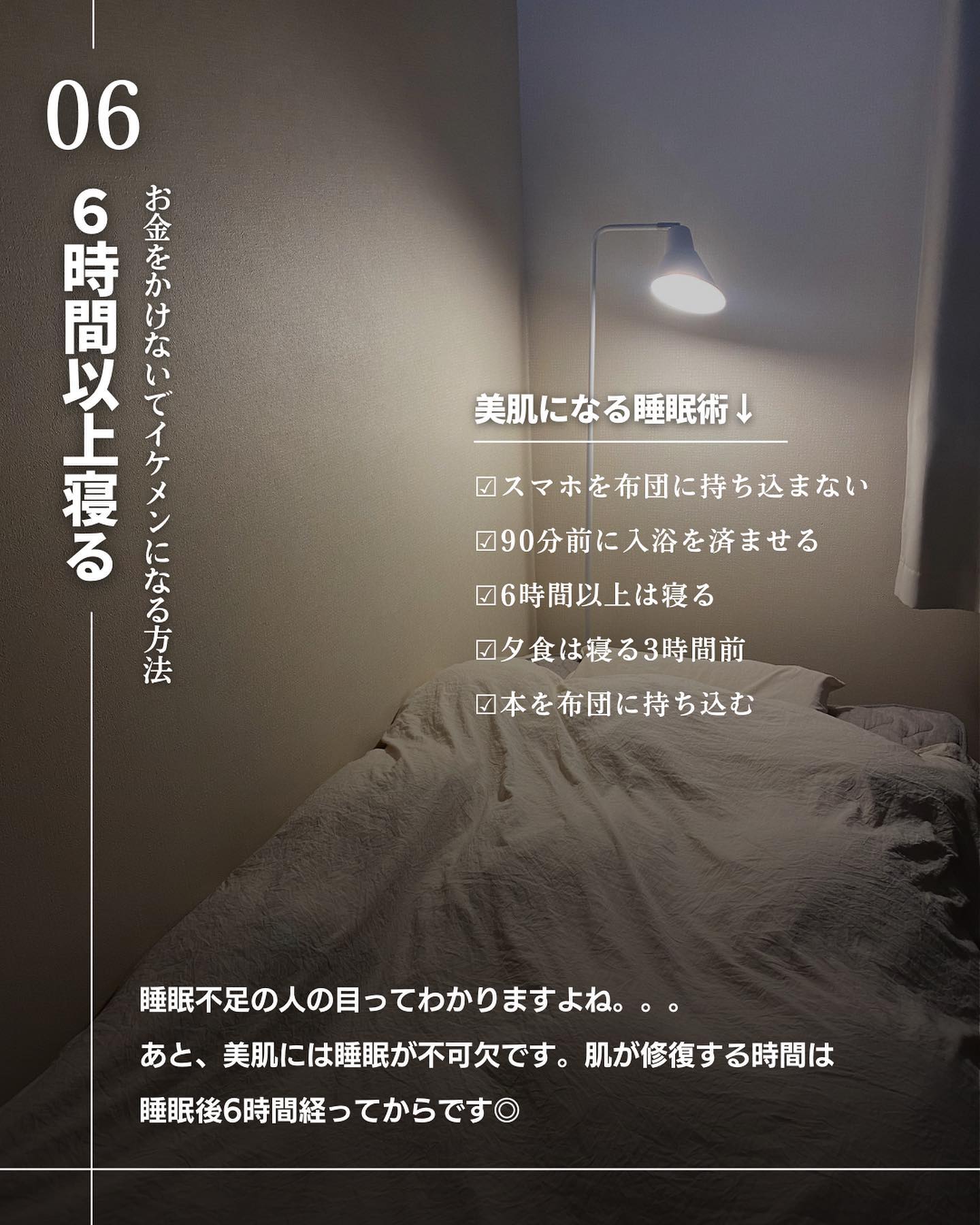 睡眠>食事>スキンケア 何が1番重要なのかというと「睡眠の質を上げること」 ①スマホを布団に持ち込まない ②90分前に入浴をすませる ③夕食は寝る3時間前 ④6時間以上寝る ⑤本を布団に持ち込む