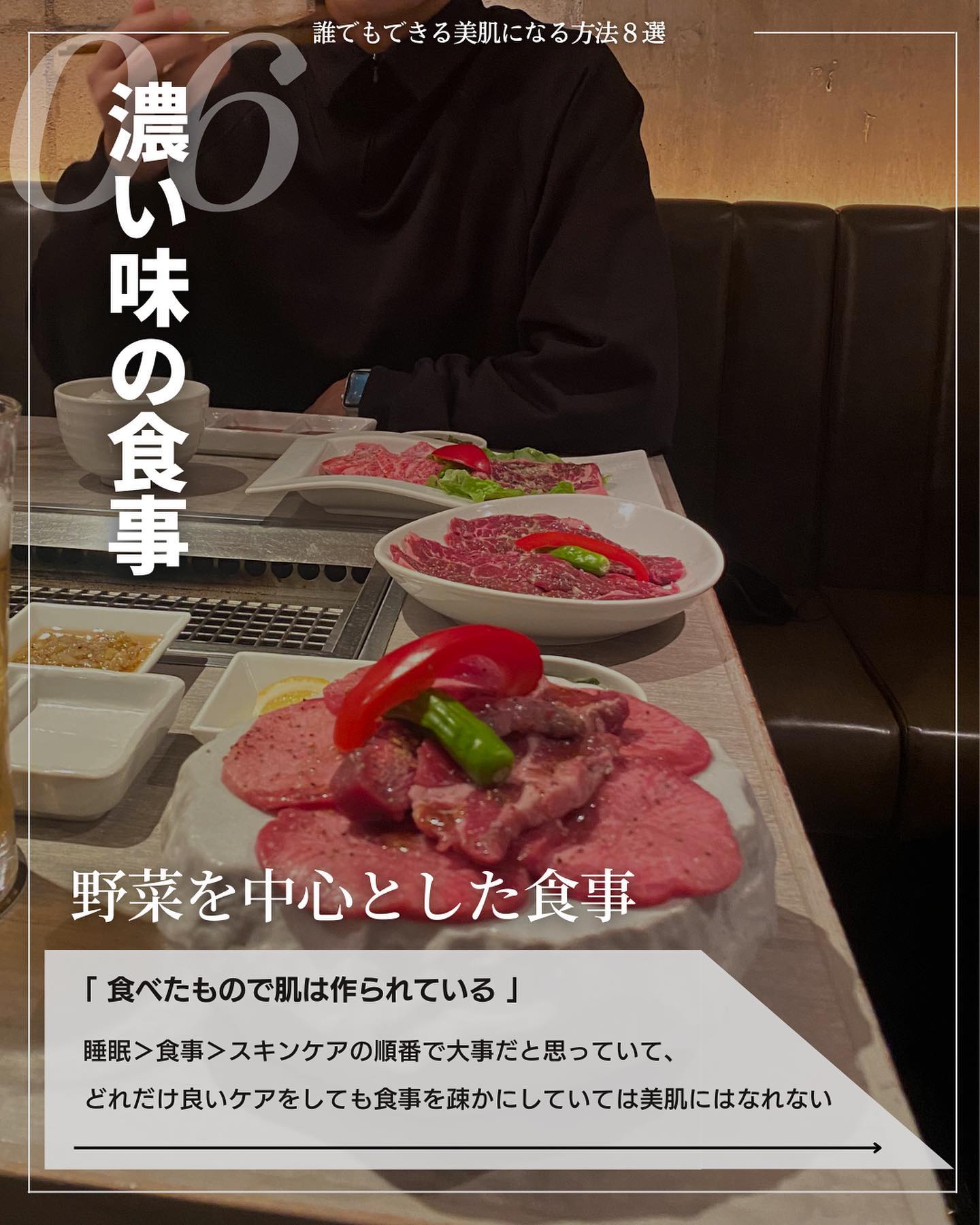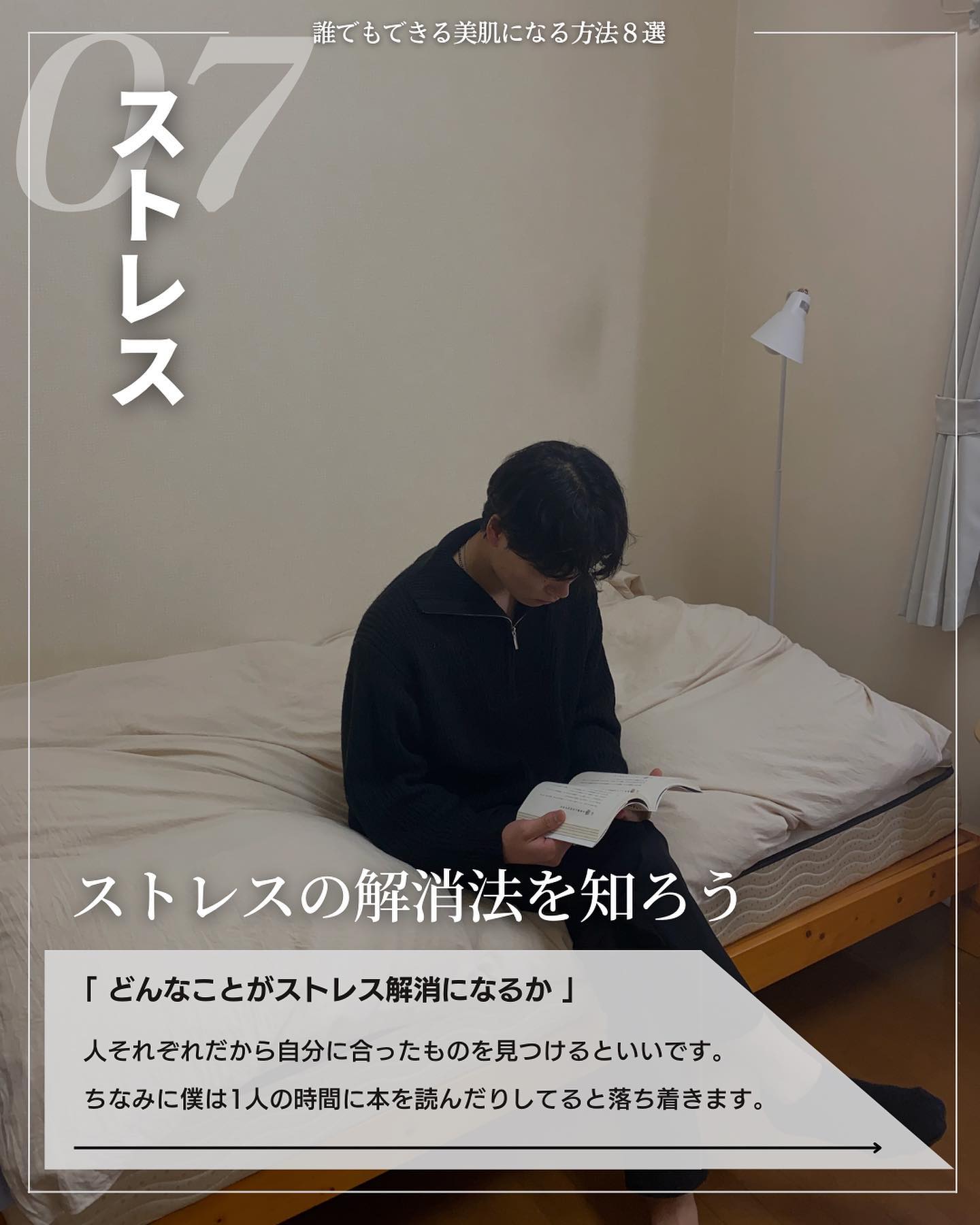 睡眠>食事>スキンケア 何が1番重要なのかというと「睡眠の質を上げること」 ①スマホを布団に持ち込まない ②90分前に入浴をすませる ③夕食は寝る3時間前 ④6時間以上寝る ⑤本を布団に持ち込む