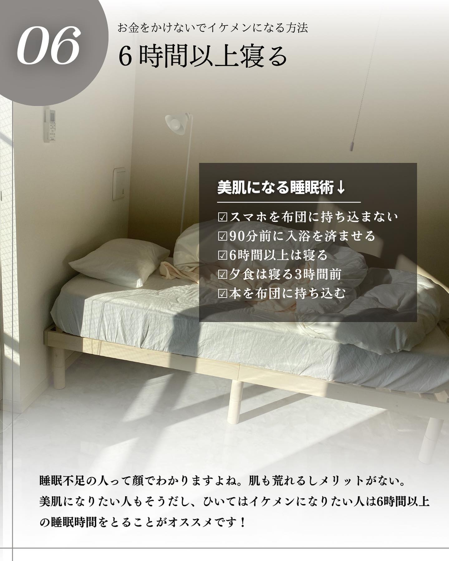 睡眠>食事>スキンケア 何が1番重要なのかというと「睡眠の質を上げること」 ①スマホを布団に持ち込まない ②90分前に入浴をすませる ③夕食は寝る3時間前 ④6時間以上寝る ⑤本を布団に持ち込む
