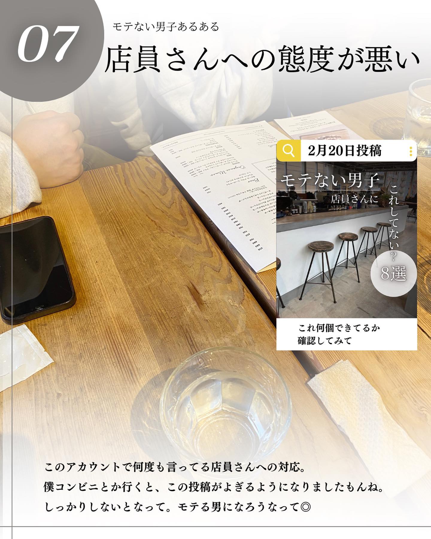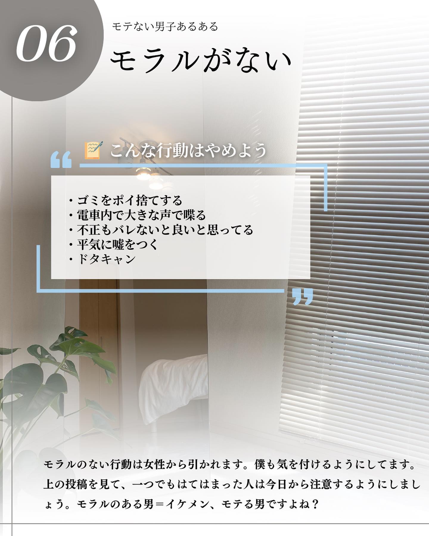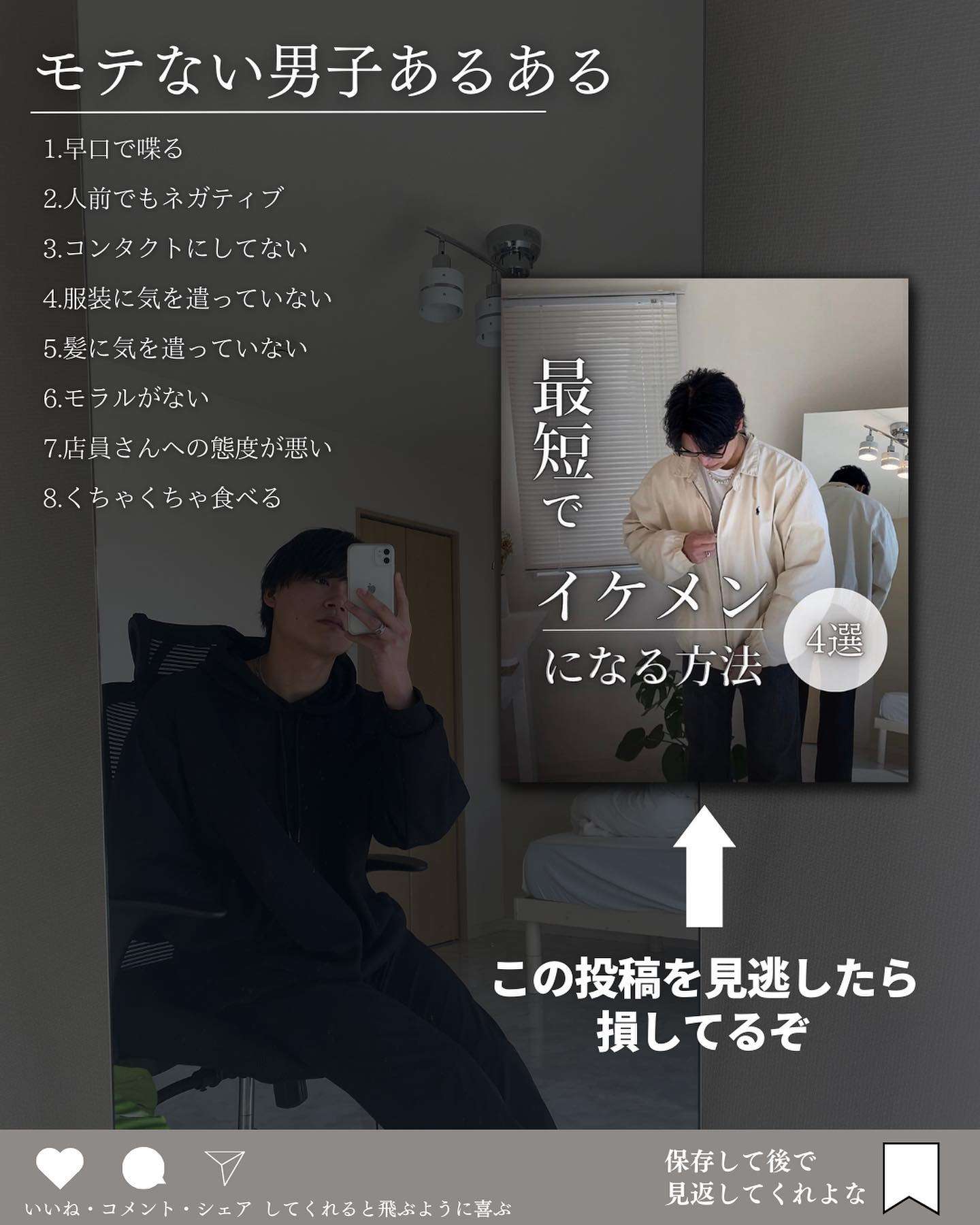 @kooki_mensskincare◀︎垢抜けたいメンズはこちらから ⁡ ✨モテない男子あるある✨ ⁡ 大人気投稿です! ⁡ 1.早口で喋る 2.人前でもネガティブ 3.コンタクトにしてない 4.服装に気を遣ってない 5.髪に気を遣ってない 6.モラルがない 7.店員さんへの態度が悪い 8.くちゃくちゃ食べる ⁡ @h_kooki_ ⁡ ☟モテ部屋を作ってます @kooki_room ⁡ ーーーーーーーーーーーーーーーーーーーーーーーーーー このアカウントは、スキンケアメインの自分磨き歴5年のこーきが「モテるためのメンズ美容情報」を紹介してます✨ ⁡ 現在も自分磨き頑張ってます🙌 ⁡ 一緒に自分磨き頑張りましょ😊 ーーーーーーーーーーーーーーーーーーーーーーーーーー ⁡ #メンズ美容 #メンズ垢抜け #垢抜け #垢抜ける方法 #イケメン #イケメンになりたい #メンズスキンケア #美容男子 #かっこよくなりたい ⁡ ⁡ ⁡