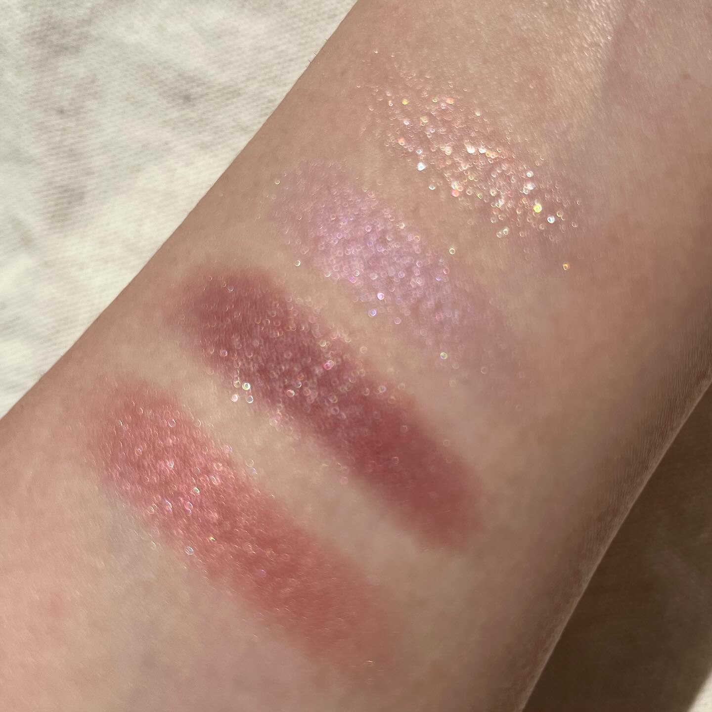 プライマーを使って、密度の高い感じのブラシで 左下ローズを置くように塗る。 ぼかすのは境目だけにして、しっかり色を出す。 右下のダークブラウンと思っていた濃い色は メイクしてみたら結構紫っぽく出たんですが これがまぁくすみ感が強くて…w くすみは何より苦手だよ😂😂 右上のラメはぺかっと光るのがとっても良い!!🤩 割とシンプルなメイクになるな~と思うけど しっかり色出せたので無事使っていけそうです💃🏼💓