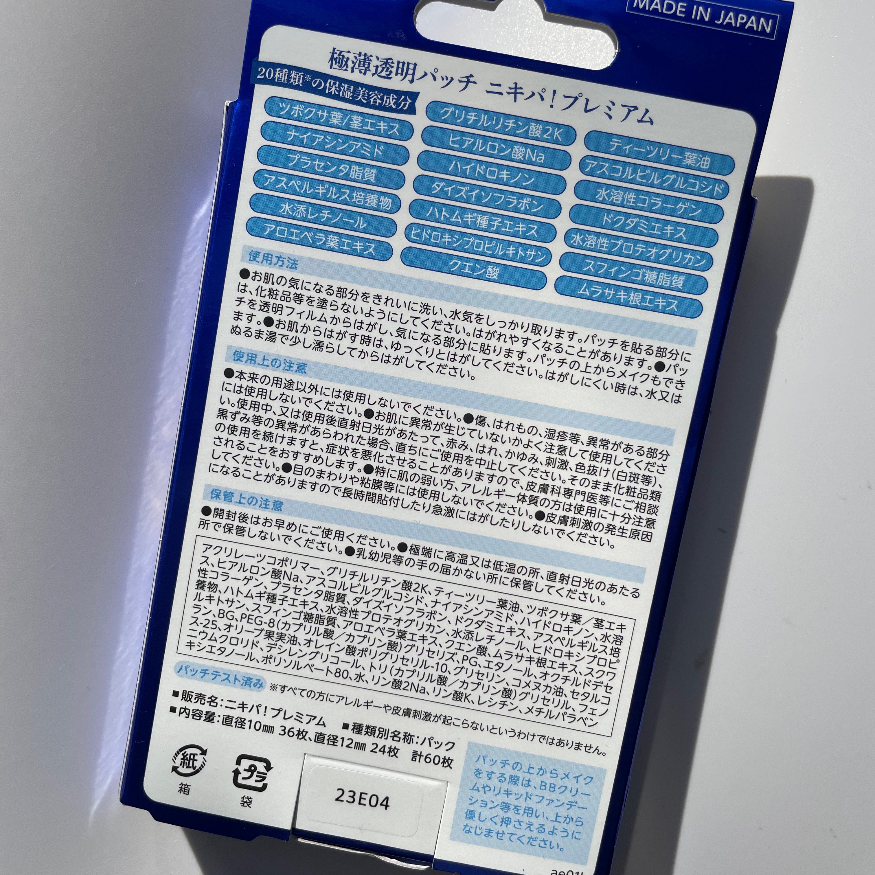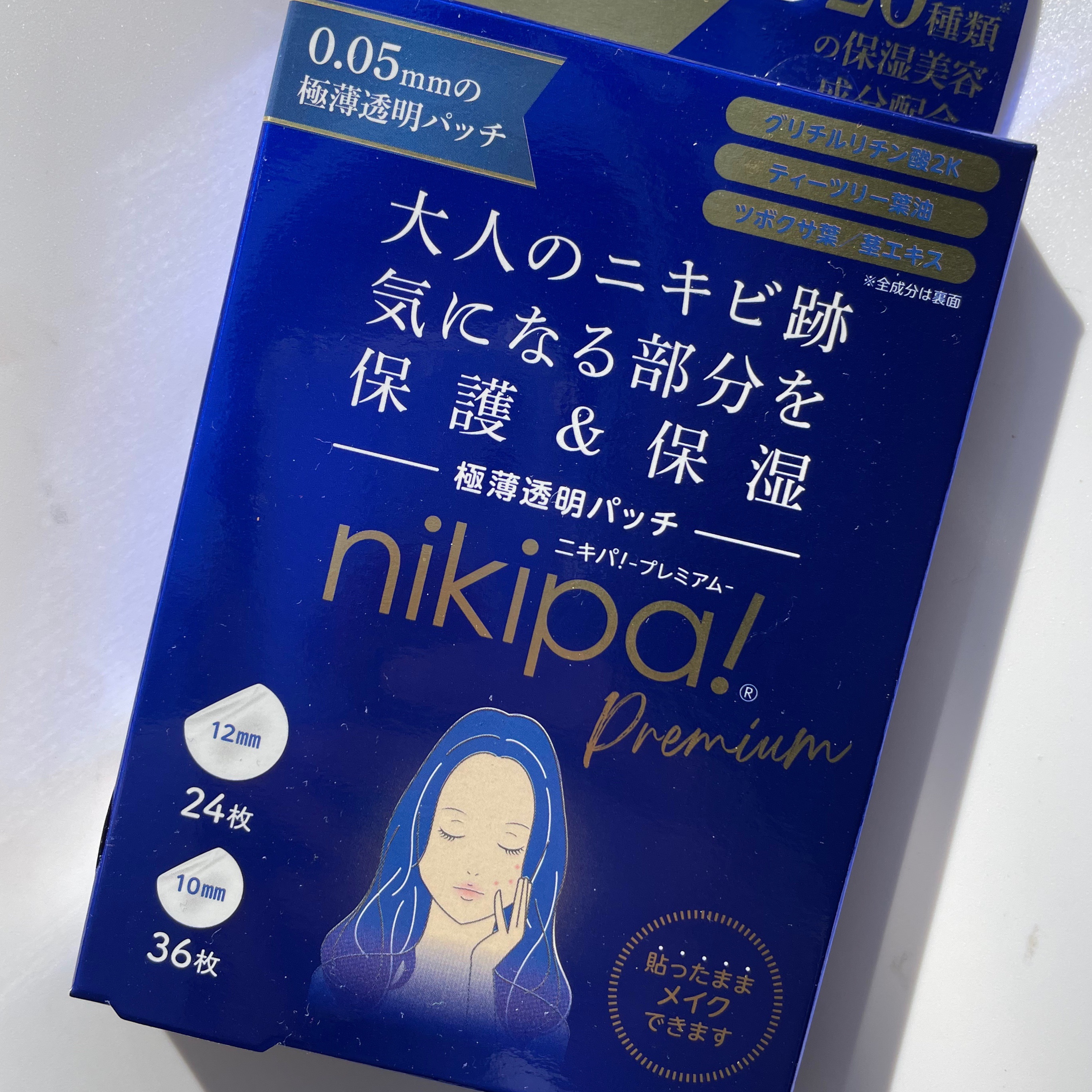 上からメイクできる、薄さ0.05mmの極薄透明パッチ「ニキパ!プレミアム」をご提供いただきました。たくさんの保湿美容成分が入っているので、気になる方は画像の箱裏をご覧ください。使い方は簡単。肌を清潔にした後しっかり水分を拭き取り、気になるとこ...