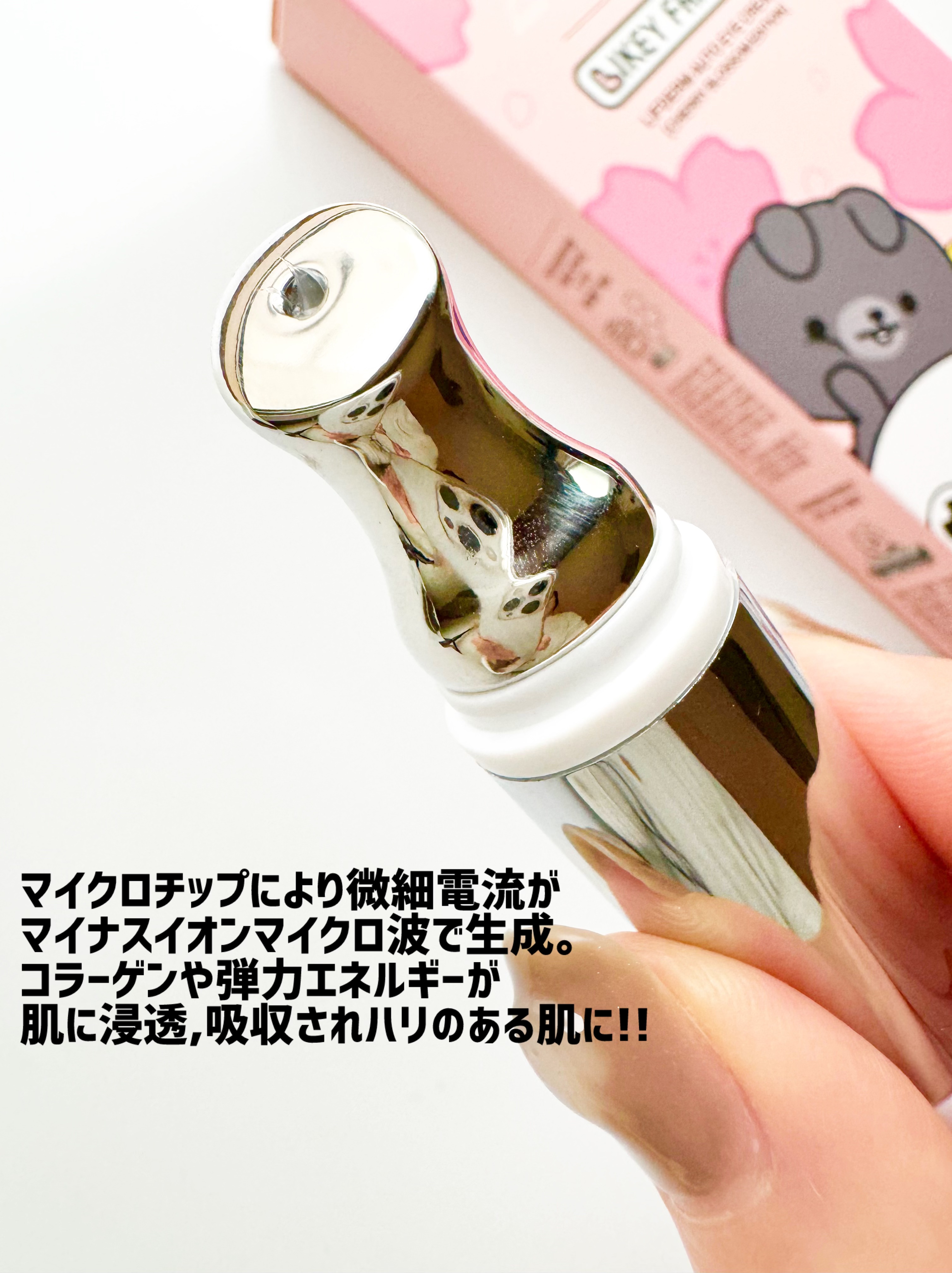 専用のアプリケーターをつけて、肌に触れるとやさしく振動🫨 振動も強くなくやさしい振動なので使いやすいです! テクスチャーはみずみずしい感じで密着感もよかった◎ 目元のシワ対策におすすめ✨ 気になる方はチェックしてみてね♡
