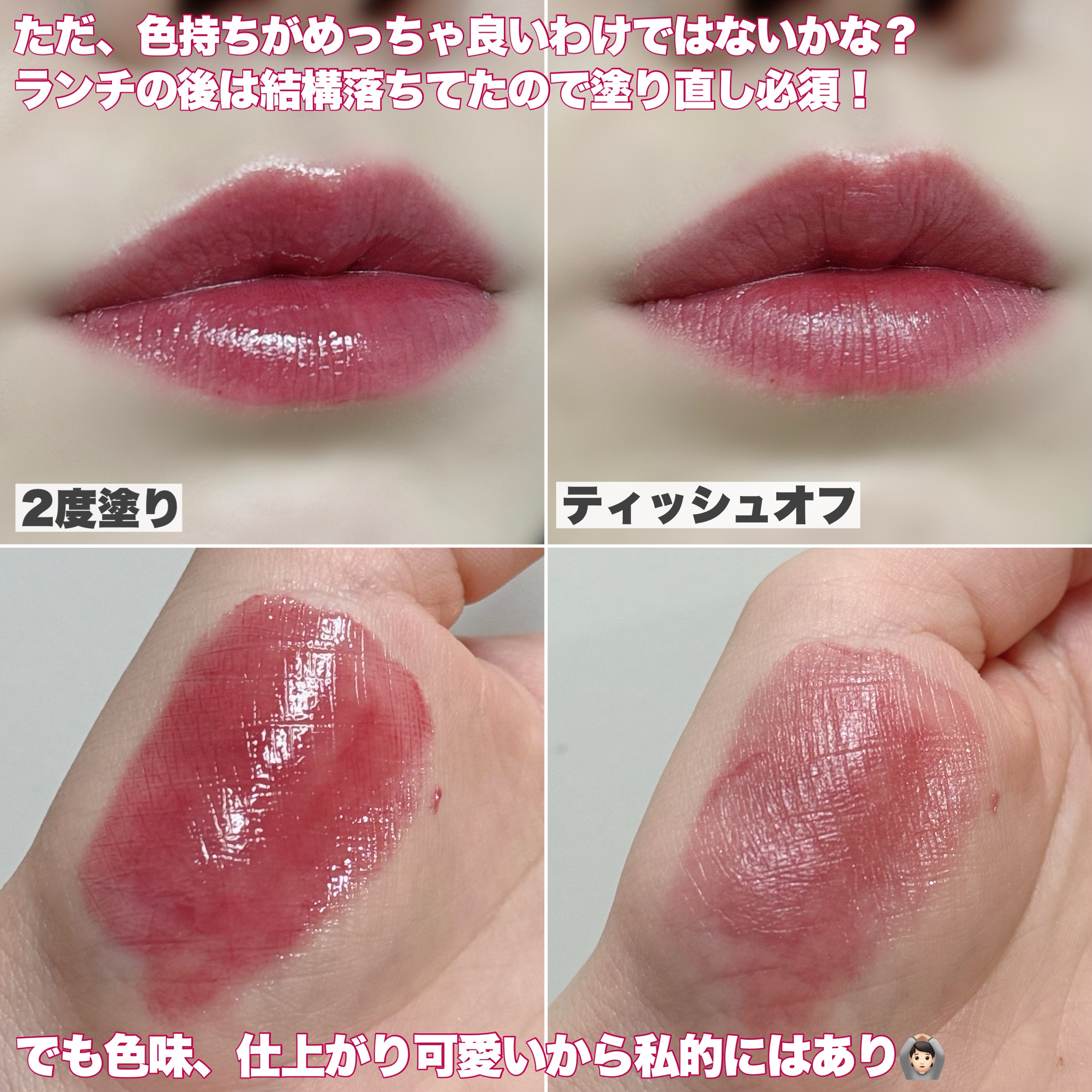 見た目は安定に可愛いし 持ってるだけでテンションあがる🤍 リップパック効果もあり 何と言ってもツヤも発色も凄い🌼 マスクうつりもしますし、持ちは良くないですが 手にスウォッチした際には少し残りました🌼 マスク生活が早く終わることを願って 1本買っておくのがオススメ🤍