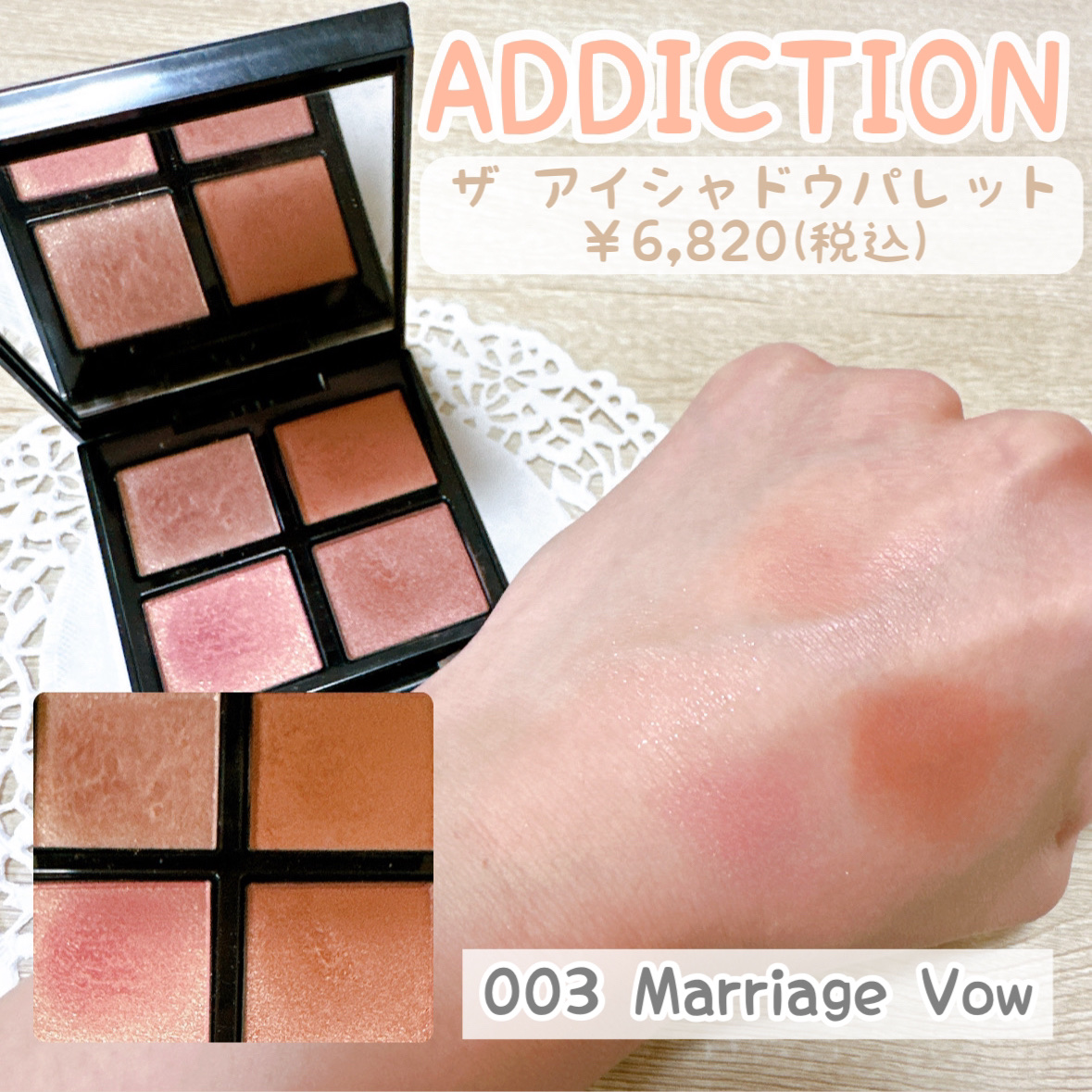 ADDICTIONアディクション ザアイシャドウパレット003MarriageVow久しぶりに使ったけどやっぱり可愛い🩷このパレットリニューアルして今は全く同じ色じゃないと思うけど似たような感じの色はあった!名前が同じMarriageVowだ...