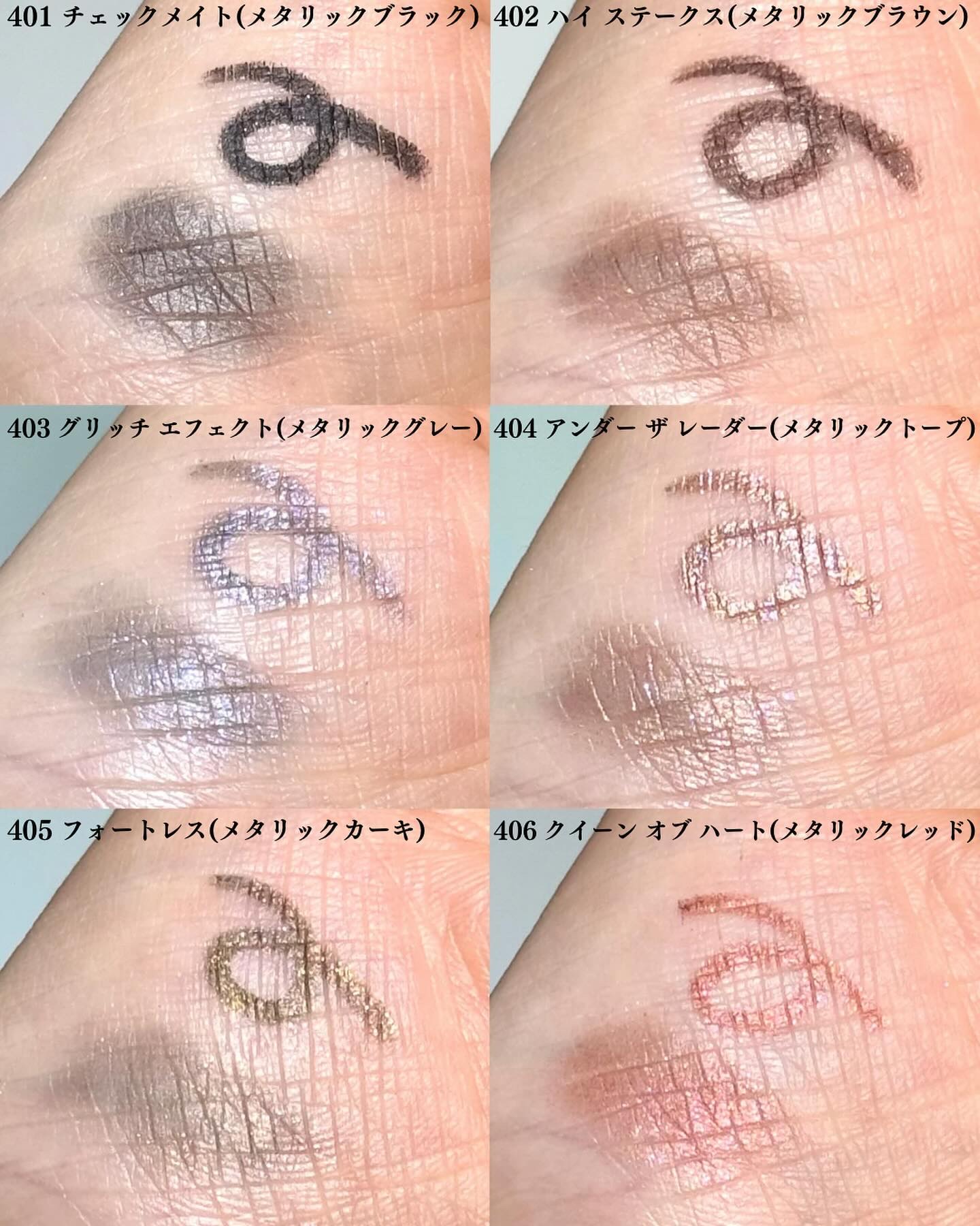 - <401 チェックメイト> ジメチコン、合成ワックス、シリカ、ステアリルジメチコン、トリ(カプリル酸/カプリン酸)グリセリル、(トリメチルシロキシケイ酸/ジメチコノール)クロスポリマー、オクタデセン、(ジメチコン/ビニルジメチコン)クロスポリマー、イソセテス-10、テトラ(ジ-t-ブチルヒドロキシヒドロケイヒ酸)ペンタエリスリチル [+/-] マイカ、コンジョウ、酸化鉄、酸化チタン <402 ハイ ステークス> ジメチコン、合成ワックス、シリカ、ステアリルジメチコン、トリ(カプリル酸/カプリン酸)グリセリル、(トリメチルシロキシケイ酸/ジメチコノール)クロスポリマー、オクタデセン、(ジメチコン/ビニルジメチコン)クロスポリマー、イソセテス-10、テトラ(ジ-t-ブチルヒドロキシヒドロケイヒ酸)ペンタエリスリチル [+/-] マイカ、コンジョウ、酸化鉄、酸化チタン <403 グリッチ エフェクト> ジメチコン、マイカ、合成ワックス、シリカ、酸化鉄、ステアリルジメチコン、トリ(カプリル酸/カプリン酸)グリセリル、ホウケイ酸(Ca/Na)、酸化チタン、(トリメチルシロキシケイ酸/ジメチコノール)クロスポリマー、(ジイソステアリン酸/ポリヒドロキシステアリン酸/セバシン酸)ポリグリセリル-4、オクタデセン、(ジメチコン/ビニルジメチコン)クロスポリマー、テトラ(ジ-t-ブチルヒドロキシヒドロケイヒ酸)ペンタエリスリチル、コンジョウ、酸化スズ、イソセテス-10 <404 アンダー ザ レーダー> ジメチコン、合成ワックス、シリカ、ステアリルジメチコン、トリ(カプリル酸/カプリン酸)グリセリル、(トリメチルシロキシケイ酸/ジメチコノール)クロスポリマー、(ジイソステアリン酸/ポリヒドロキシステアリン酸/セバシン酸)ポリグリセリル-4、オクタデセン、(ジメチコン/ビニルジメチコン)クロスポリマー、イソセテス-10、テトラ(ジ-t-ブチルヒドロキシヒドロケイヒ酸)ペンタエリスリチル [+/-] マイカ、Al、青銅、銅、酸化鉄、酸化チタン <407 ジャックポット> ジメチコン、マイカ、合成ワックス、シリカ、ステアリルジメチコン、トリ(カプリル酸/カプリン酸)グリセリル、(トリメチルシロキシケイ酸/ジメチコノール)クロスポリマー、オクタデセン、(ジメチコン/ビニルジメチコン)クロスポリマー、イソセテス-10、テトラ(ジ-t-ブチルヒドロキシヒドロケイヒ酸)ペンタエリスリチル [+/-] 酸化鉄、酸化チタン <408 ハイ スコア> ジメチコン、マイカ、合成ワックス、シリカ、ステアリルジメチコン、トリ(カプリル酸/カプリン酸)グリセリル、(トリメチルシロキシケイ酸/ジメチコノール)クロスポリマー、オクタデセン、(ジメチコン/ビニルジメチコン)クロスポリマー、イソセテス-10、テトラ(ジ-t-ブチルヒドロキシヒドロケイヒ酸)ペンタエリスリチル [+/-] 酸化鉄、酸化チタン <405 フォートレス> ジメチコン、合成ワックス、シリカ、ステアリルジメチコン、トリ(カプリル酸/カプリン酸)グリセリル、(トリメチルシロキシケイ酸/ジメチコノール)クロスポリマー、(ジイソステアリン酸/ポリヒドロキシステアリン酸/セバシン酸)ポリグリセリル-4、オクタデセン、(ジメチコン/ビニルジメチコン)クロスポリマー、イソセテス-10、テトラ(ジ-t-ブチルヒドロキシヒドロケイヒ酸)ペンタエリスリチル [+/-] マイカ、Al、青銅、銅、酸化鉄、酸化チタン <406 クイーン オブ ハート> ジメチコン、合成ワックス、酸化鉄、合成フルオロフロゴパイト、シリカ、ステアリルジメチコン、トリ(カプリル酸/カプリン酸)グリセリル、(トリメチルシロキシケイ酸/ジメチコノール)クロスポリマー、マイカ、青銅、オクタデセン、(ジメチコン/ビニルジメチコン)クロスポリマー、テトラ(ジ-t-ブチルヒドロキシヒドロケイヒ酸)ペンタエリスリチル、酸化チタン、酸化スズ、イソセテス-10