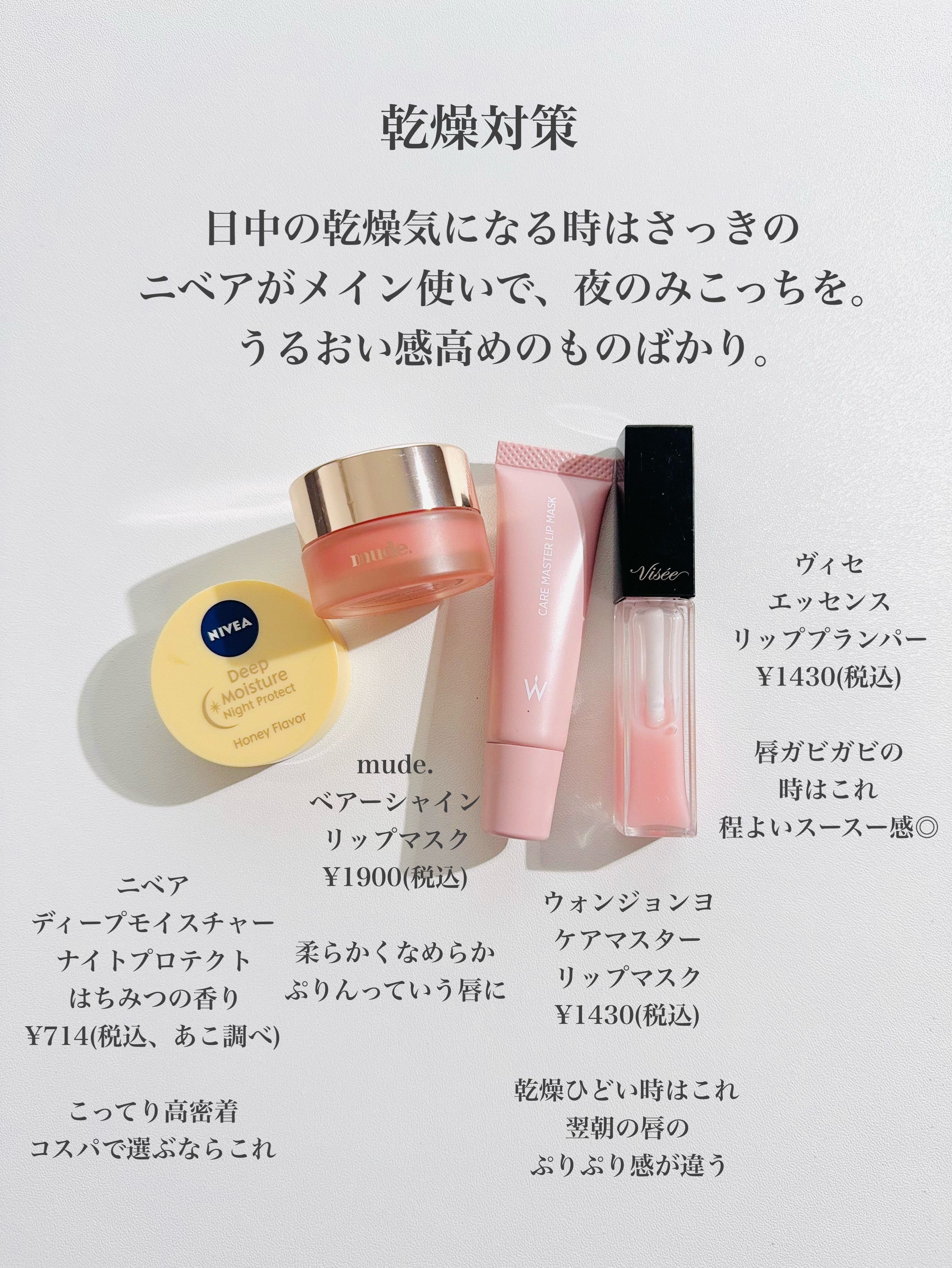 すっぴんの時でも唇にツヤがあると血色が良く見えるので、ちょっとしたときにでも👍 Viséeは重ね塗りで色つきリップと組み合わせるのも好きです!! ベビーワセリンリップは価格が安価で、無色なので使いやすく、唇以外でもワセリンとして使用できます!