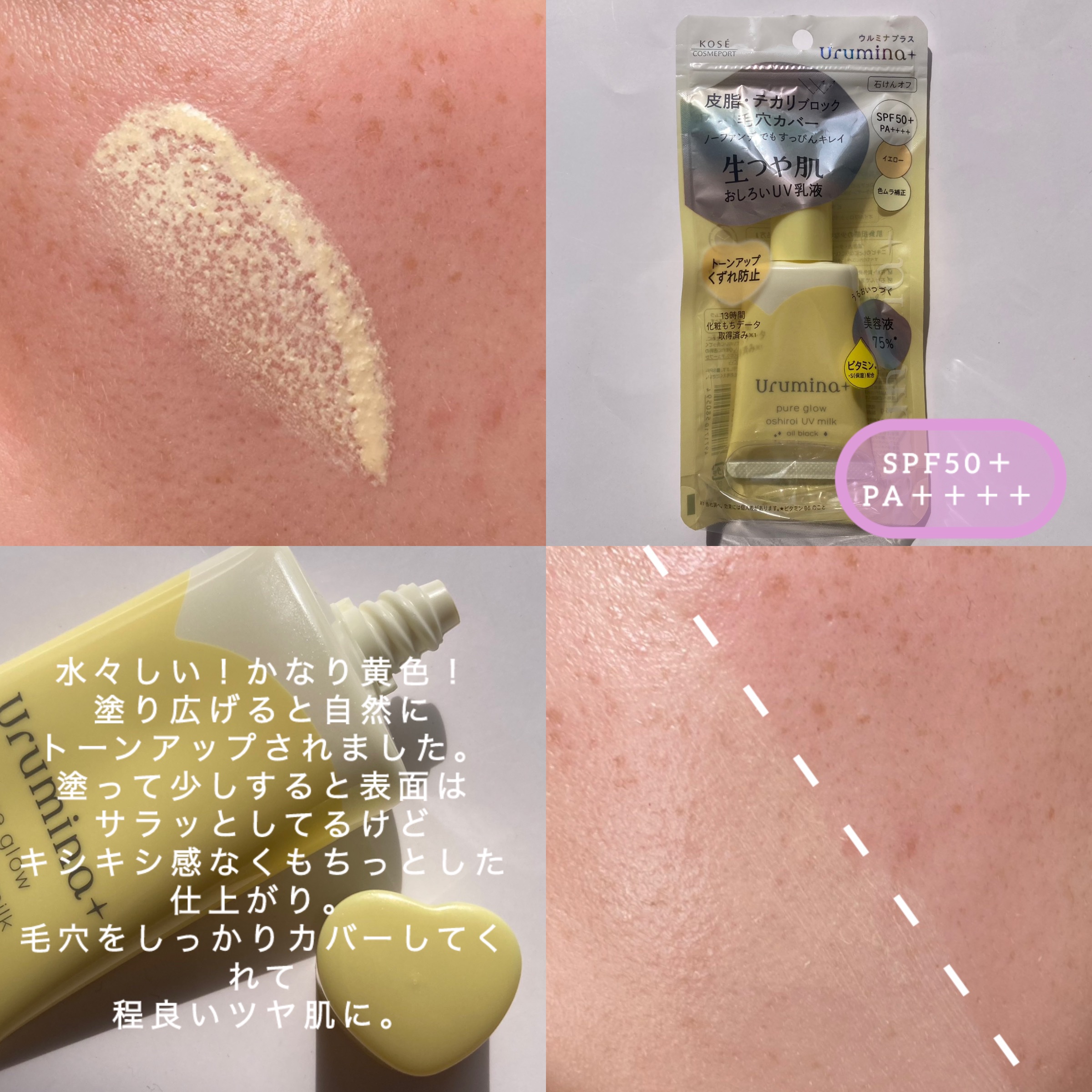 オイルブロックパウダー&うるさらキープパウダー配合で、皮脂・テカリをブロックしながら毛穴をカバーしてメイクしたてのうるさら肌を1日中キープする、みずみずしいスキンケアタッチのおしろい乳液。 トーンアップ&色ムラ補正効果のあるイエローカラー。爽やかなクリアフローラルの香り。 ツヤ感は程々に出て良いのですが、塗った方が汚くなる物は使えないのでボディ行きです🥲