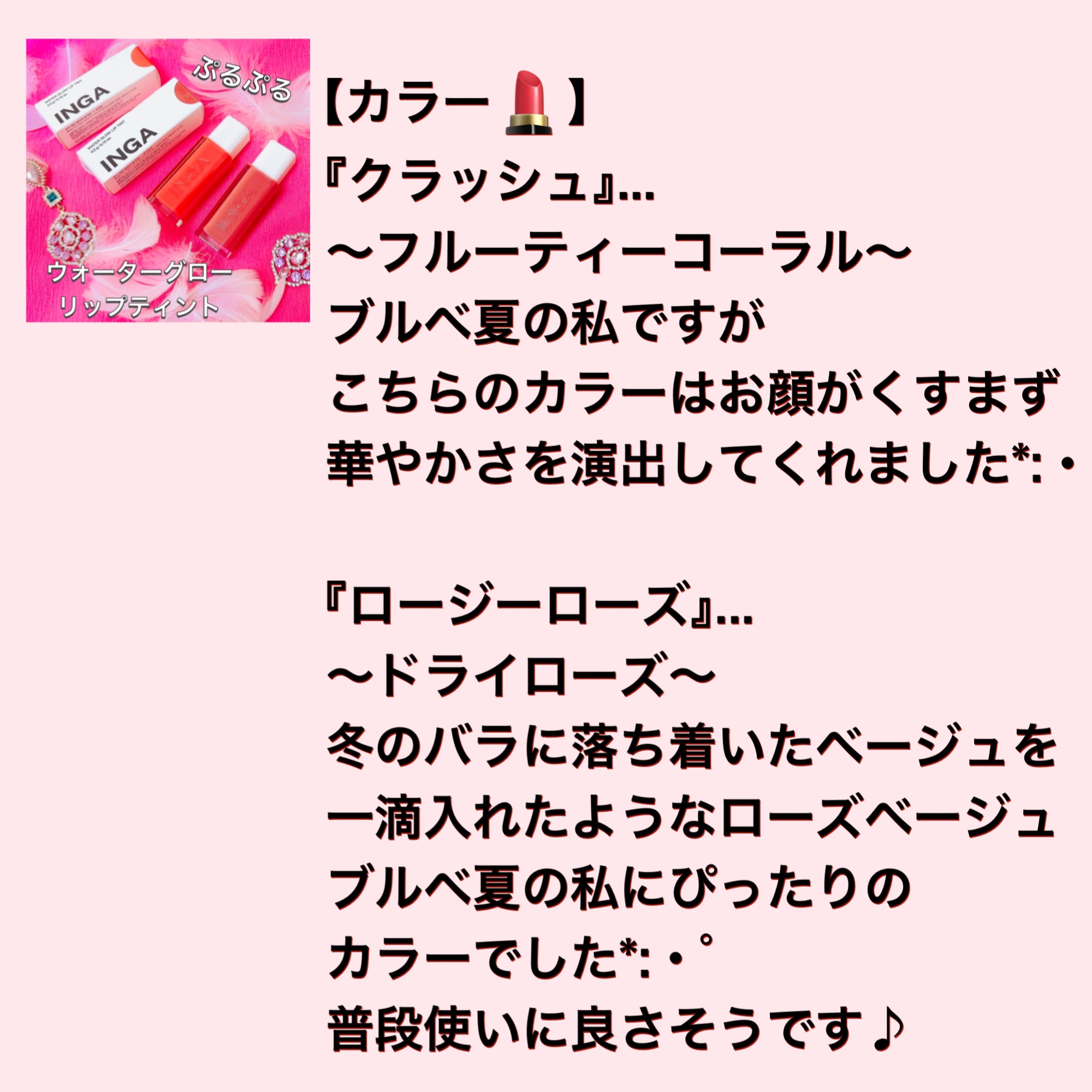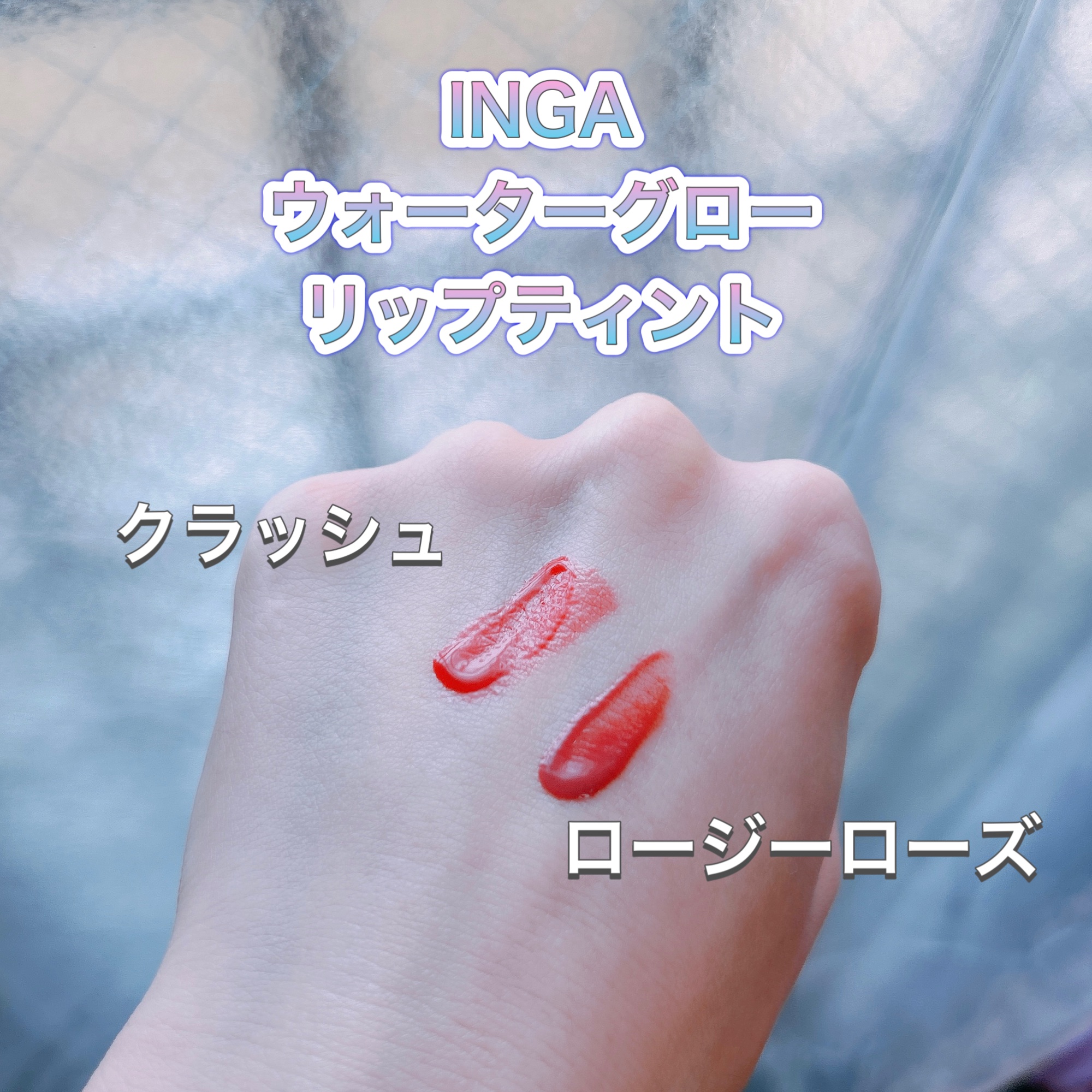 INGAインガWATERGLOWLIPTINTROSYROSEティント仕様で色残りも🙆♀️⭕️カラーも豊富だよ☺️❤️つやつやでティントだけど私は荒れなかったよ🙋♀️食べたりするとツヤはなくなっちゃうけど😅色味は意外と残る...