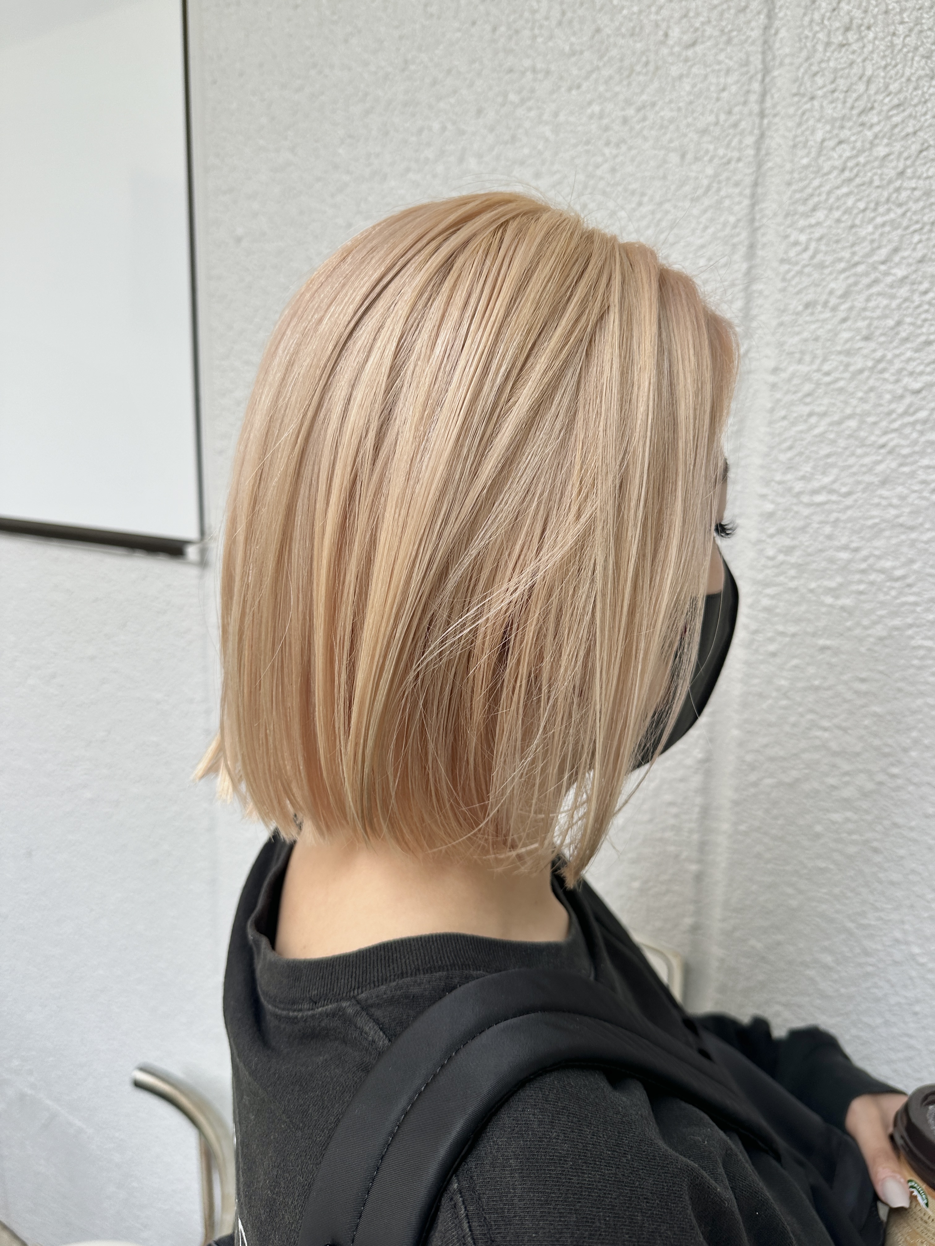 ブリーチで切れてしまって形がなくなってしまった髪型 表面の切れ毛を出来るだけ隠すようにボブスタイルをご提案 丸みを出すようにカット ラインを綺麗に出すカットで首がすらっと見えるデザインに 日本風の柔らかいボブに変身です