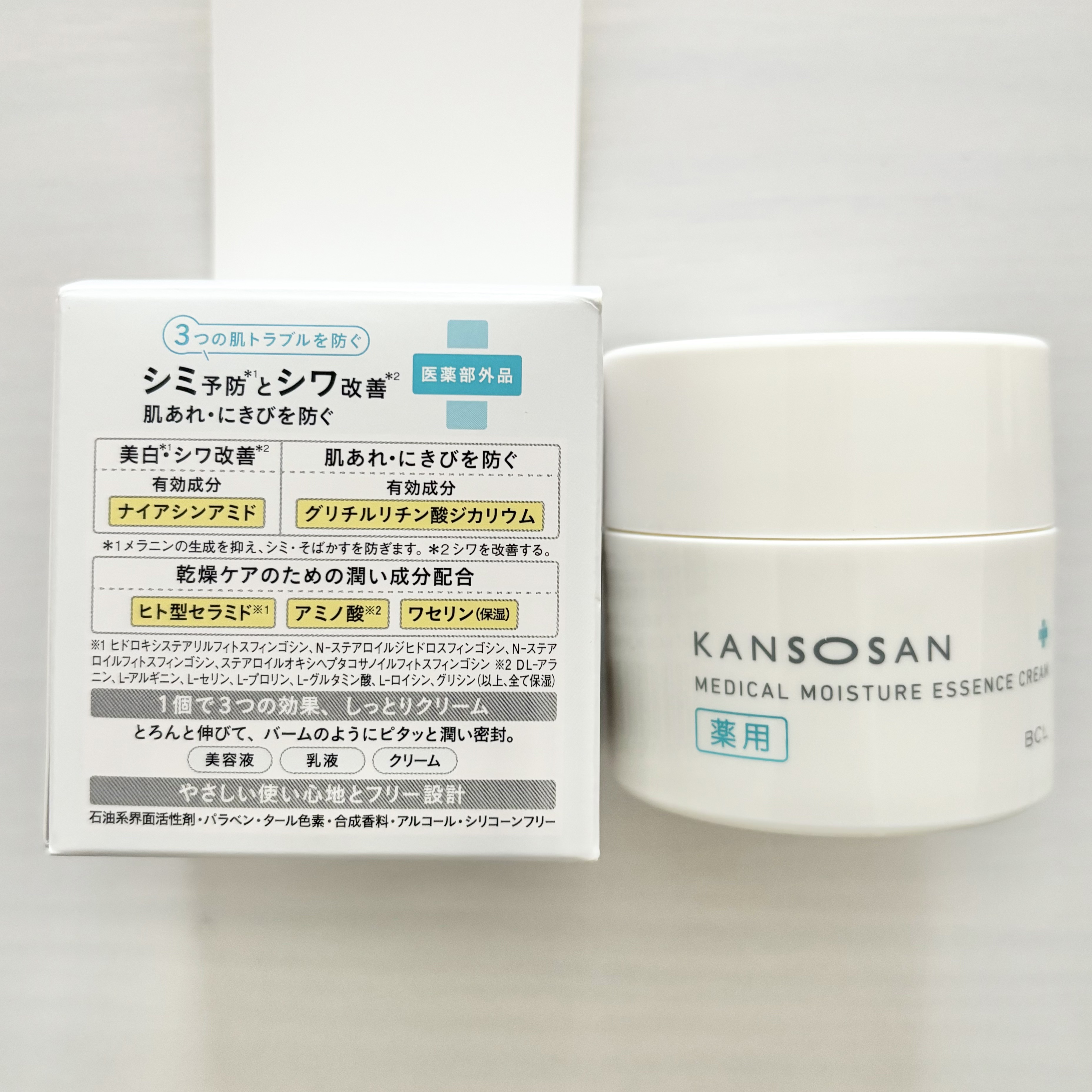- 【医薬部外品】 乾燥肌さんのための 保湿力3in1クリーム 3つの肌トラブルを防ぐ シミ予防*1とシワ改善*2肌あれ・にきびを防ぐ 【美白*1・シワ改善*2有効成分】 ナイアシンアミド 【肌あれ・にきびを防ぐ有効成分】 グリチルリチン酸ジカリウム *1メラニンの生成を抑え、シミ・そばかすを防ぎます。*2 シワを改善する。 【乾燥ケアのための潤い成分配合】 ヒト型セラミド※1/アミノ酸※2/ワセリン(保湿) ※1 ヒドロキシステアリルフィトスフィンゴシン、N–ステアロイルジヒドロスフィンゴシン、N–ステアロイルフィトスフィンゴシン、ステアロイルオキシヘプタコサノイルフィトスフィンゴシン ※2 DL–アラニン、L–アルギニン、L–セリン、L–プロリン、L–グルタミン酸、L–ロイシン、グリシン(以上、全て保湿) 【1個で3つの効果、しっとりクリーム】 とろんと伸びて、バームのようにピタッと潤い密封。 美容液/乳液/クリーム 【やさしい使い心地とフリー設計】 石油系界面活性剤・パラベン・タール色素・合成香料・アルコール・シリコーンフリー 2023年8月22日 PLAZA/LOFT/EC順次先行発売