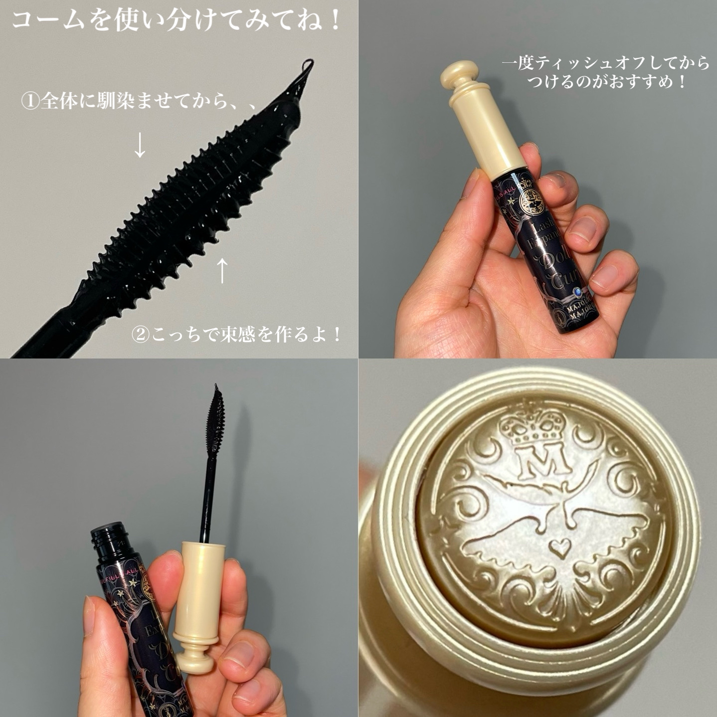- お人形のようにくりんと上向きカール。きゅるんとぱっちり、つやめく束感ロングが長時間続くマスカラ ○なめらかにまつ毛をのばし、束感をつくりやすくします。 ―繊維フリー ―スムースマグネット液 ―ラッシュフィット成分配合 ○汗・皮脂・涙に強い!1日中にじまず、くりんとした上向きカールを長時間キープ ―ウォータープルーフ ―ドーリーカール記憶処方 ○まつ毛を際立てる濡れつや質感 ○お湯と洗顔料でするんとオフ ○大事なまつ毛をケアするトリートメント成分配合 12時間仕上がり持続(カール・ロング・にじみのなさ)データ取得済み(当社調べ。効果には個人差があります。) 【色調】 きゅるんとぱっちりした目もとを叶えるクリアなつや質感 【きゅるんとぱっちり!束感ロングまつ毛のつくり方】 ①ツンとした毛先のロングまつ毛をつくる 目の細かいロングコームで、まつ毛の根もとから毛先まですーっと上に向かってとかしあげます。 ②美しい束感をつくる 目の粗い束感コームを根もとにあて、そのまま軽く左右にジグザグさせると、束感ロングまつ毛がたちまち完成。