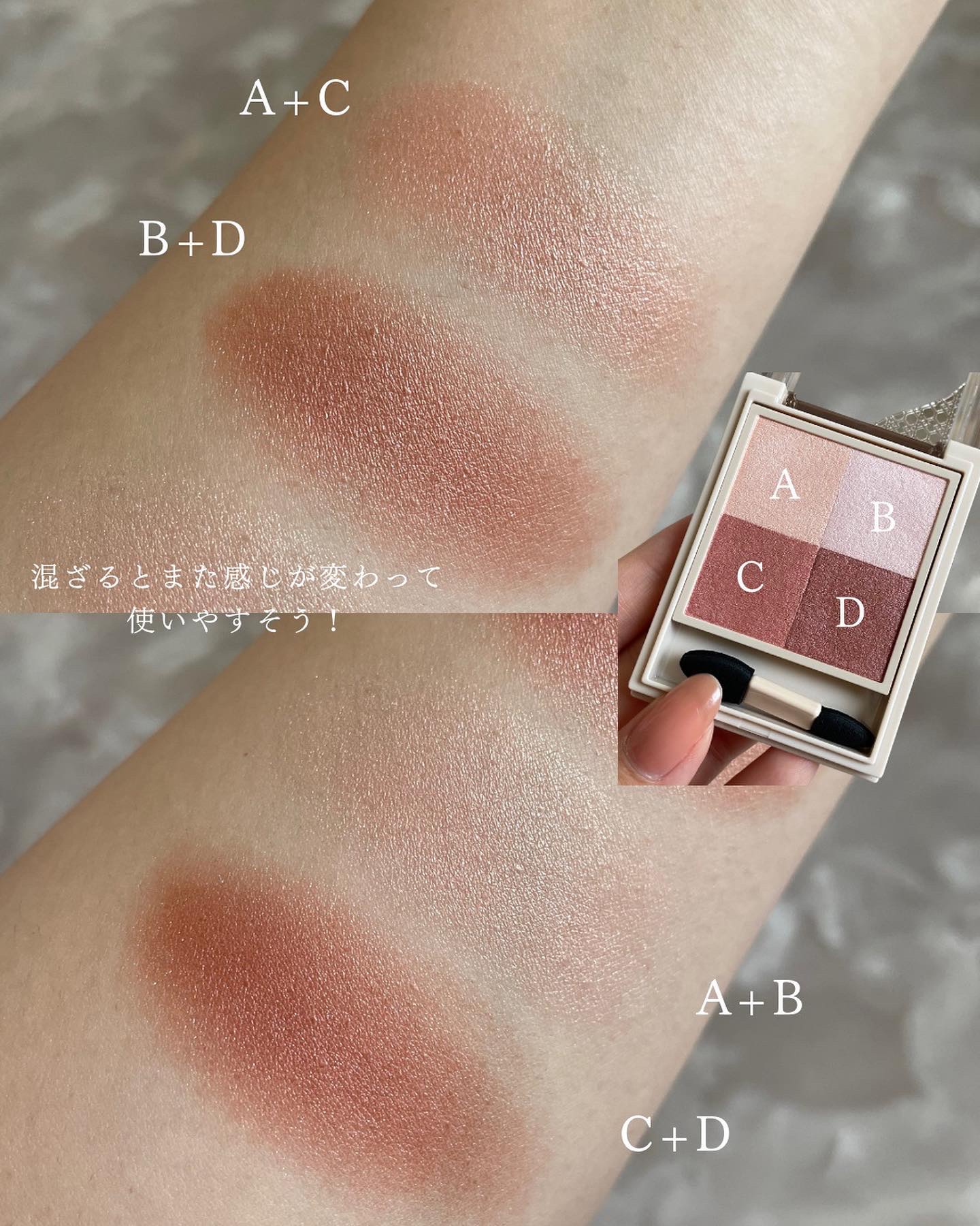- ● しっとりほぐれるようなタッチで密着し、上品なツヤめきと透け感発色で目もとを彩る 4 色セットアイカラーです。 やさしいトーンの色味と繊細な輝きで、どこか儚げでアンニュイな印象に導きます。 ● レフ板のように光を美しく反射させるライトリフレクションパウダーを配合。 どの角度から見ても、繊細な輝きと濡れたようなツヤを演出します。 ● 透け感があり、軽いタッチでのび広がるクリアパウダーを配合。 色味を重ねても濁りのない透け感発色を叶えます。 ● とてもキメ細かなパウダーに厳選したオイルを組み合わせることで、しっとりなめらかなほぐれ感を実現。 薄膜にのび広がり、まぶたへ溶け込むように密着します。 ● スルスルとした軽い感触のオイルを配合。摩擦抵抗を減らすことで、まばたきや表情の変化によるヨレを防ぎます。 汗や皮脂にもくすみにくいため、時間が経ってもつけたての美しい発色が持続します。 ● まぶたに明るさをあたえ、後から重ねるアイカラーを美しく発色させる「スキンブライトカラー」(A)をセット。 光を味方につけてまぶたのくすみを飛ばし、明るくツヤめく目もとを叶えます。 ● 色ごとに仕切りがないため、1 色ずつはもちろん、パレット内で色を混ぜて塗布することもできます。 ● 美容液成分配合。乾燥しやすい目もとのうるおいをまもります。 ● 無香料