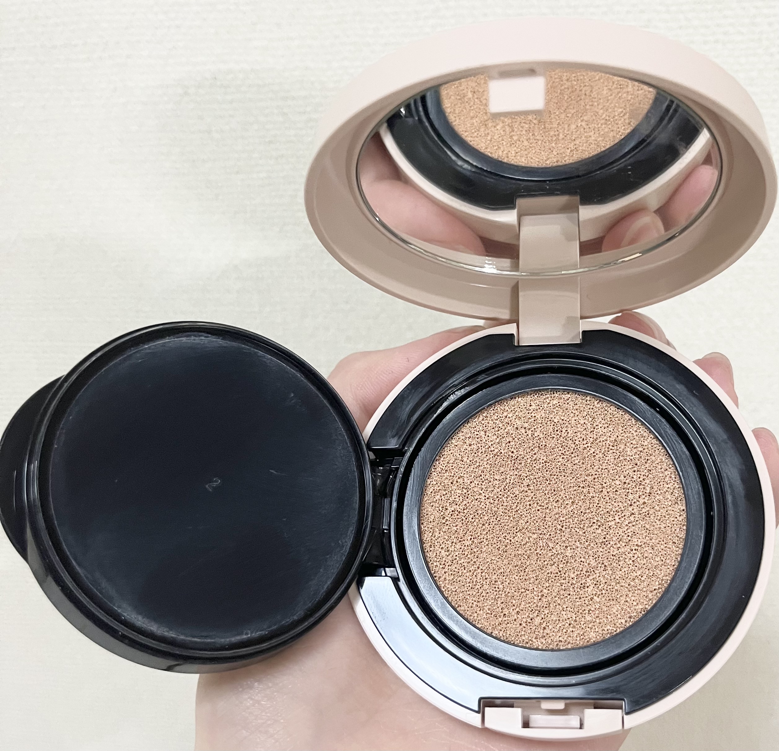 蓋を開けてパフ置きを開けるとクッションファンデが目に入りました。今まで使ってきた韓国系のクッションファンデはクッションが乾かないようになのか必ずパフ置きを開けた時に保護テープがあったので少しびっくりしました。 パフにファンデを付けてお肌にのせたのですが、伸びが悪い?なんというかすぐ乾くような感じで確かに薄付きで綺麗なんですが、今までのクッションファンデと違くて困惑😧 そんなに艶っぽさもなく乾燥が気になるかも💦 私の肌は冬場は結構乾燥してしまうのでコレは夏場に使いたいと思います♪